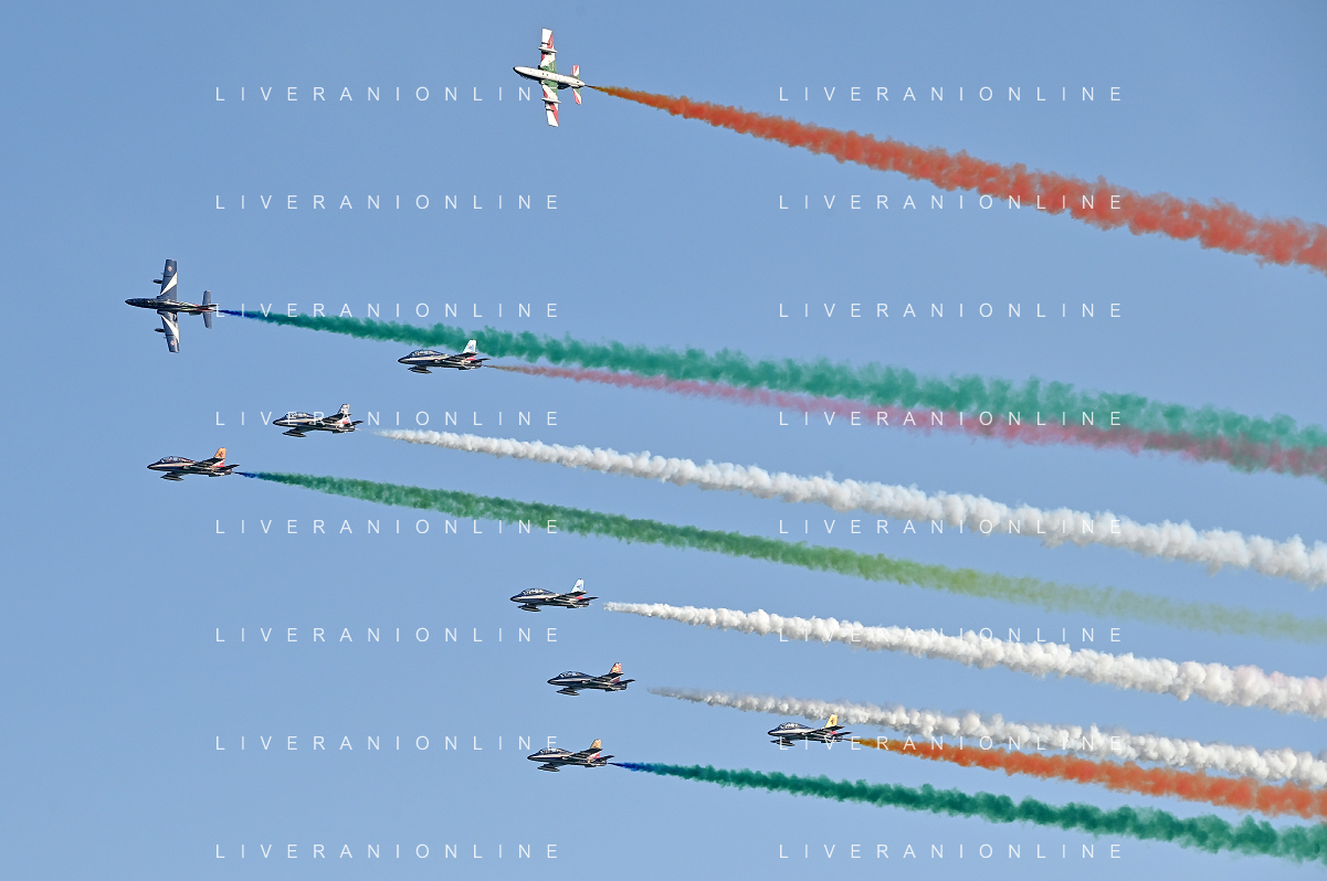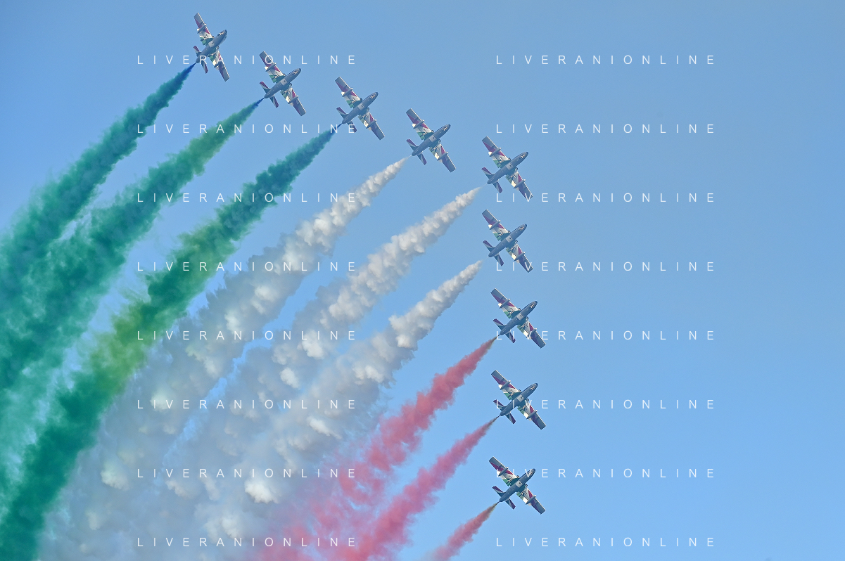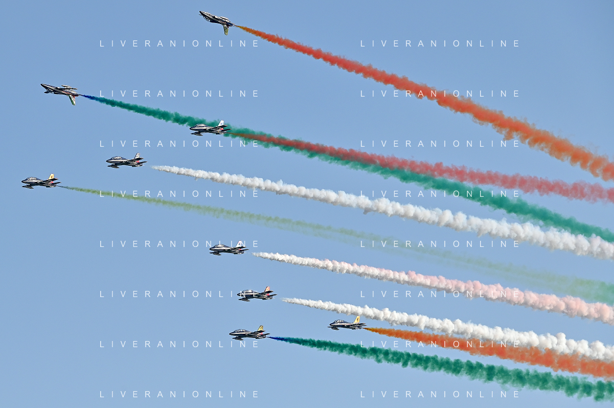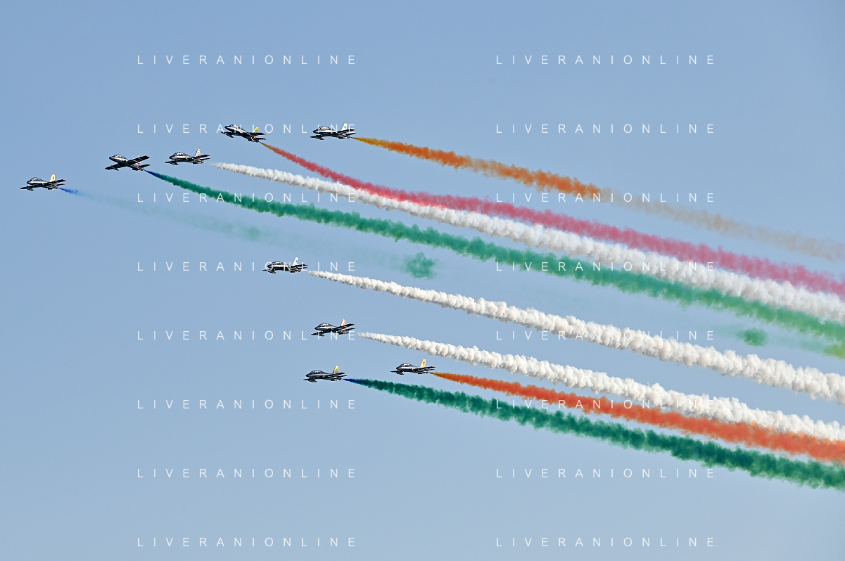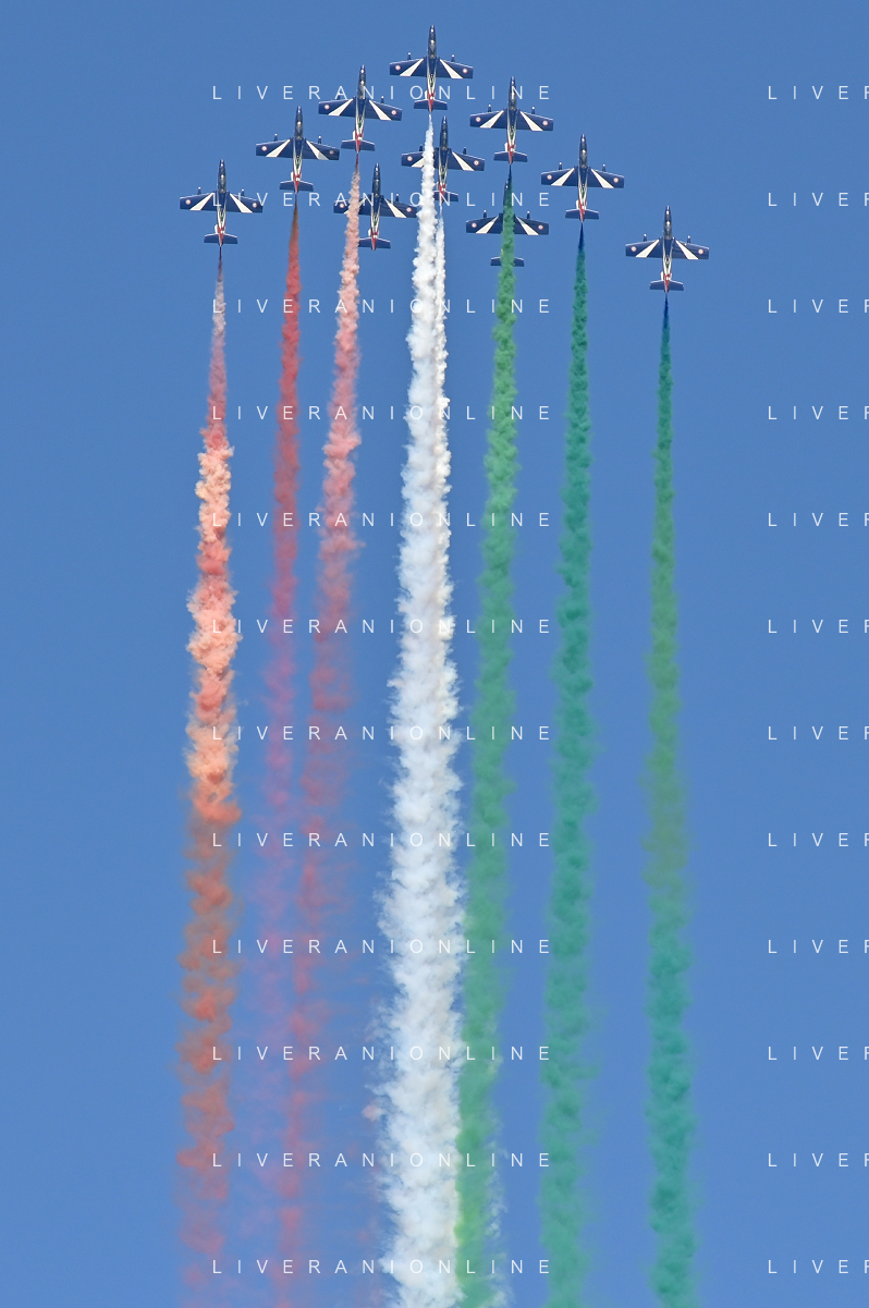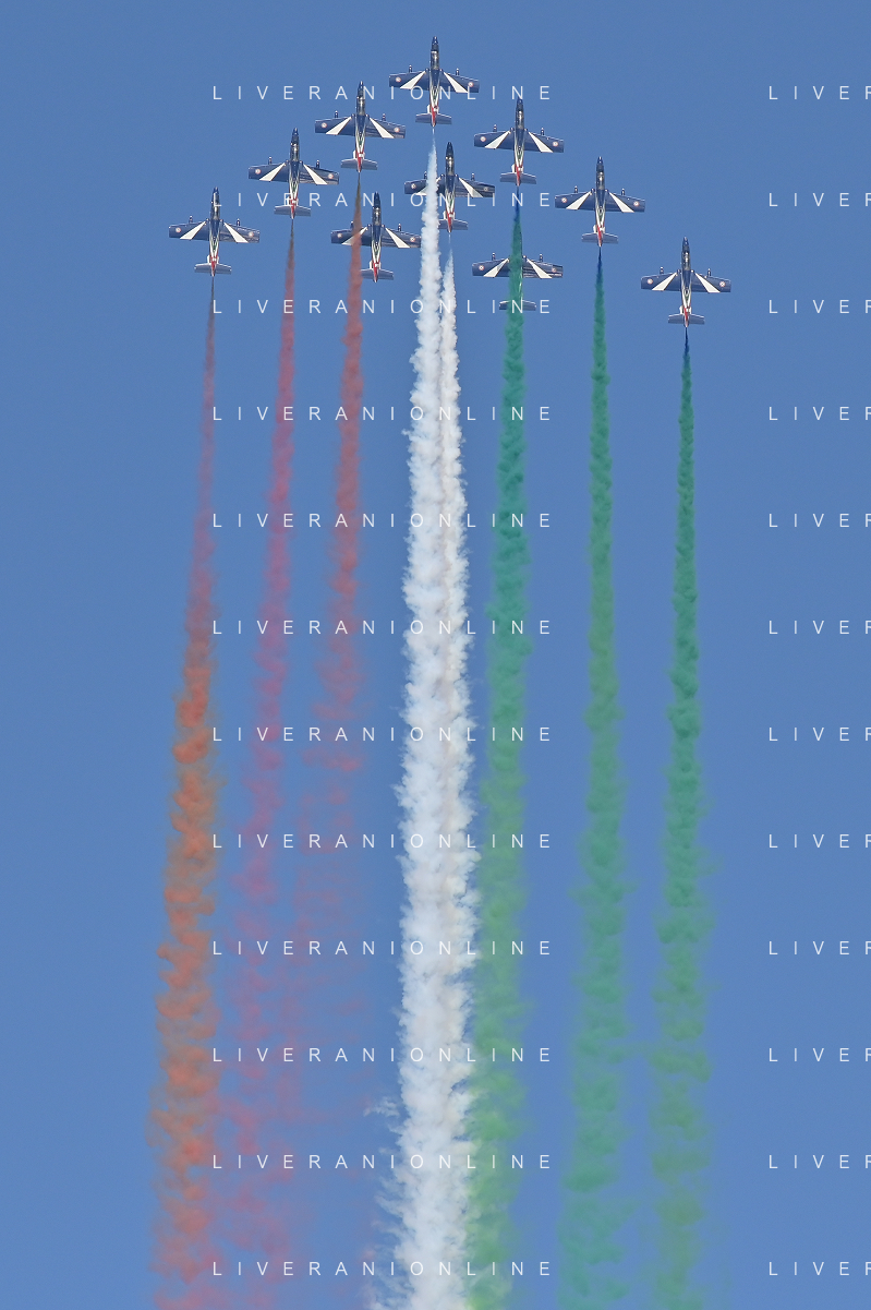 20-8-2023. Esibizione Aerei Frecce Tricolore Italia, presso lungomare Poetto di Cagliari, in occssione 100 anni Aeronautica Militare Italiana. Foto Salvatore Moi/Agenzia Aldo Liverani s.a.s. Nella foto: Aerei Frecce Tricolore Italia.
