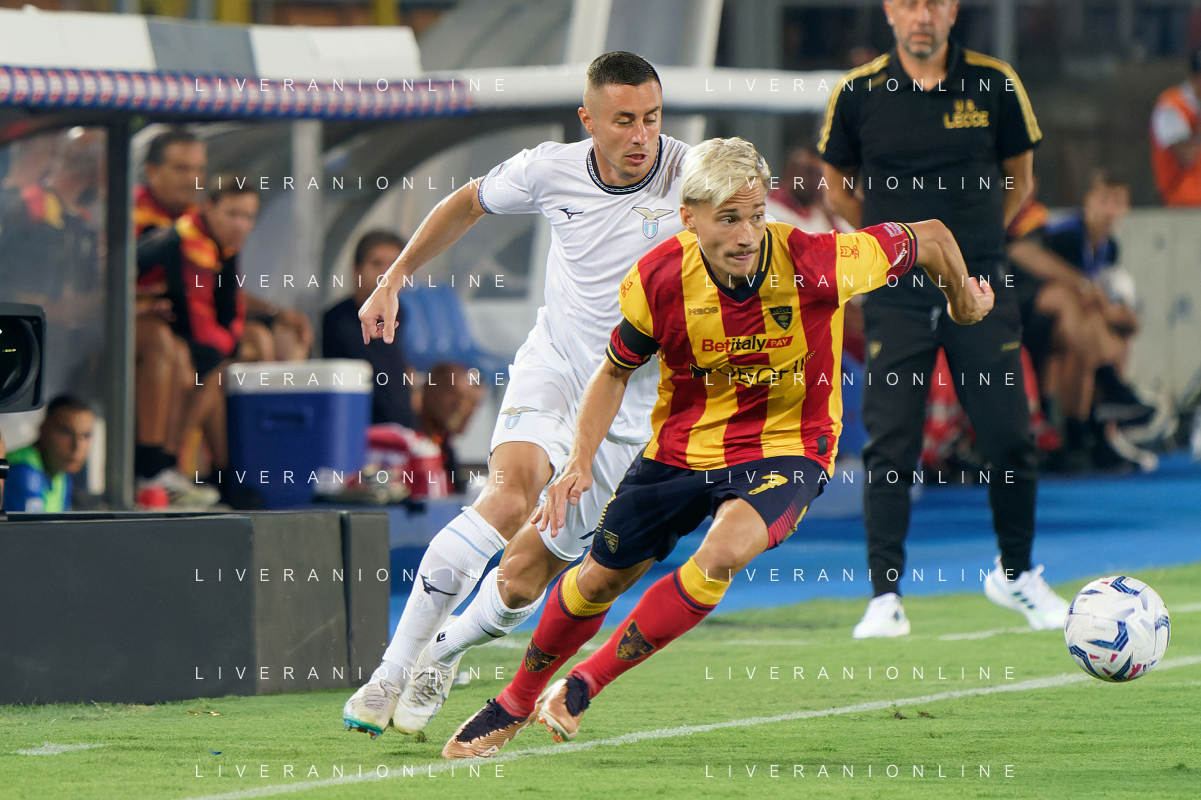 Pontus Almqvist (US Lecce) and Adam Marusic (S.S. Lazio) during the Italian soccer Serie A match US Lecce vs SS Lazio on August 20, 2023 at Via del Mare Stadium in Lecce, Italy. Photo by Emmanuele Mastrodonato/ag. Aldo Liverani sas