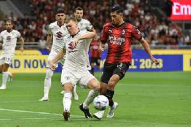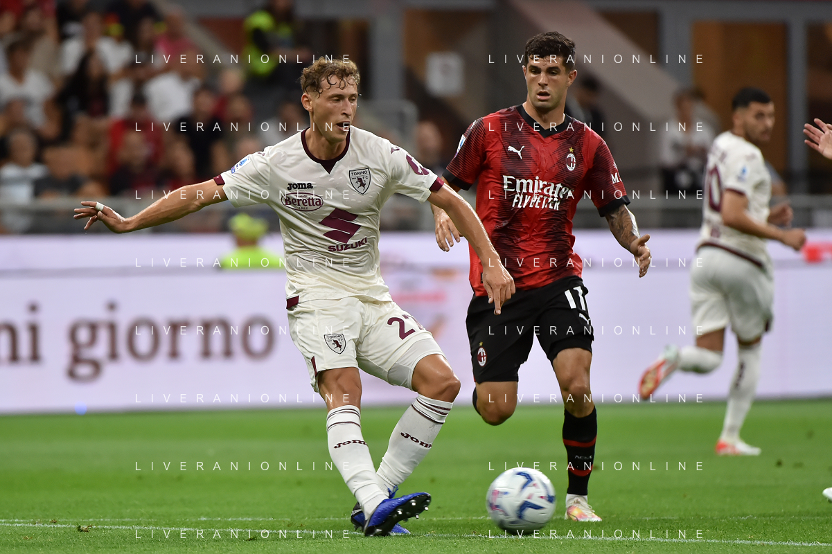 Milan vs Torino nella foto Perr Schuurs (Torino) e Tijjani Reijnders (Milan) Milano 26-08-2023 Stadio Giuseppe Meazza - San Siro Campionato Serie A TIM - 2a giornata foto Roberto Garavaglia/ag. Aldo Liverani sas