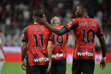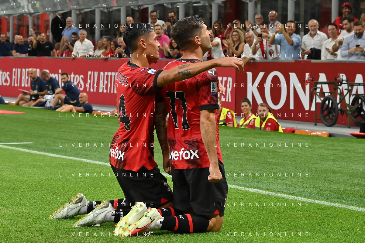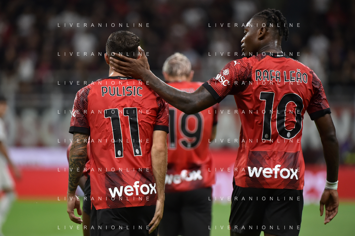 Milan vs Torino nella foto Christian Mate Pulisic (Milan) e Rafael Leao (Milan) esultano dopo il gol dell'1 a 0 Milano 26-08-2023 Stadio Giuseppe Meazza - San Siro Campionato Serie A TIM - 2a giornata foto Roberto Garavaglia/ag. Aldo Liverani sas
