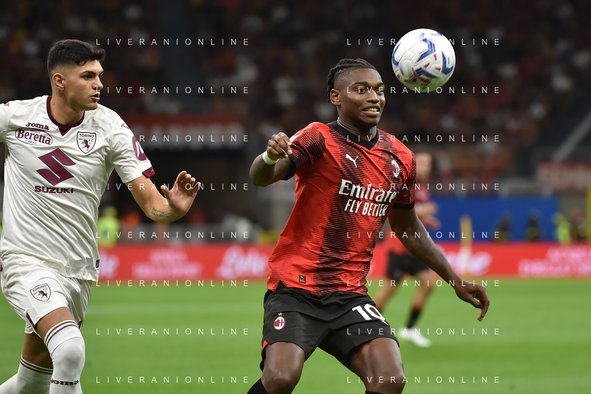 Milan vs Torino nella foto Rafael Leao (Milan) e sulla SX Raoul Bellanova (Torino) Milano 26-08-2023 Stadio Giuseppe Meazza - San Siro Campionato Serie A TIM - 2a giornata foto Roberto Garavaglia/ag. Aldo Liverani sas