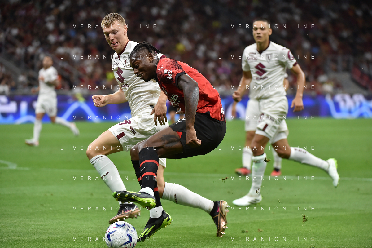 Milan vs Torino nella foto Rafael Leao (Milan) e Perr Schuurs (Torino) Milano 26-08-2023 Stadio Giuseppe Meazza - San Siro Campionato Serie A TIM - 2a giornata foto Roberto Garavaglia/ag. Aldo Liverani sas