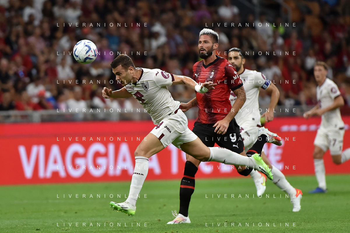Milan vs Torino nella foto Alessandro Buongiorno (Torino) e Olivier Giroud (Milan) Milano 26-08-2023 Stadio Giuseppe Meazza - San Siro Campionato Serie A TIM - 2a giornata foto Roberto Garavaglia/ag. Aldo Liverani sas