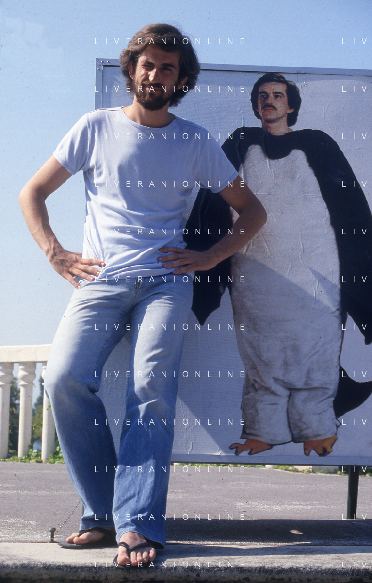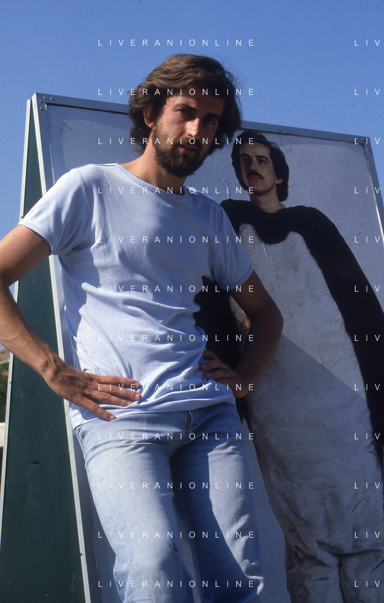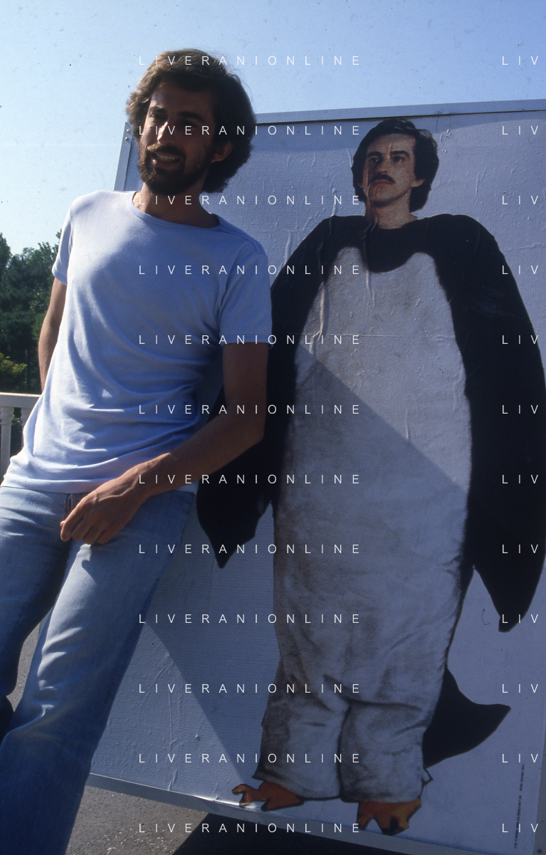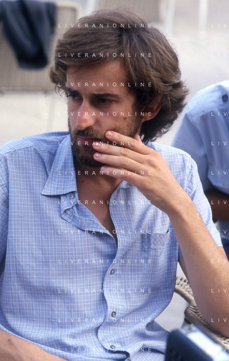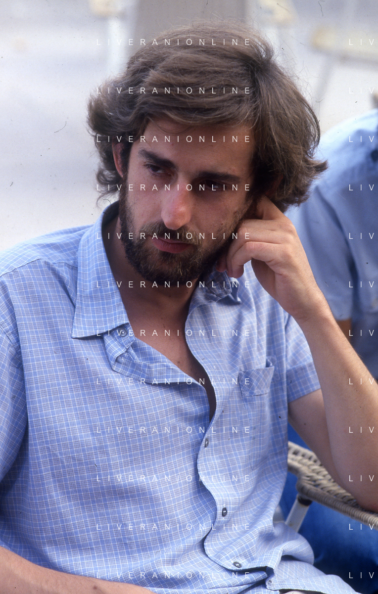 DIAP-RETROSPETTIVA NANNI MORETTI REGISTA NELLA FOTO NANNI MORETTI A VENEZIA NELL'ANNO 1981 CON ALESSANDRO HABER RENZO ROSSELLINI E GIGIO MORRA CAST DEL FILM SOGNI D'ORO AG ALDO LIVERANI SAS