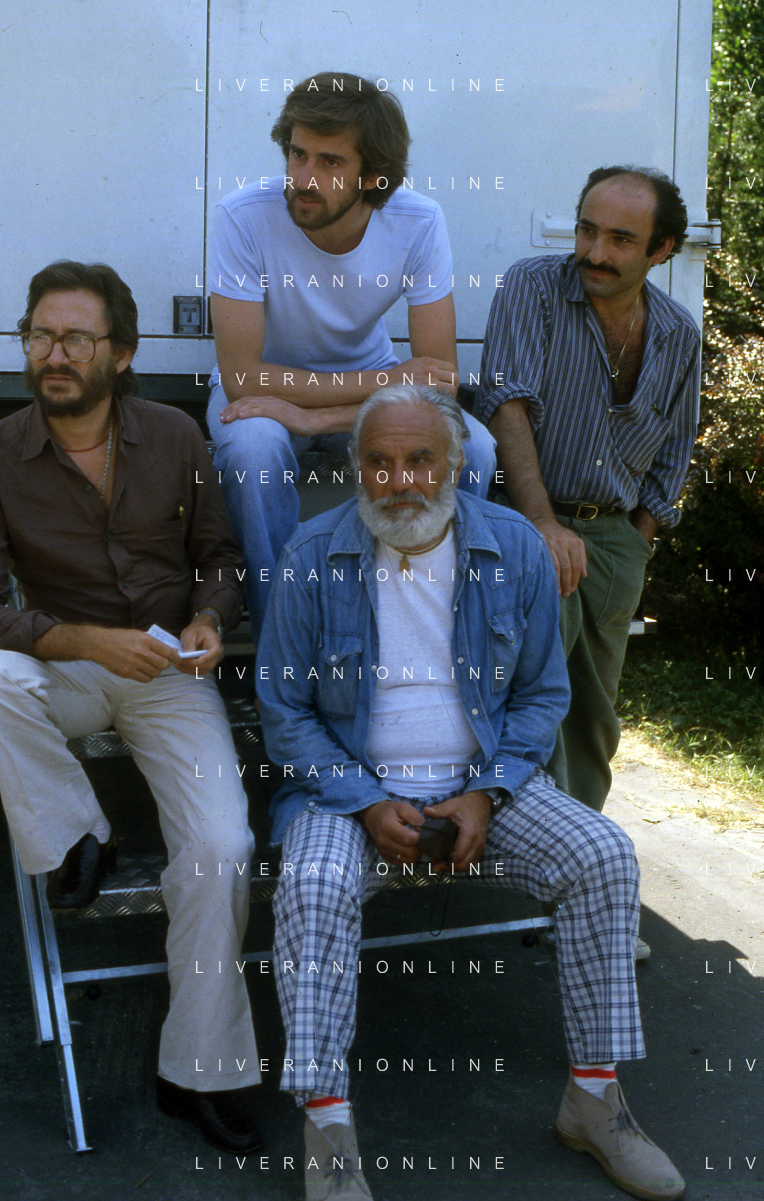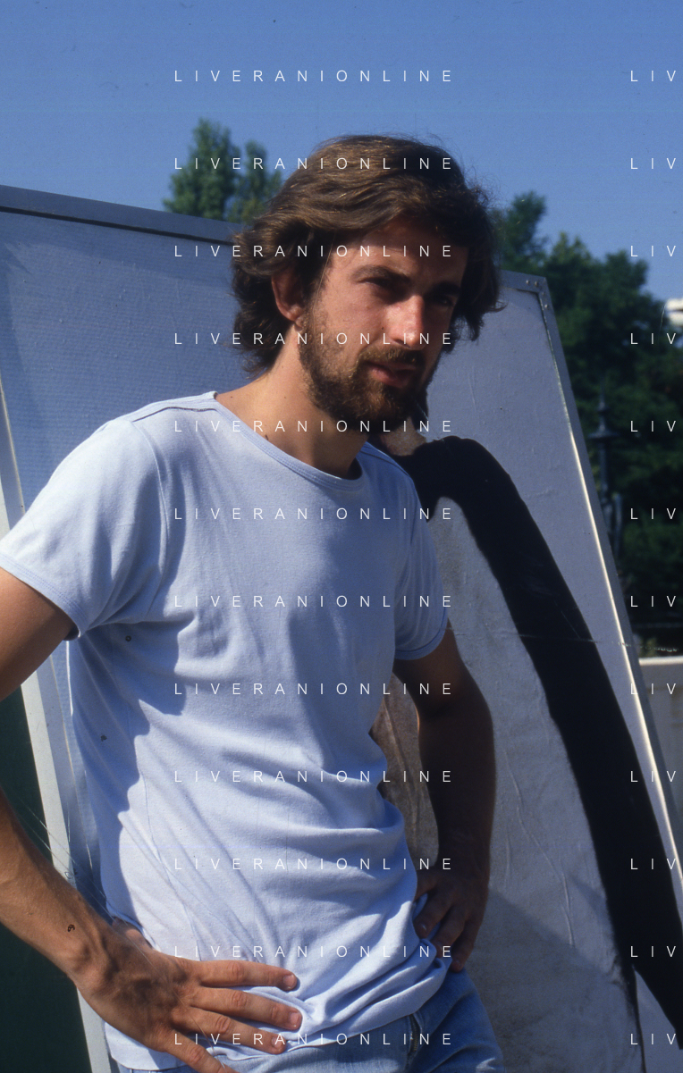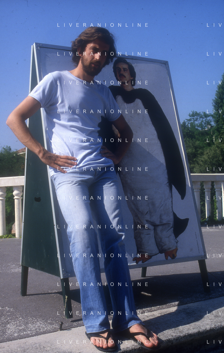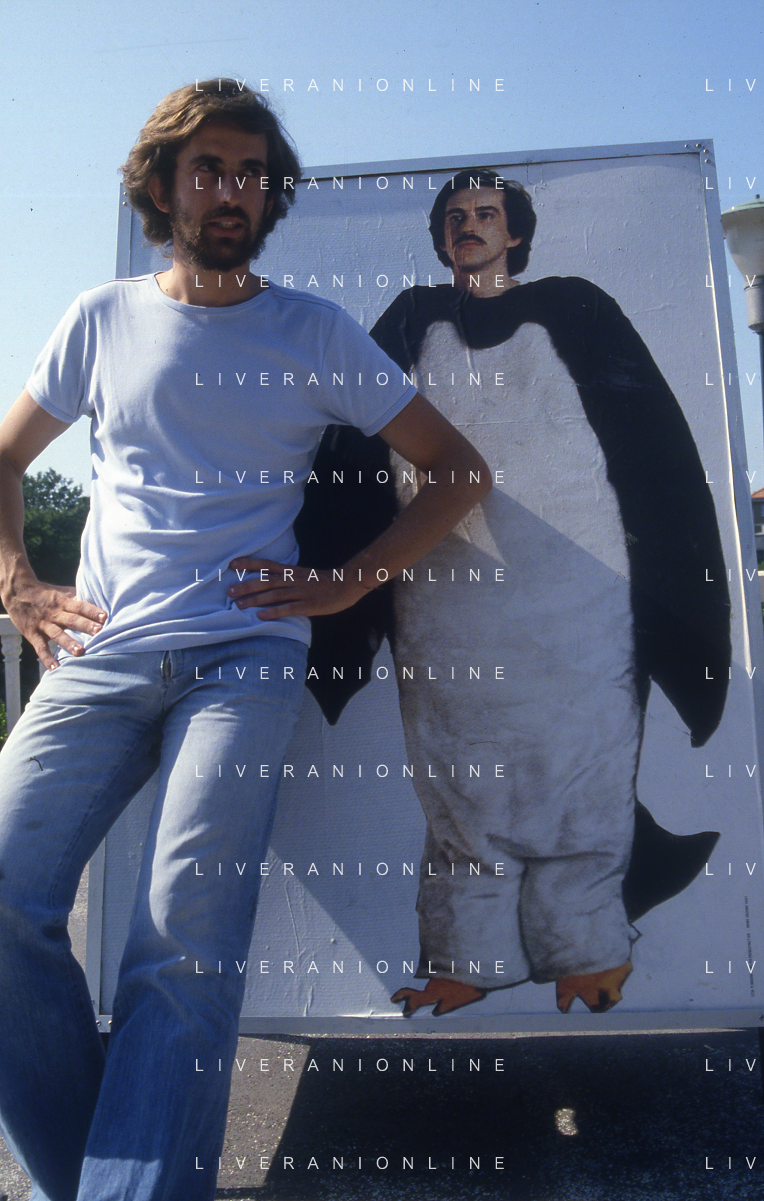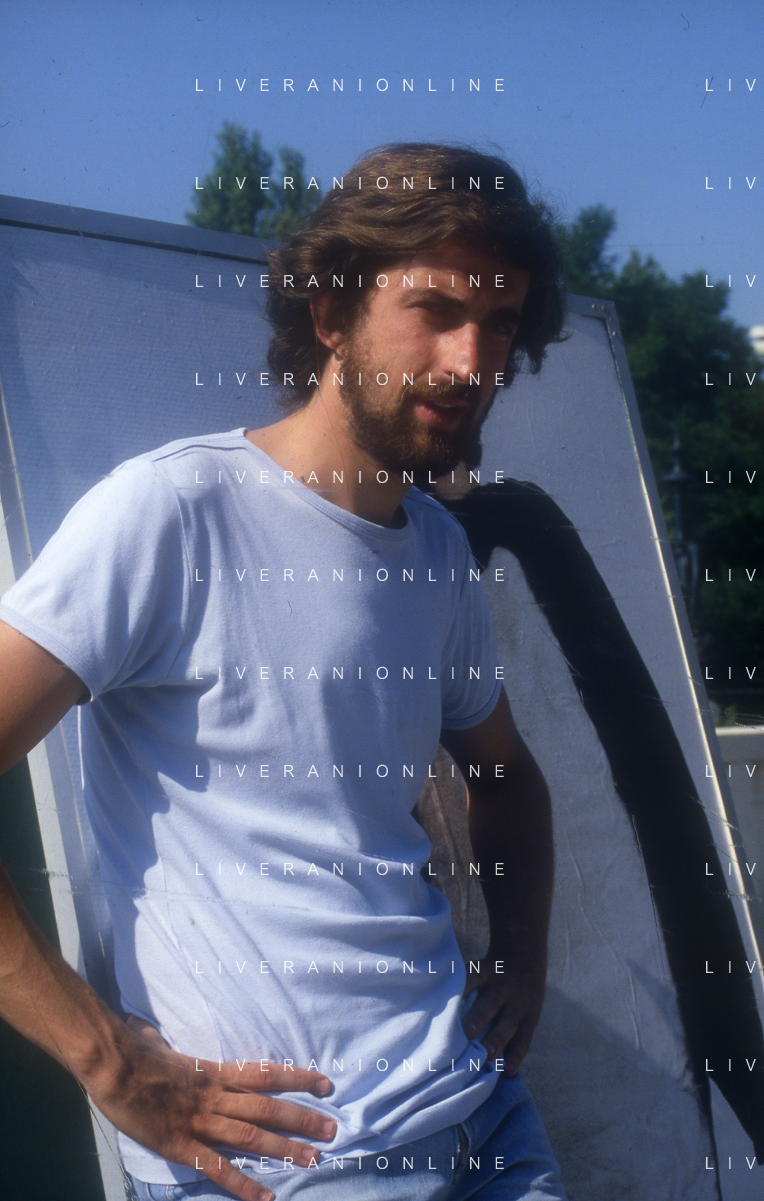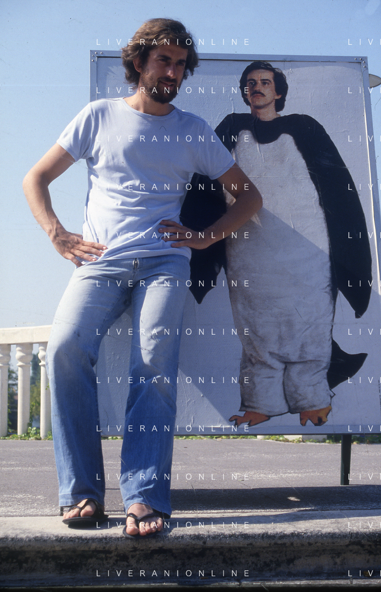 DIAP-RETROSPETTIVA NANNI MORETTI REGISTA NELLA FOTO NANNI MORETTI A VENEZIA NELL'ANNO 1981 CON ALESSANDRO HABER RENZO ROSSELLINI E GIGIO MORRA CAST DEL FILM SOGNI D'ORO AG ALDO LIVERANI SAS