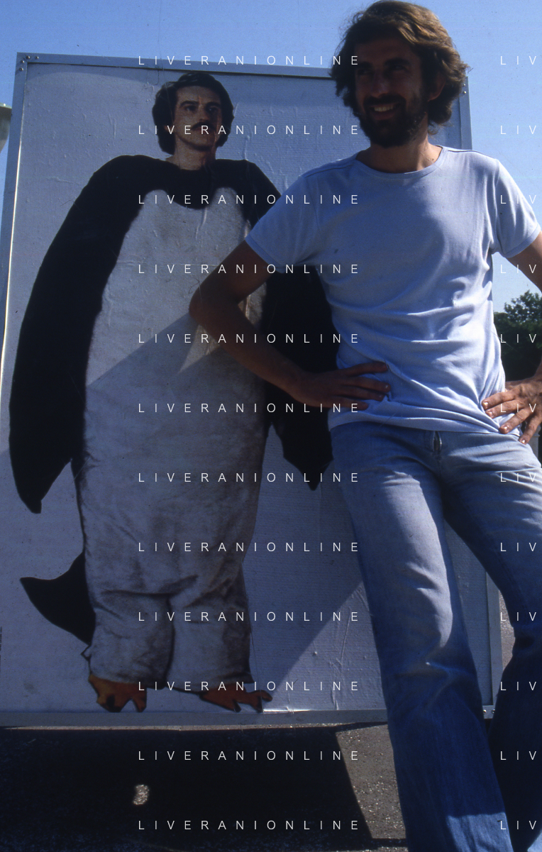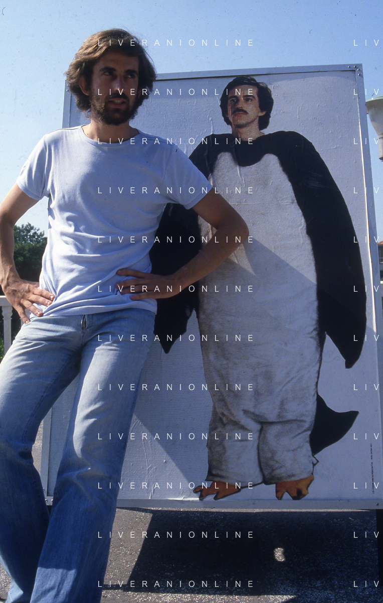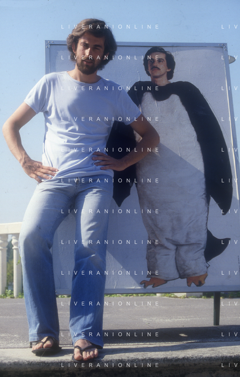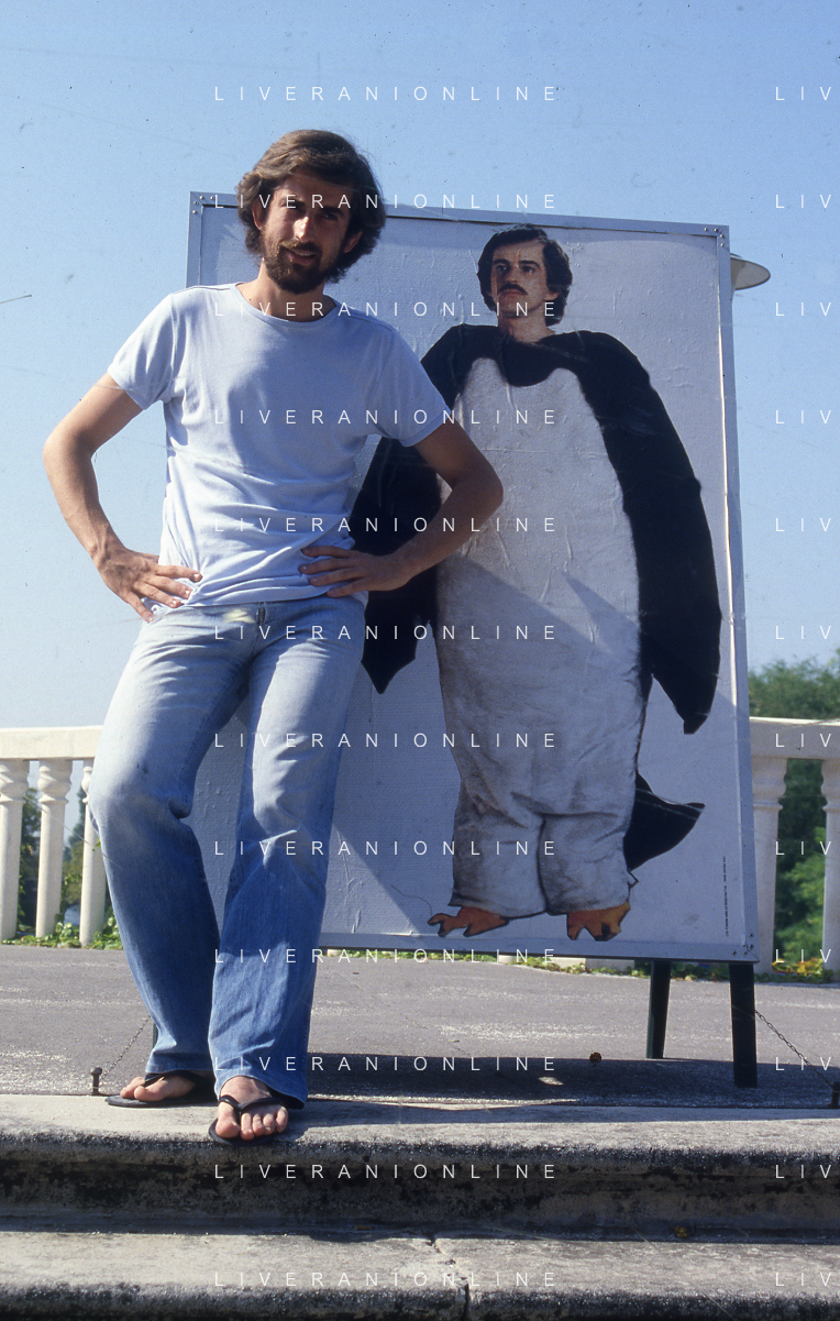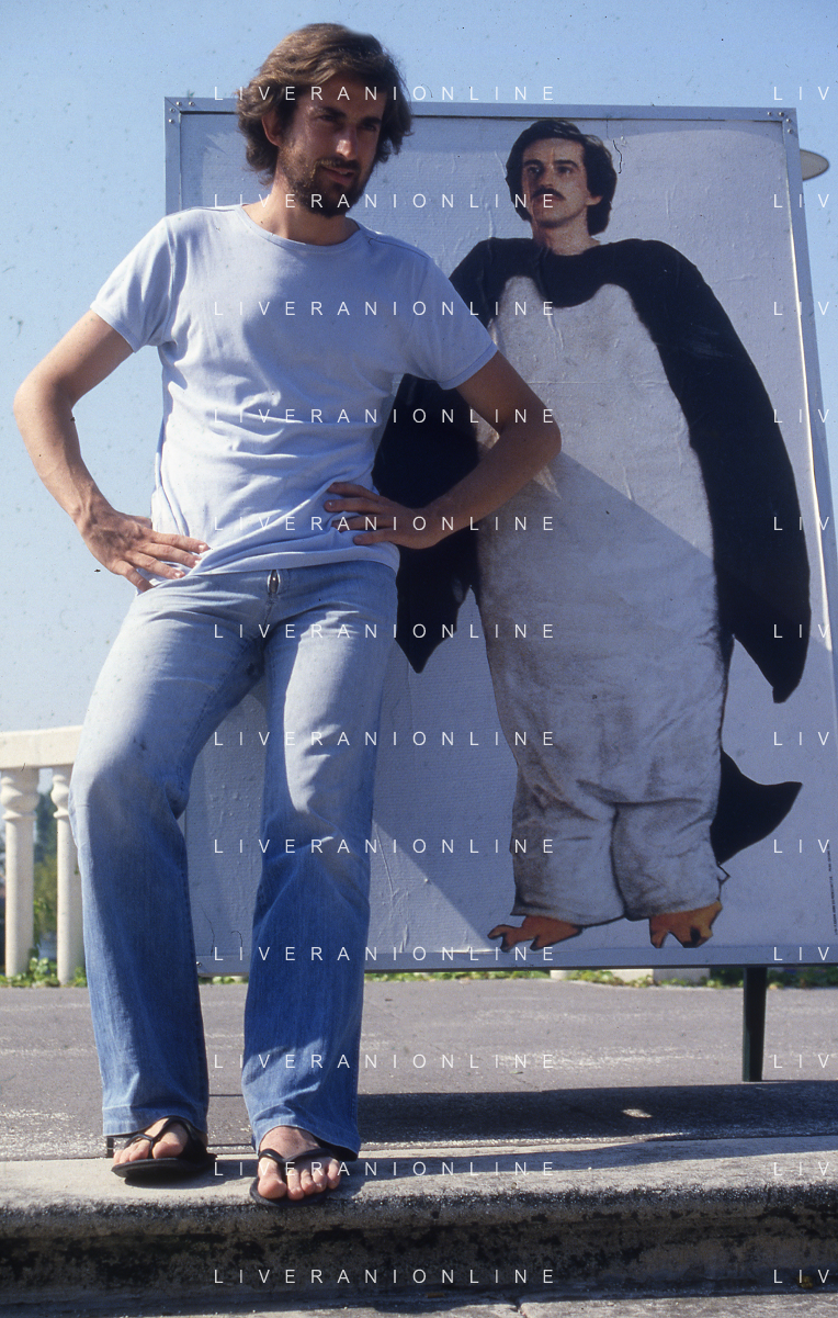 DIAP-RETROSPETTIVA NANNI MORETTI REGISTA NELLA FOTO NANNI MORETTI A VENEZIA NELL'ANNO 1981 CON ALESSANDRO HABER RENZO ROSSELLINI E GIGIO MORRA CAST DEL FILM SOGNI D'ORO AG ALDO LIVERANI SAS