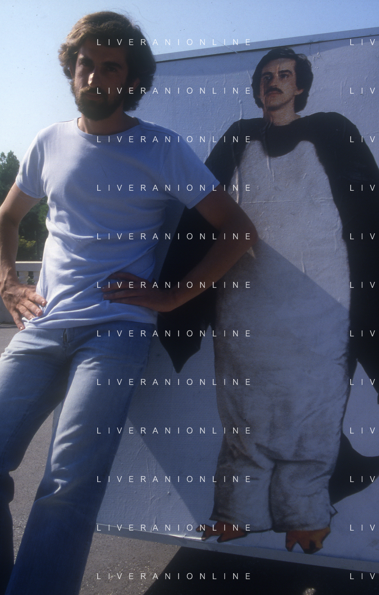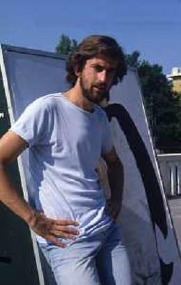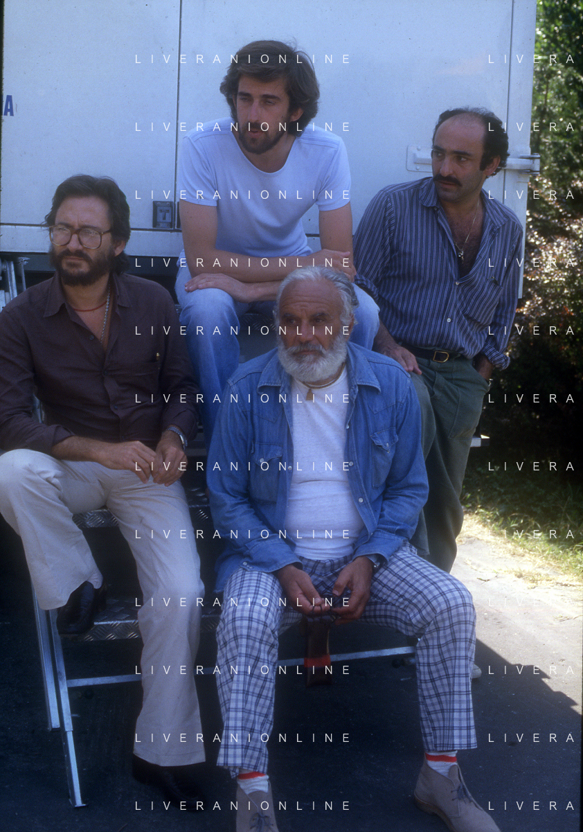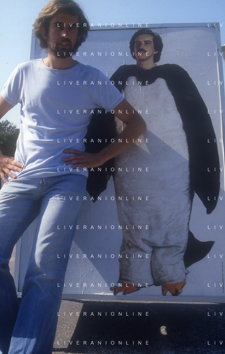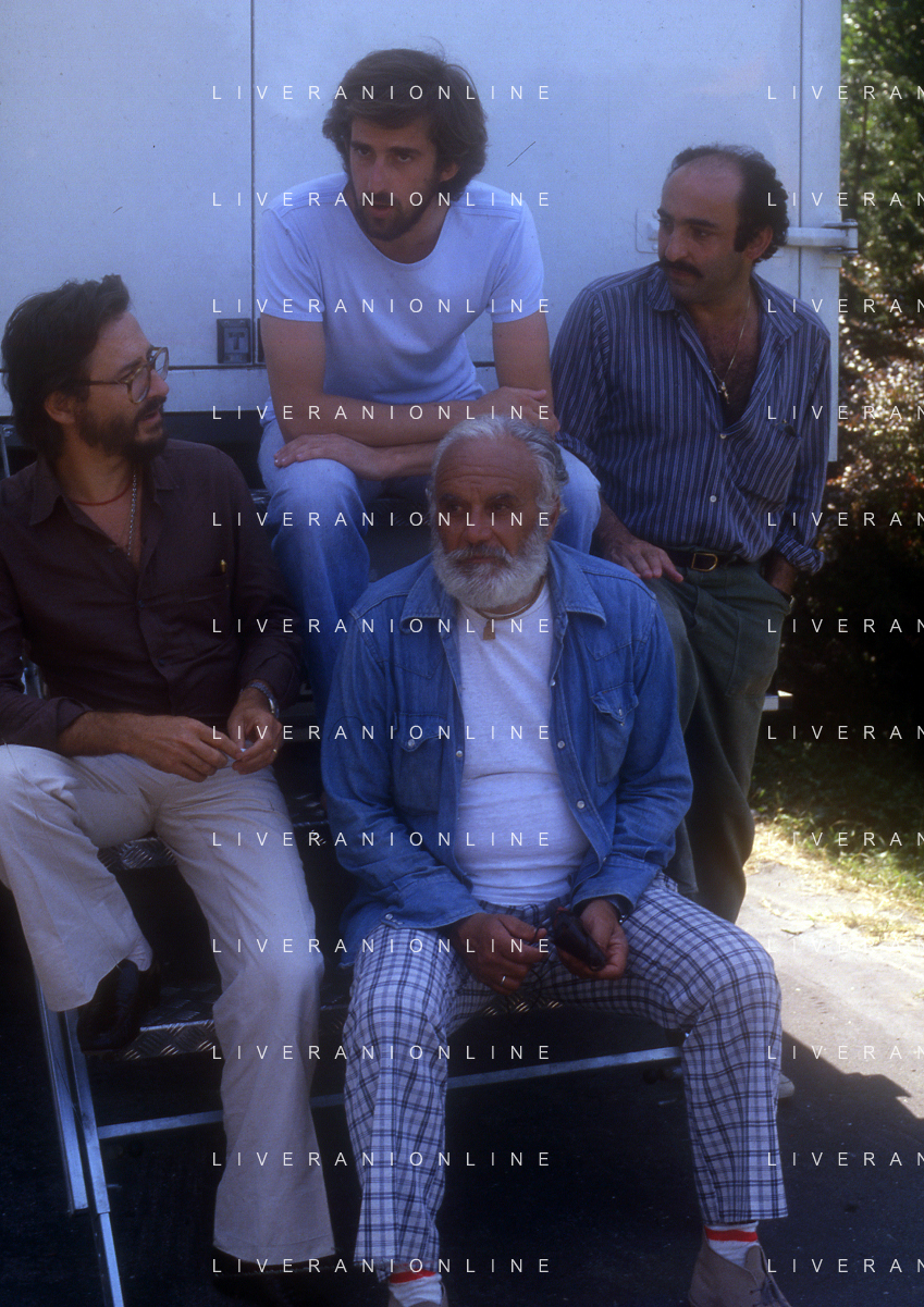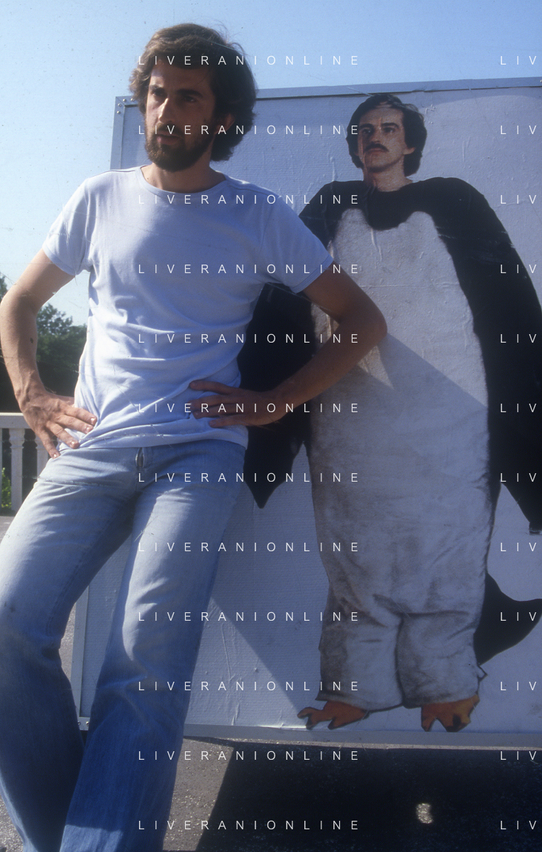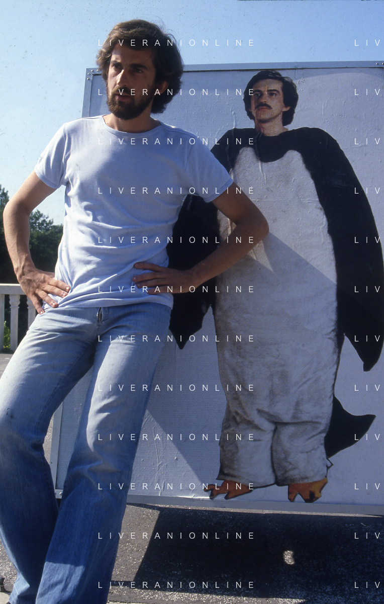 DIAP-RETROSPETTIVA NANNI MORETTI REGISTA NELLA FOTO NANNI MORETTI A VENEZIA NELL'ANNO 1981 CON ALESSANDRO HABER RENZO ROSSELLINI E GIGIO MORRA CAST DEL FILM SOGNI D'ORO AG ALDO LIVERANI SAS