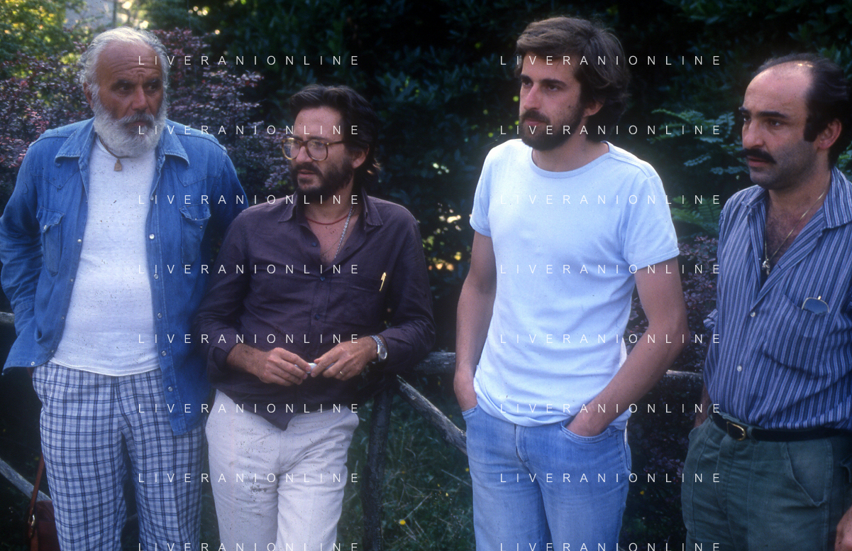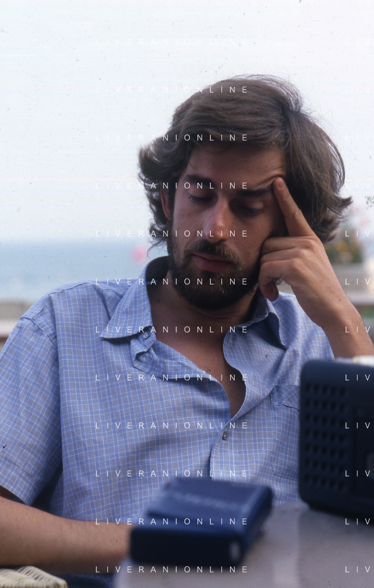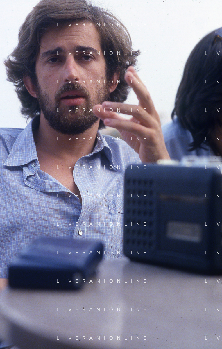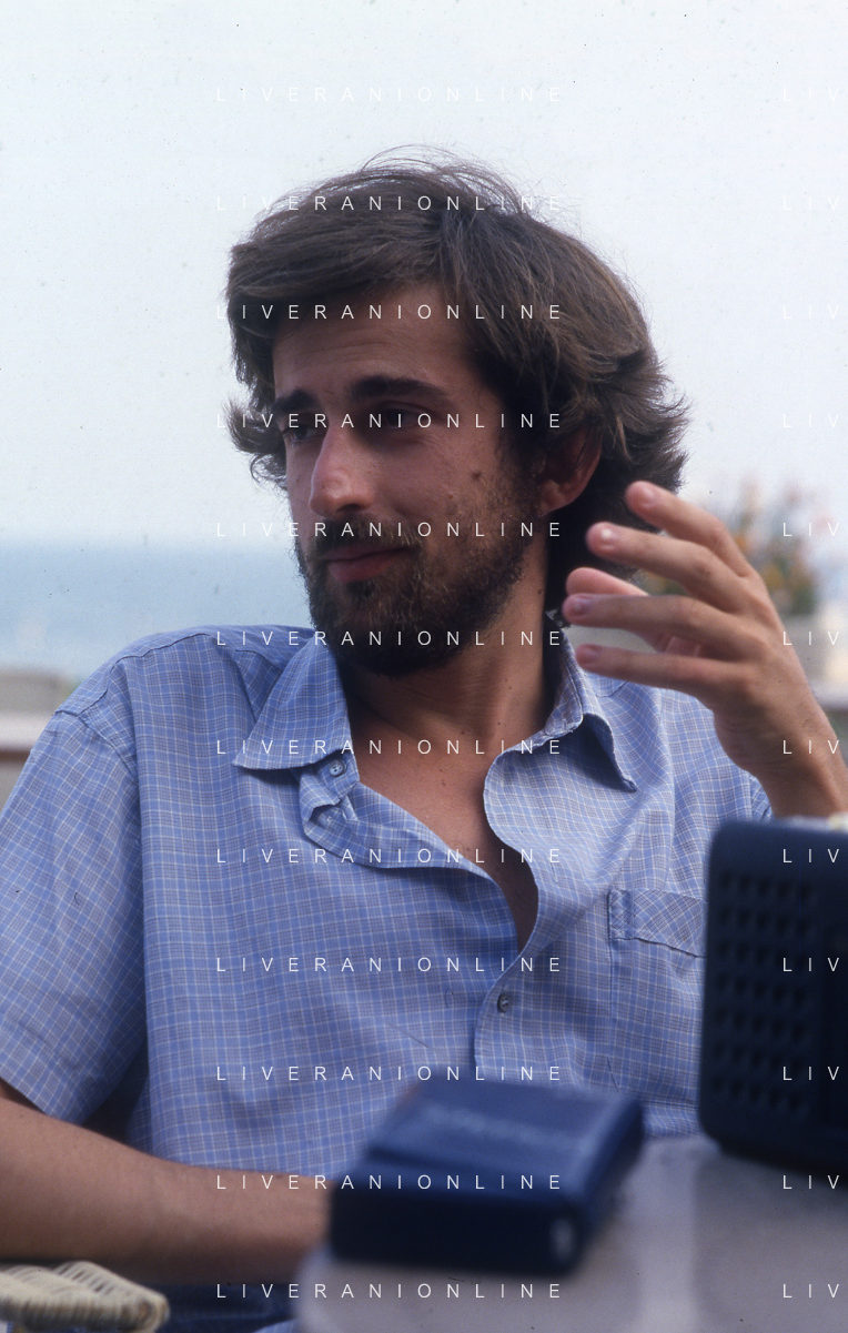 DIAP-RETROSPETTIVA NANNI MORETTI REGISTA NELLA FOTO NANNI MORETTI A VENEZIA NELL'ANNO 1981 CON ALESSANDRO HABER -RENZO ROSSELLINI E GIGIO MORRA CAST DEL FILM SOGNI D'ORO AG ALDO LIVERANI SAS
