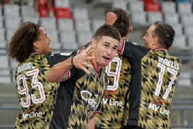 Marco Nasti (SSC Bari) celebrates after scoring a goal with teammates during the Italian Serie B match SSC Bari vs AS Cittadella on August 30, 2023 at the San Nicola stadium in Bari, Italy. Photo by Emmanuele Mastrodonato/ag. Aldo Liverani sas