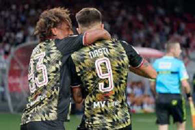 Marco Nasti (SSC Bari) celebrates after scoring a goal with Mehdi Dorval (SSC Bari) during the Italian Serie B match SSC Bari vs AS Cittadella on August 30, 2023 at the San Nicola stadium in Bari, Italy. Photo by Emmanuele Mastrodonato/ag. Aldo Liverani sas