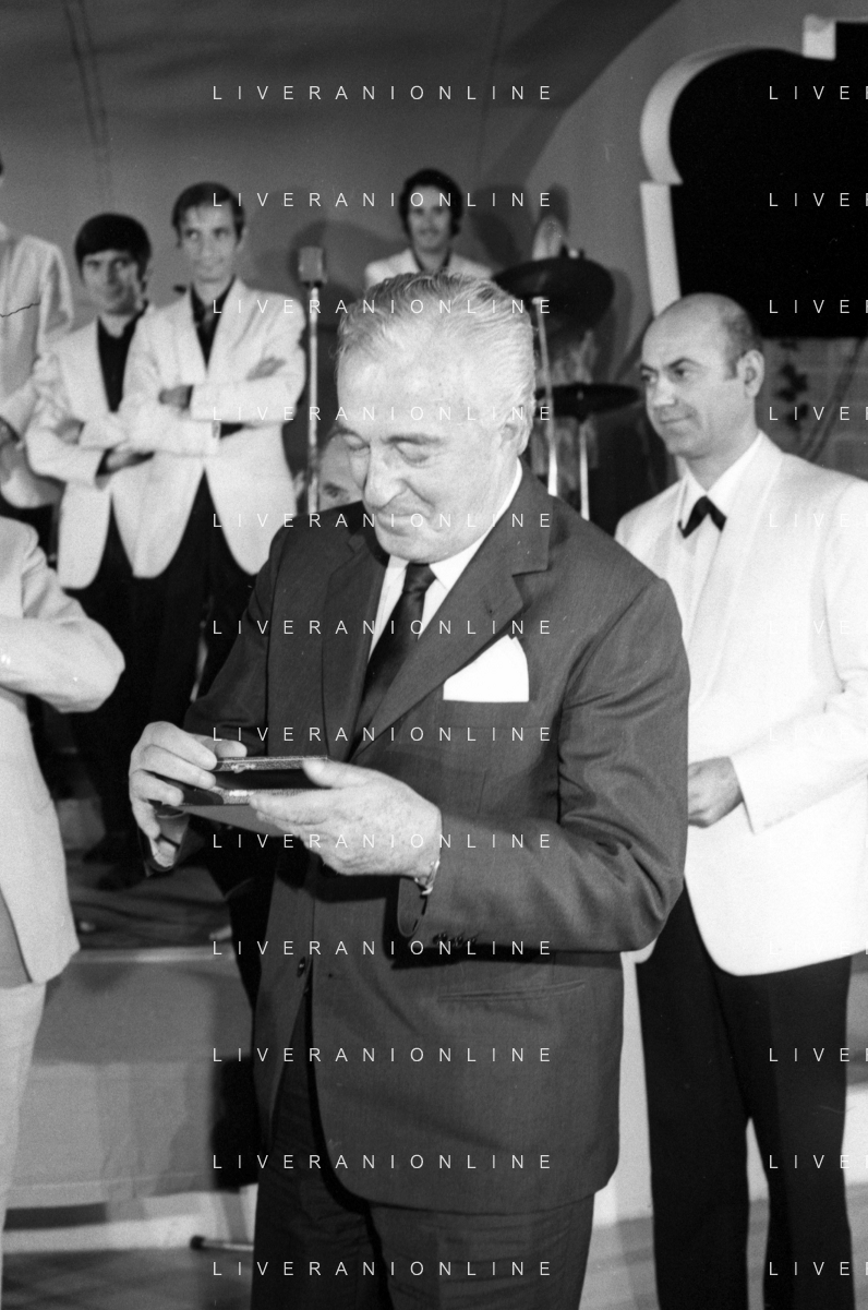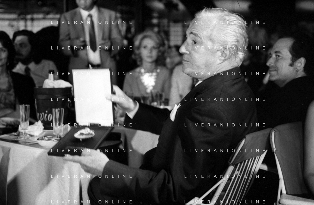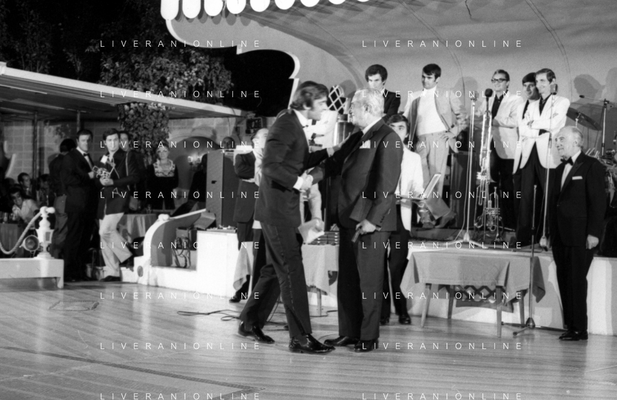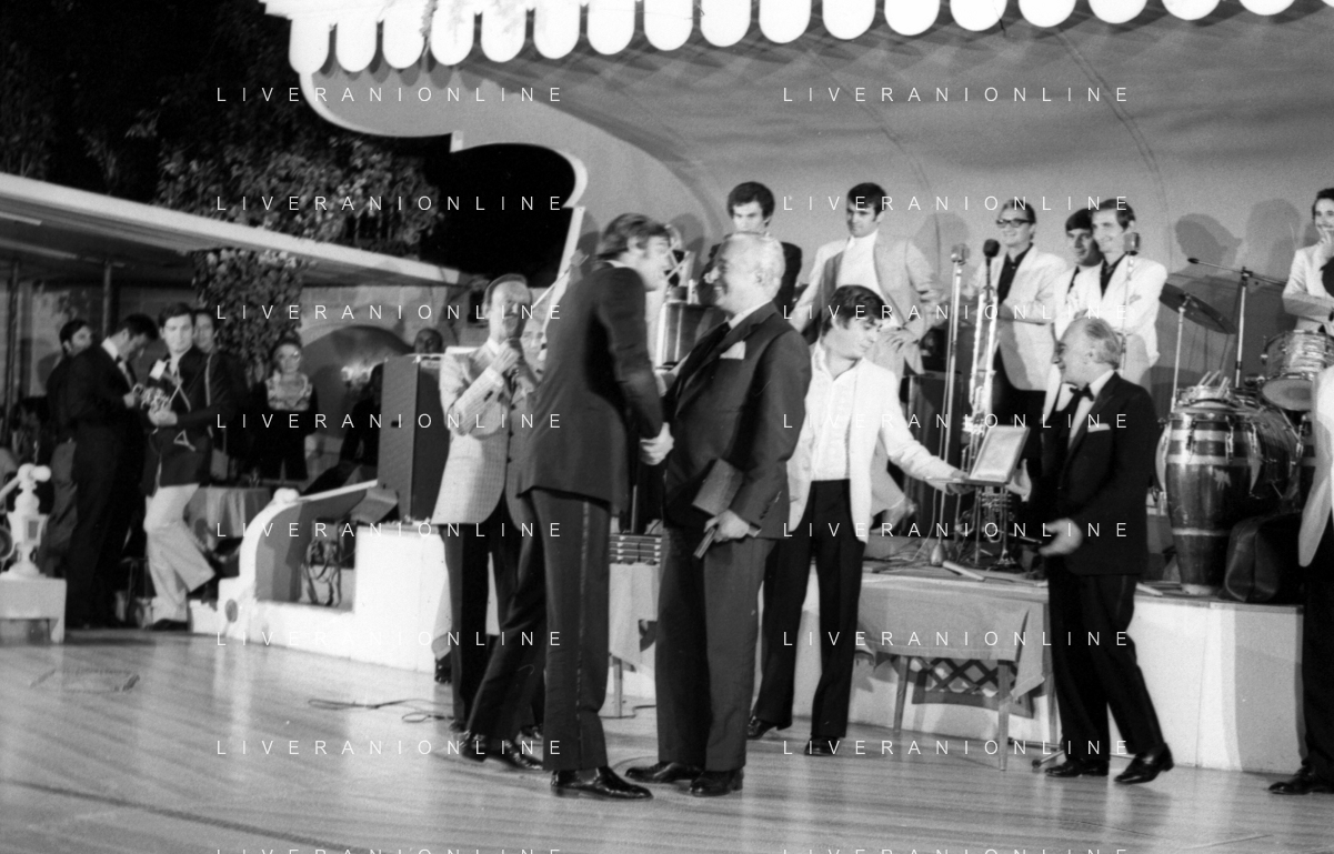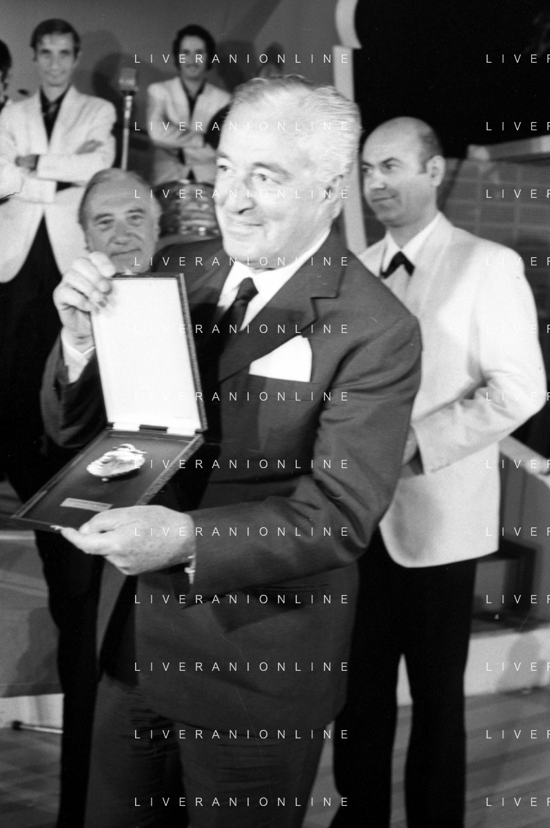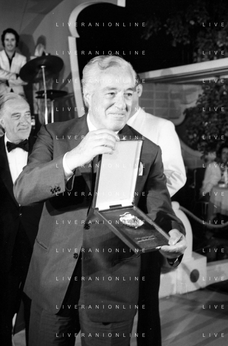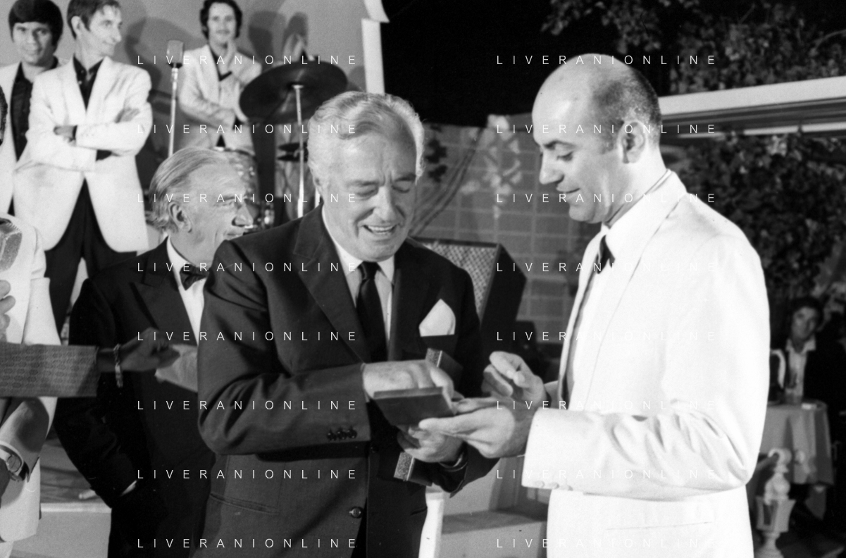Neg- RETROSPETTIVA VITTORIO DE SICA ATTORE E REGISTA NELLA FOTO RICEVE UN PREMIO AL SAVIOLI DI RICCIONE NELL'ANNO 1970 CON NUNZIO FILOGAMO AG ALDO LIVERANI SAS