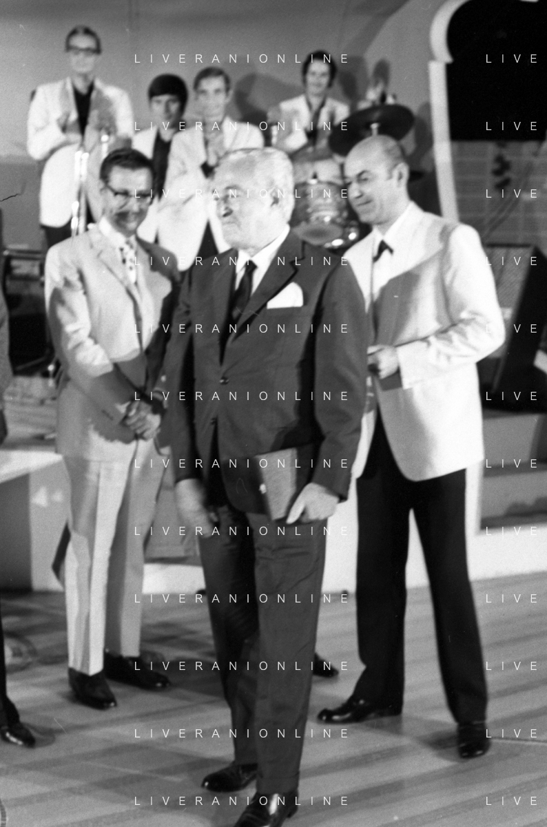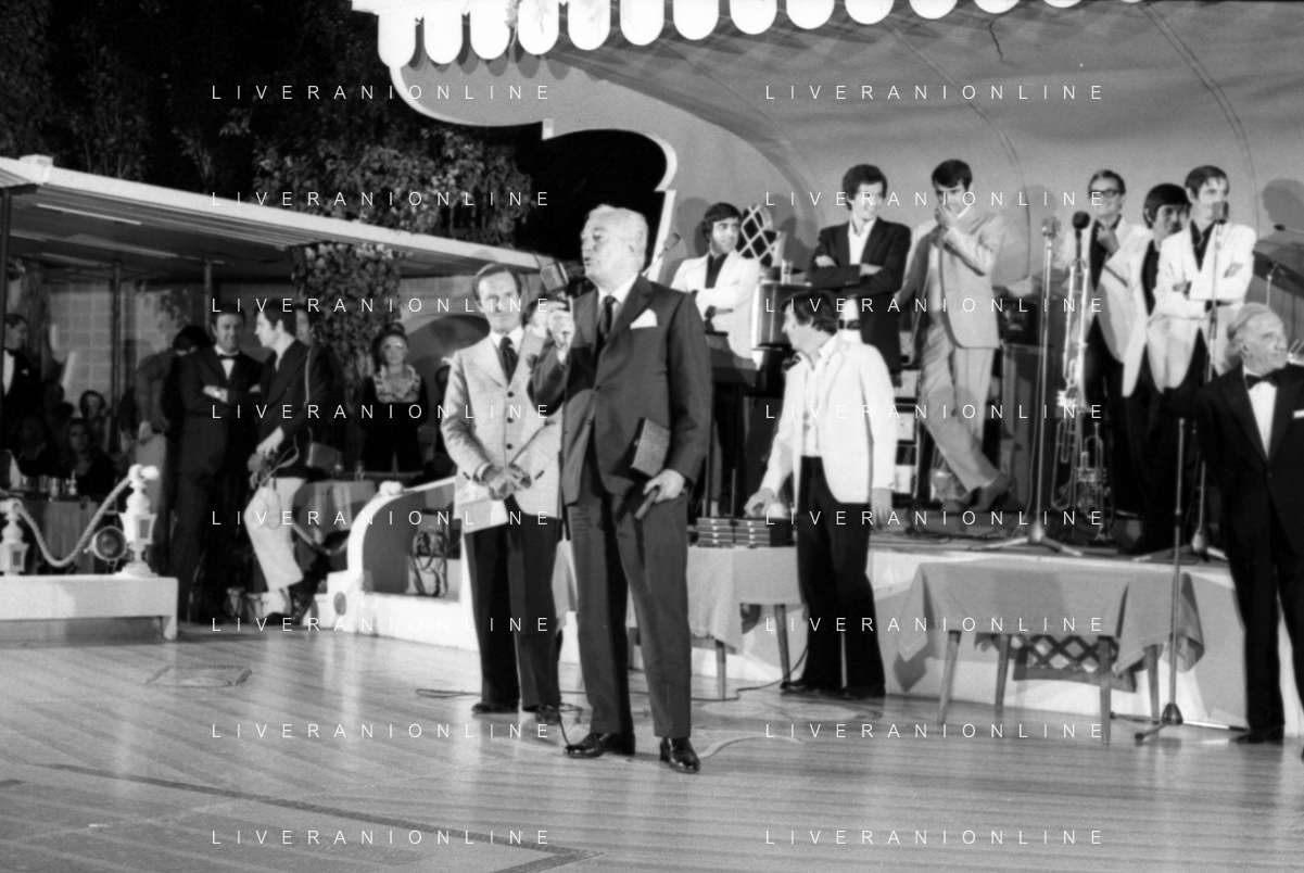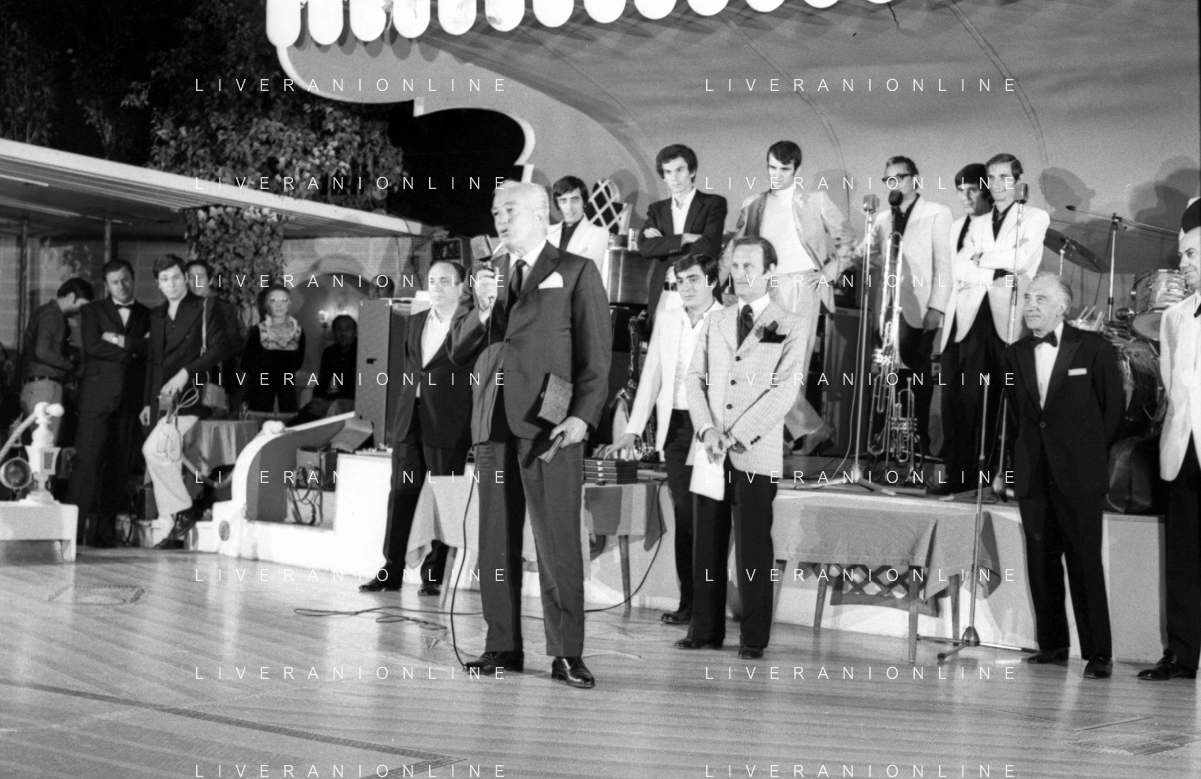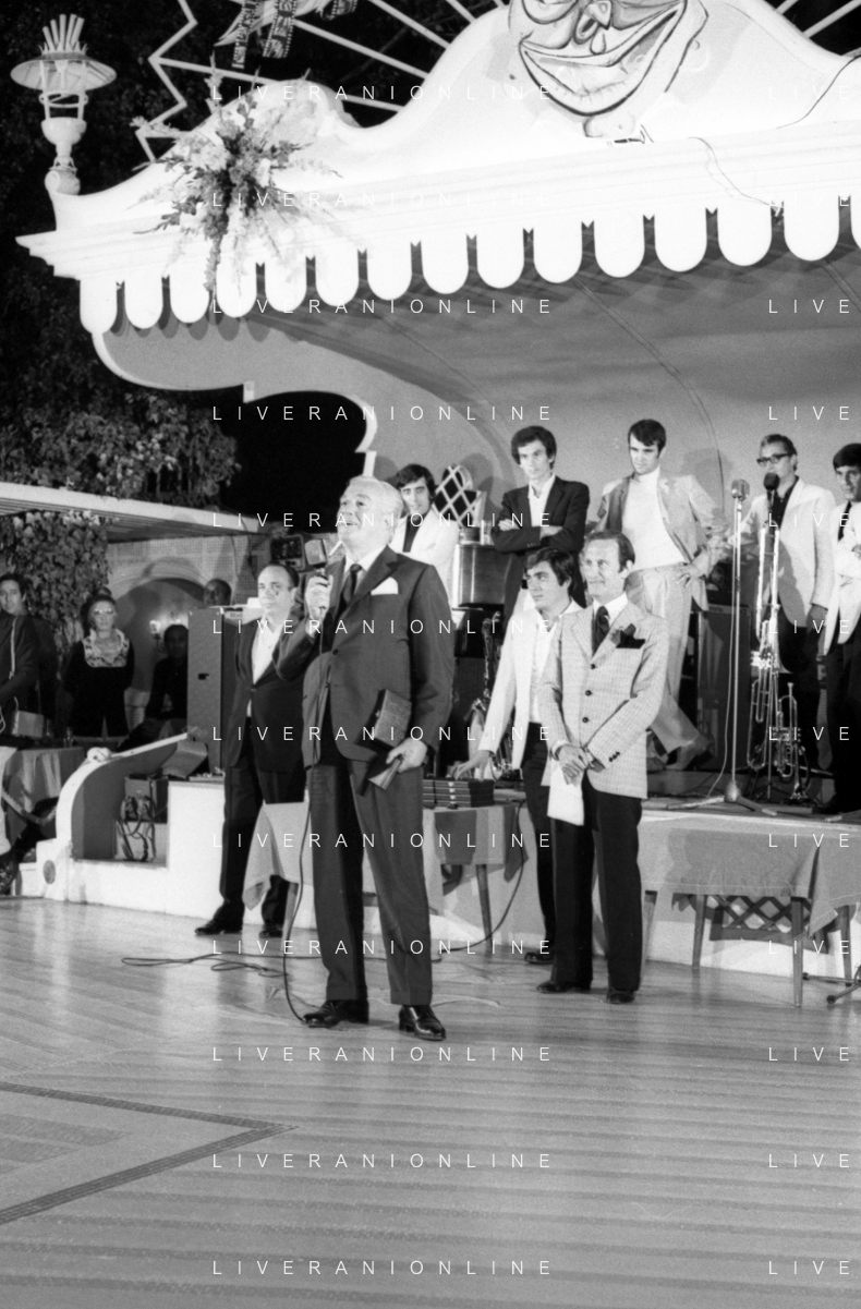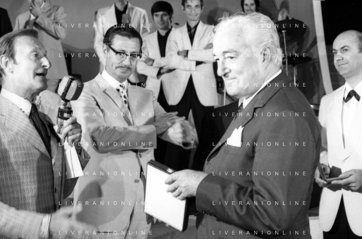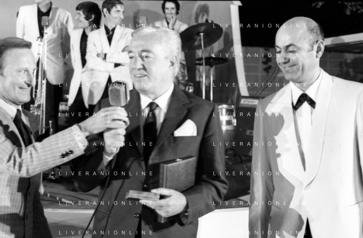 Neg- RETROSPETTIVA VITTORIO DE SICA ATTORE E REGISTA NELLA FOTO RICEVE UN PREMIO AL SAVIOLI DI RICCIONE NELL'ANNO 1970 CON NUNZIO FILOGAMO AG ALDO LIVERANI SAS