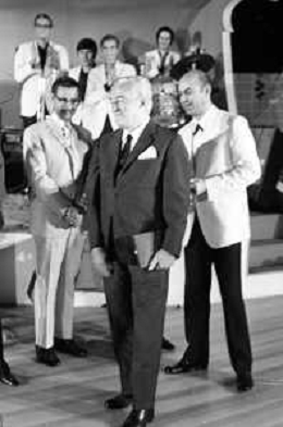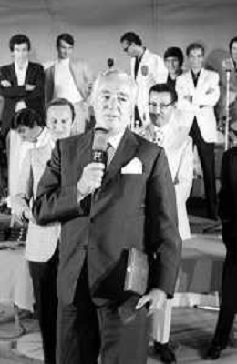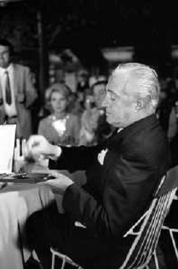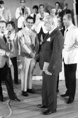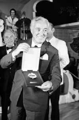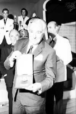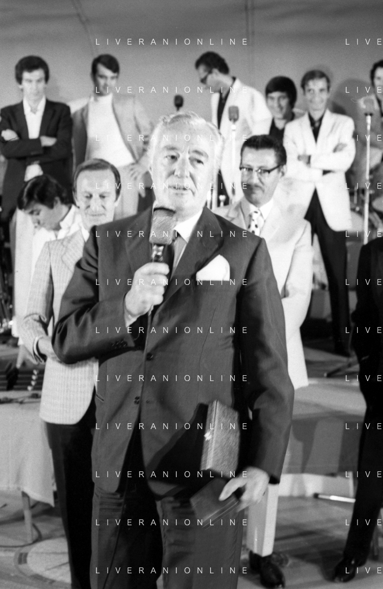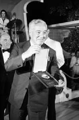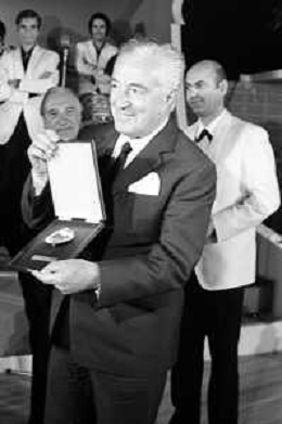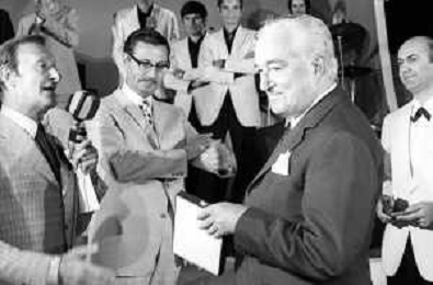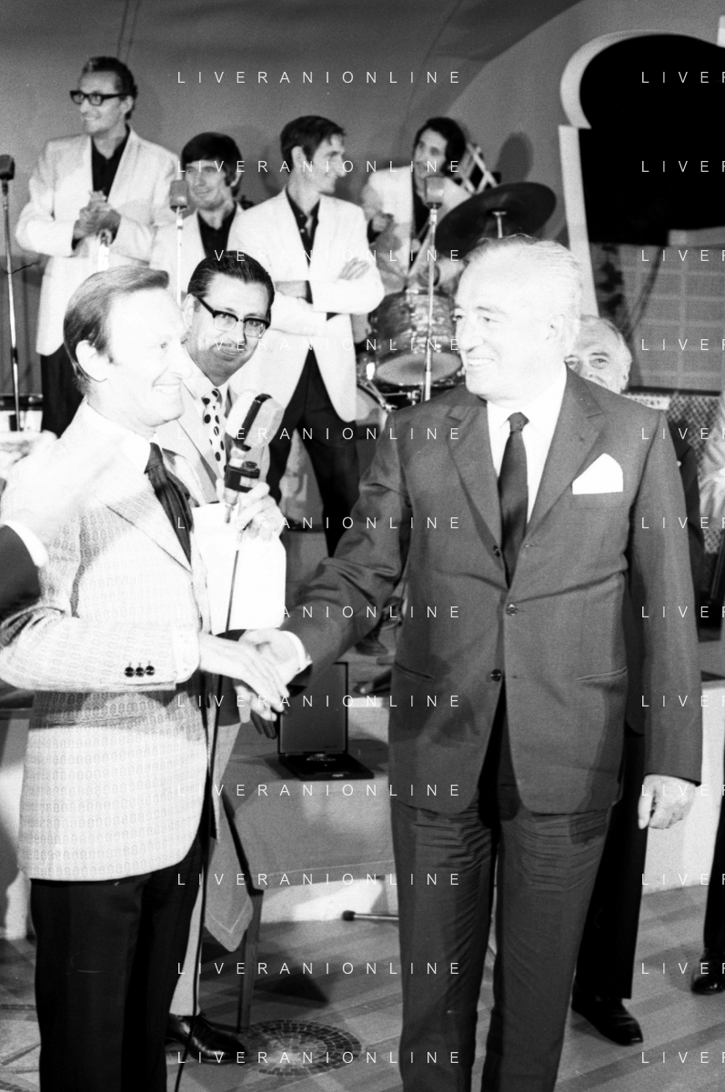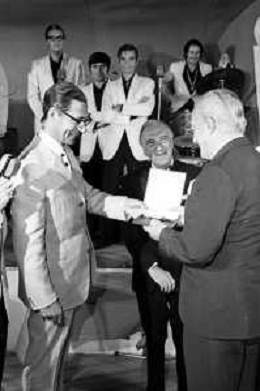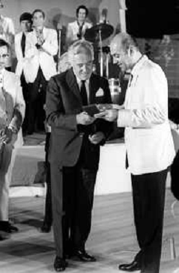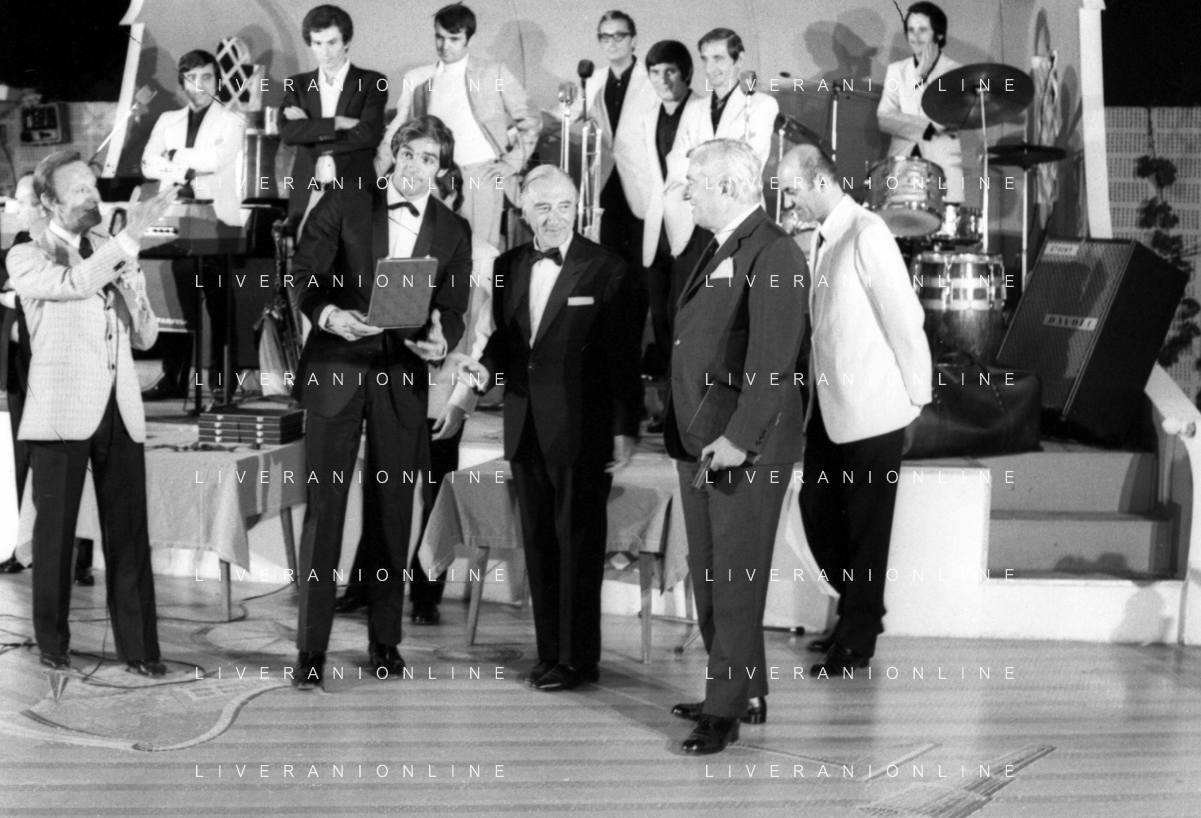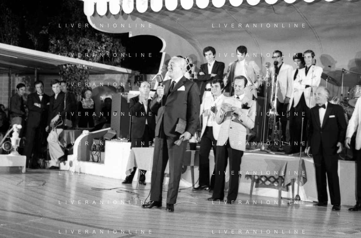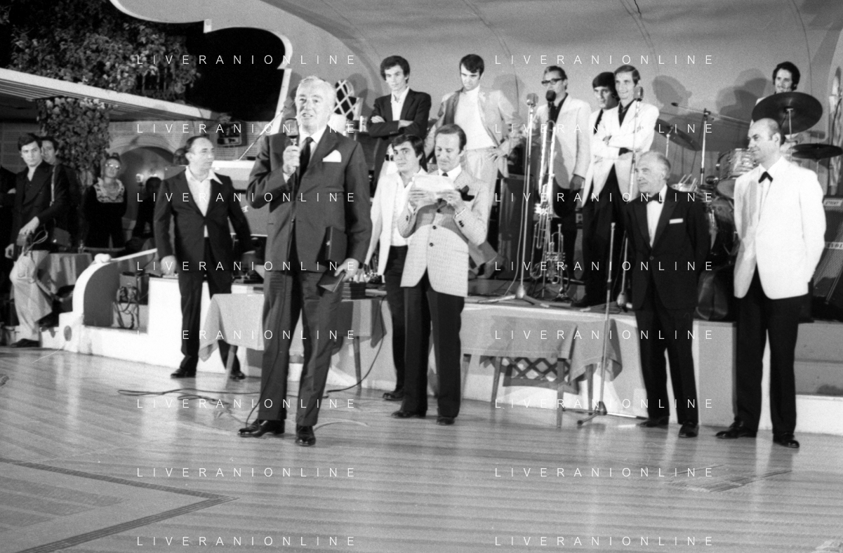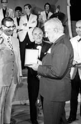 Neg- RETROSPETTIVA VITTORIO DE SICA ATTORE E REGISTA NELLA FOTO RICEVE UN PREMIO AL SAVIOLI DI RICCIONE NELL'ANNO 1970 CON NUNZIO FILOGAMO AG ALDO LIVERANI SAS