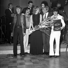 Neg- RETROSPETTIVA PREMIO REGIA TELEVISIVA NELLA FOTO LA PREMIAZIONE DEL GRUPPO MUSICALE I CAMALEONTI A SALSOMAGGIORE NELL'ANNO 1970 - SYLVA KOSCINA CON LIVIO MACCHIA, ANTONIO CRIPEZZI, RIKI MAIOCCHI E PAOLO DE CEGLIE AG ALDO LIVERANI SAS