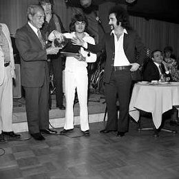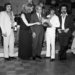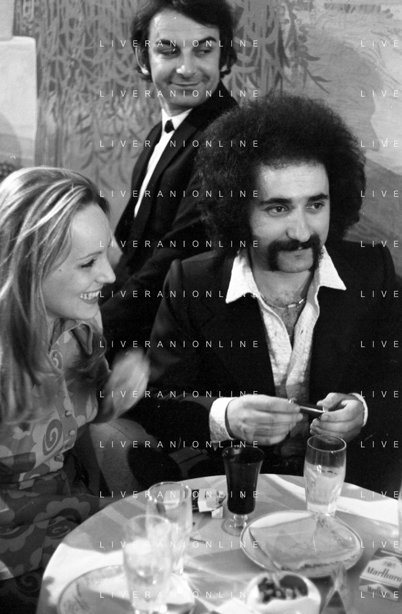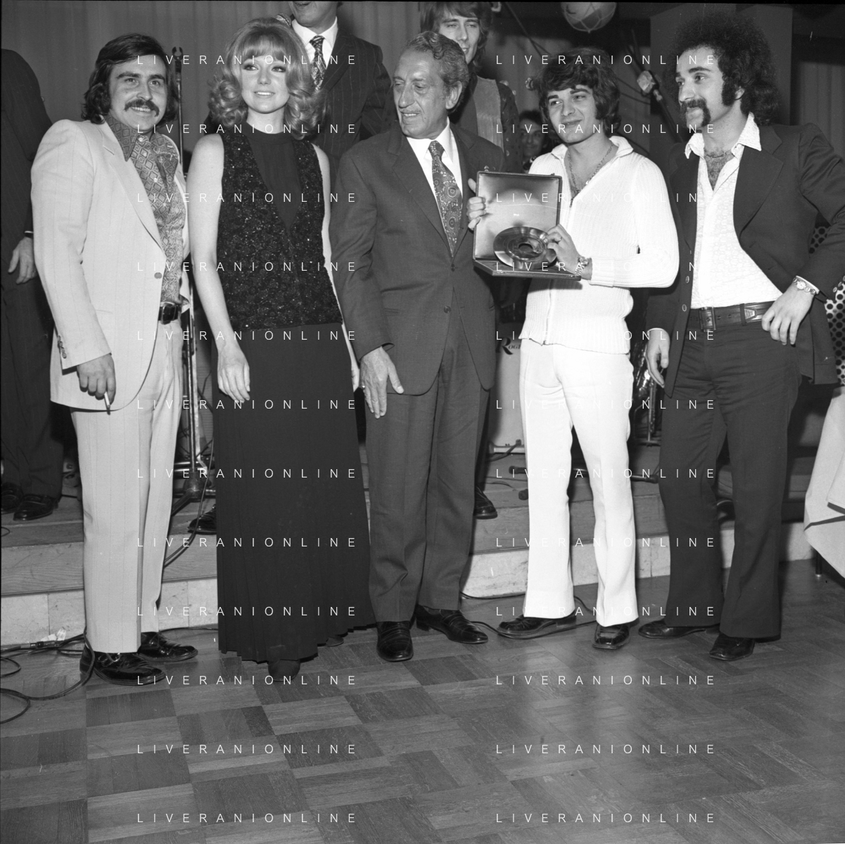 Neg- RETROSPETTIVA PREMIO REGIA TELEVISIVA NELLA FOTO LA PREMIAZIONE DEL GRUPPO MUSICALE I CAMALEONTI A SALSOMAGGIORE NELL'ANNO 1970 - DANIELE PIOMBI E SYLVA KOSCINA CON LIVIO MACCHIA, ANTONIO CRIPEZZI, RIKI MAIOCCHI E PAOLO DE CEGLIE AG ALDO LIVERANI SAS