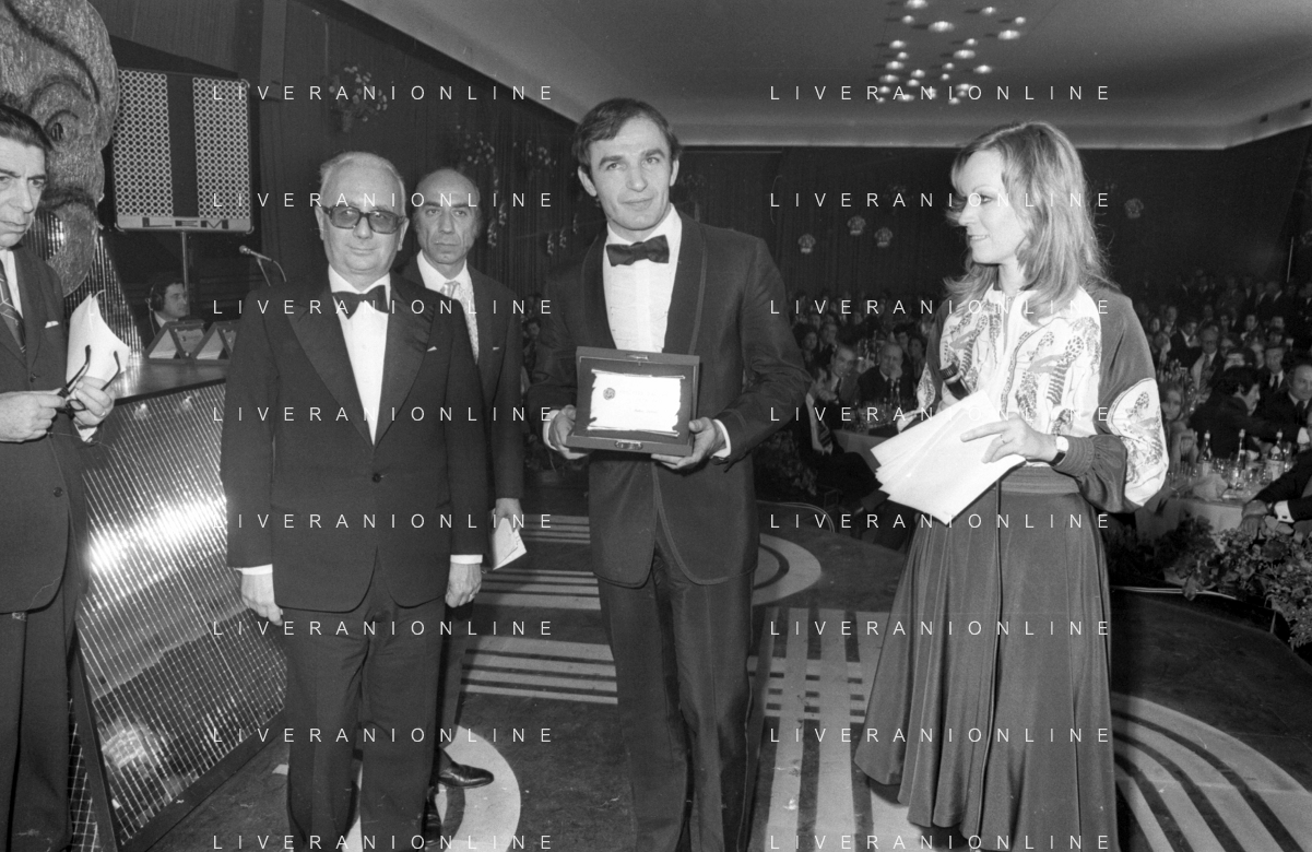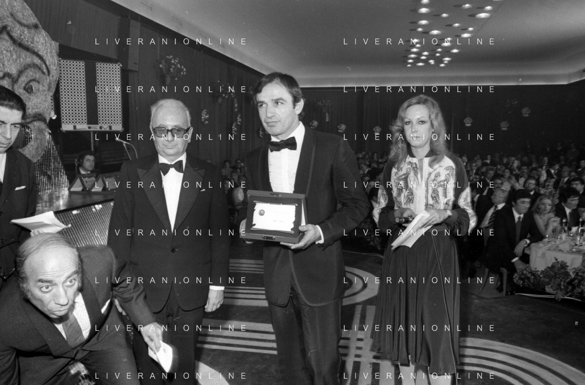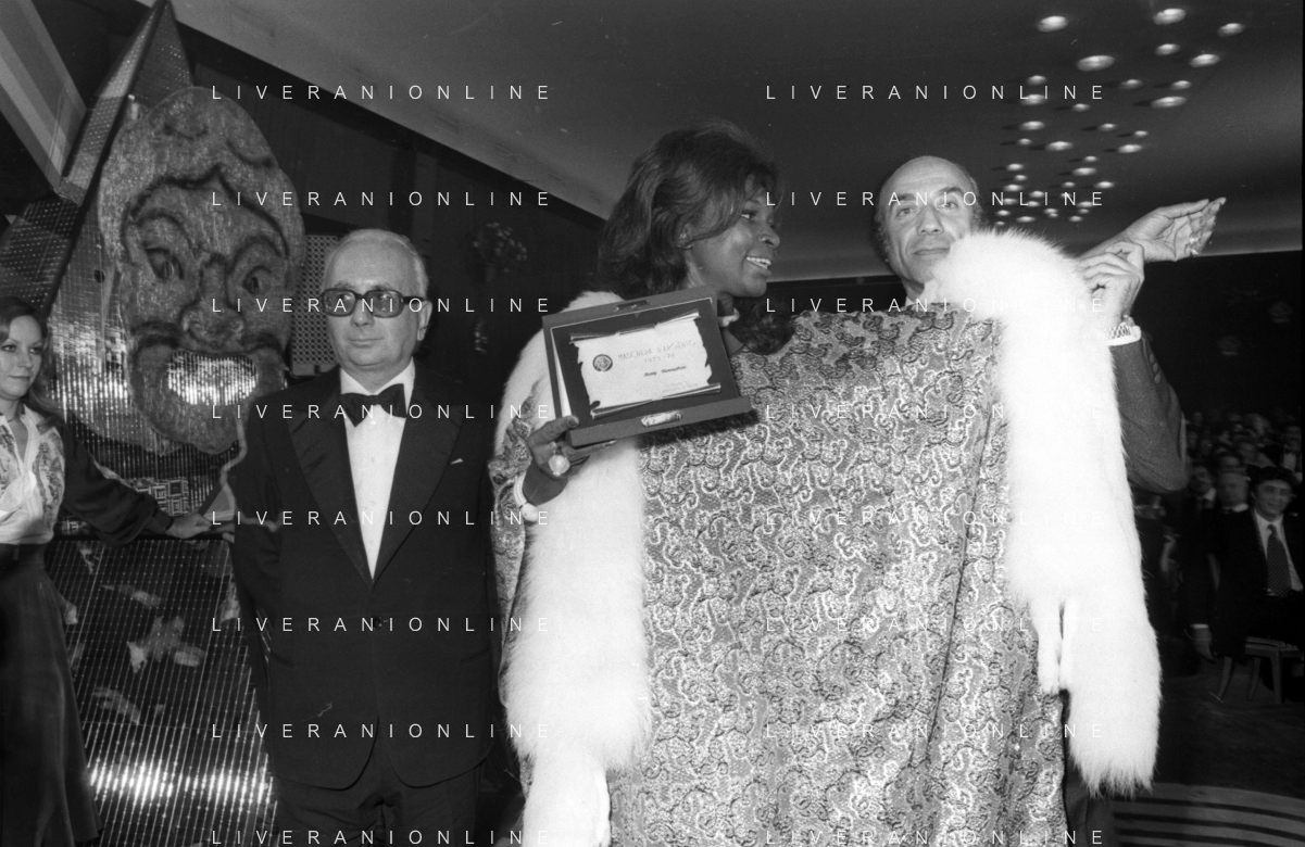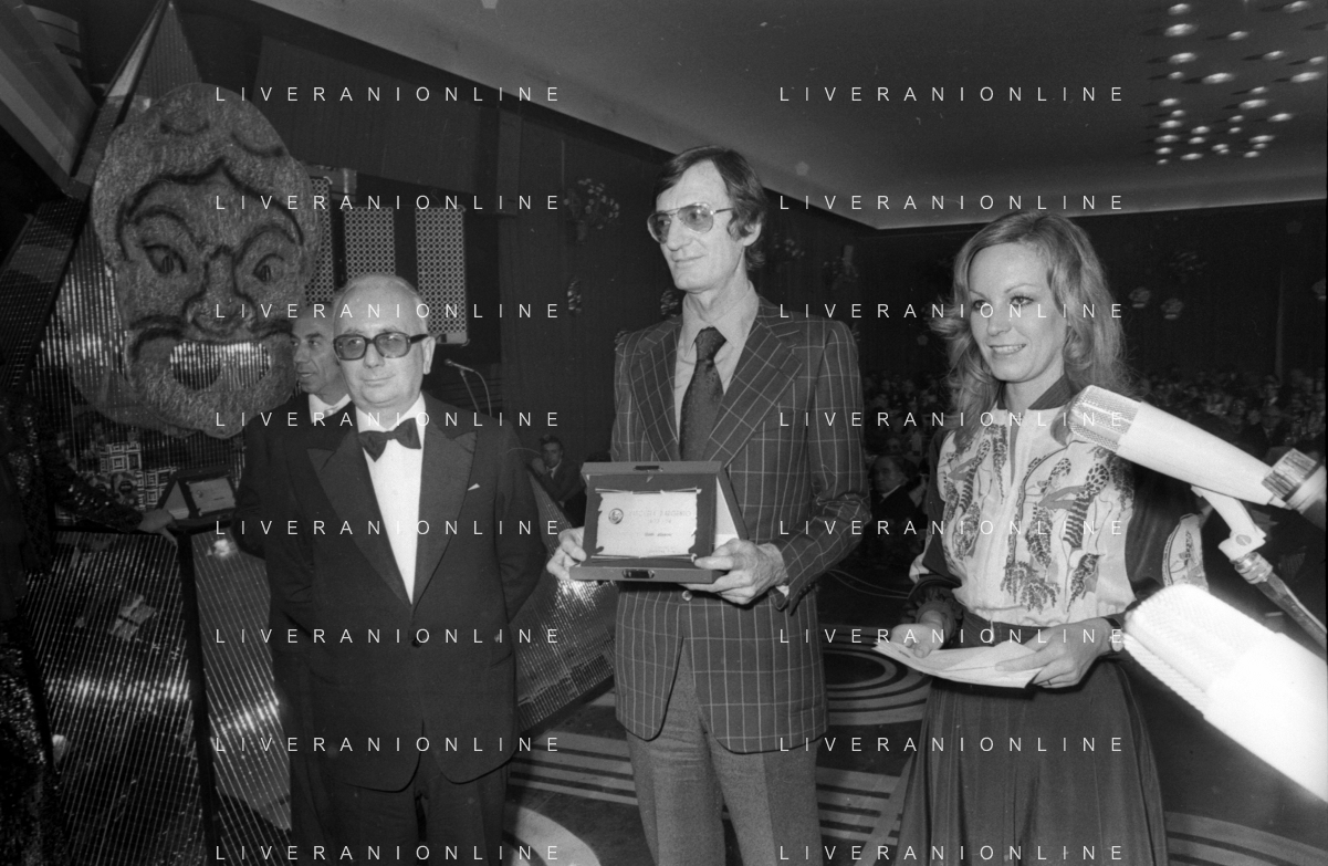 RETROSPETTIVA PREMIAZIONE DELLE MASCHERE D'ARGENTO A CAMPIONE D'ITALIA NELL'ANNO 1974 NELLA FOTO EDDIE CONSTANTINE CON WALTER CHIARI AG ALDO LIVERANI SAS
