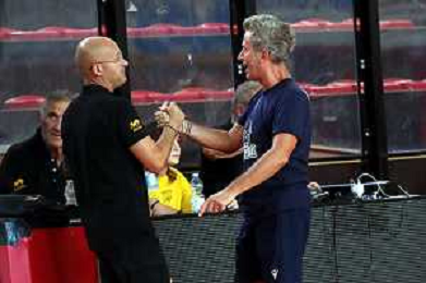 IMOLA 02 09 2023 AMICHEVOLE VIRTUS IMOLA BASKET-RAVENNA NELLA FOTO MARCO REGAZZI ALLENATORE DELLA VIRTUS IMOLA E MASSIMO BERNARDI ALLENATORE RAVENNA BASKET ©SANNA / AGENZIA ALDO LIVERANI SAS