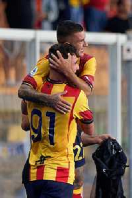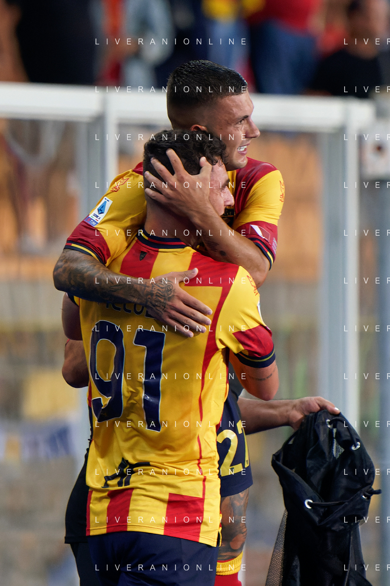Gabriel Strefezza (US Lecce) celebrates after scoring a goal with Roberto Piccoli (US Lecce) during the Italian soccer Serie A match US Lecce vs US Salernitana 1919 on September 3, 2023 at Via del Mare Stadium in Lecce, Italy. Photo by Emmanuele Mastrodonato/ag. Aldo Liverani sas/AGENZIA ALDO LIVERANI SAS