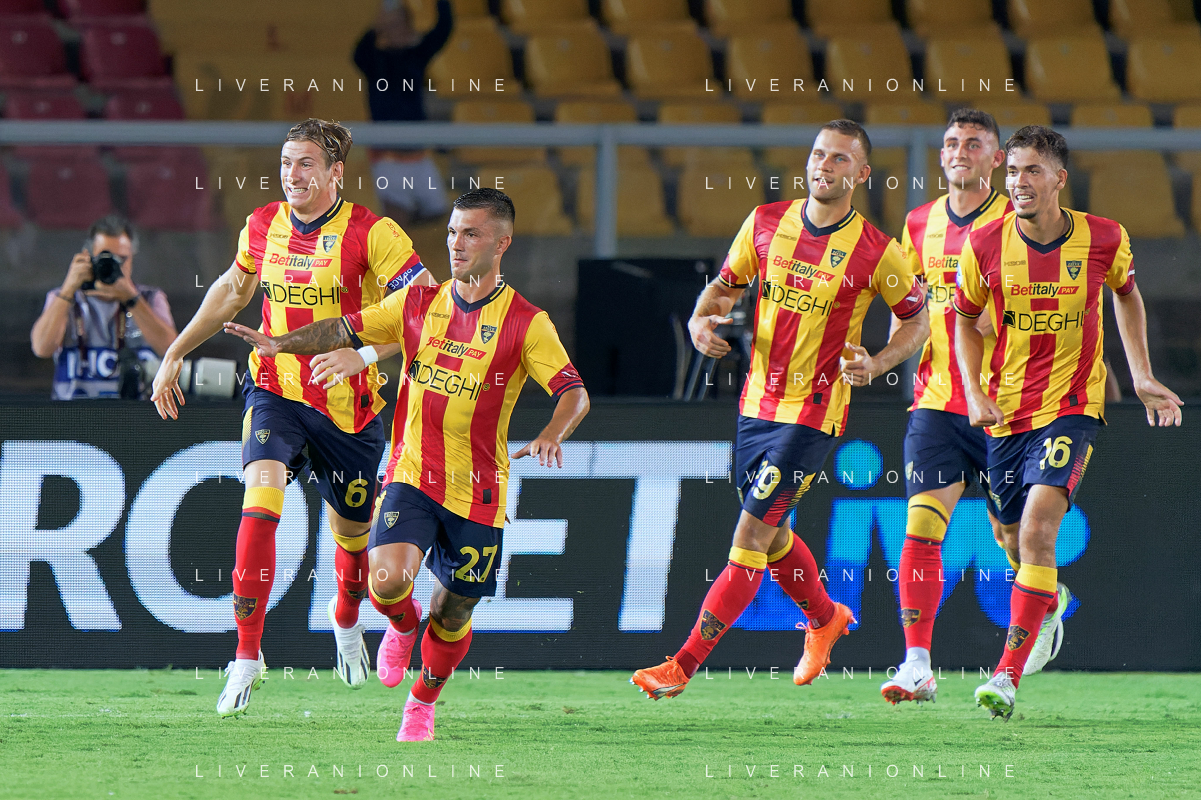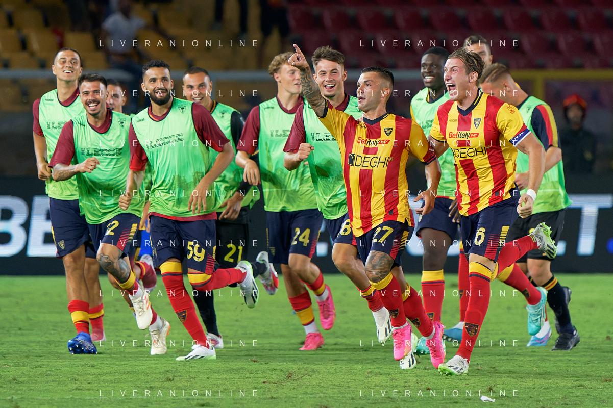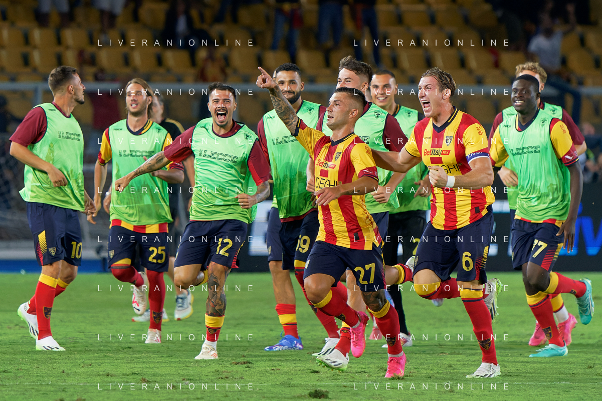 Gabriel Strefezza (US Lecce) celebrates after scoring a goal with teammates during the Italian soccer Serie A match US Lecce vs US Salernitana 1919 on September 3, 2023 at Via del Mare Stadium in Lecce, Italy. Photo by Emmanuele Mastrodonato/ag. Aldo Liverani sas/AGENZIA ALDO LIVERANI SAS