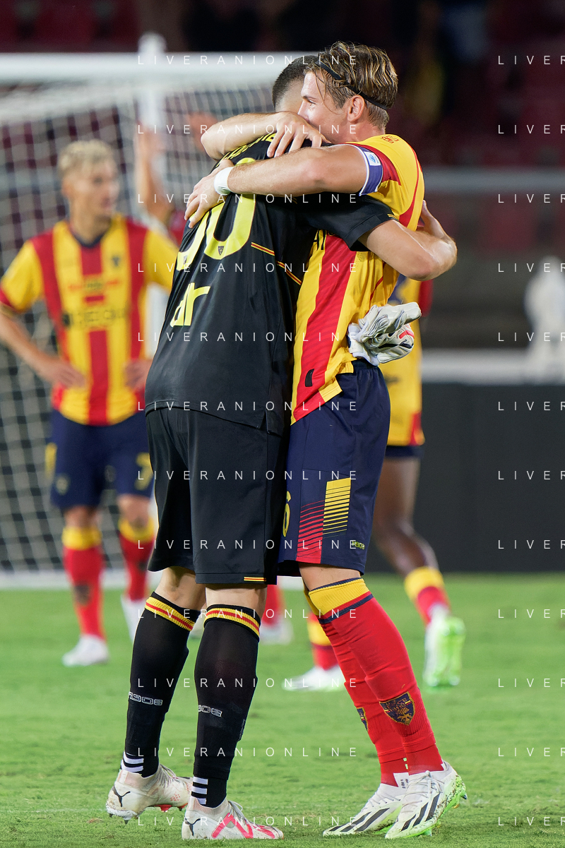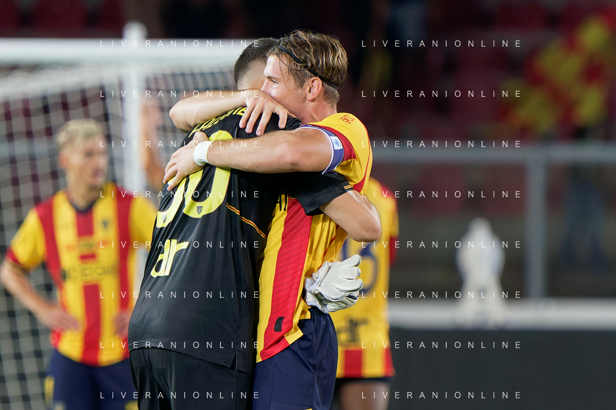 Federico Baschirotto (US Lecce) and Wladimiro Falcone (US Lecce) celebrates the victory during the Italian soccer Serie A match US Lecce vs US Salernitana 1919 on September 3, 2023 at Via del Mare Stadium in Lecce, Italy. Photo by Emmanuele Mastrodonato/ag. Aldo Liverani sas/AGENZIA ALDO LIVERANI SAS