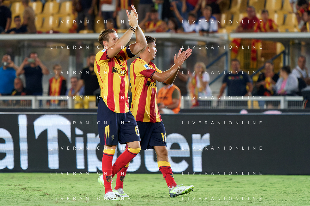 Federico Baschirotto (US Lecce) and Joan Gonzalez (US Lecce) applauds fans during the Italian soccer Serie A match US Lecce vs US Salernitana 1919 on September 3, 2023 at Via del Mare Stadium in Lecce, Italy. Photo by Emmanuele Mastrodonato/ag. Aldo Liverani sas/AGENZIA ALDO LIVERANI SAS