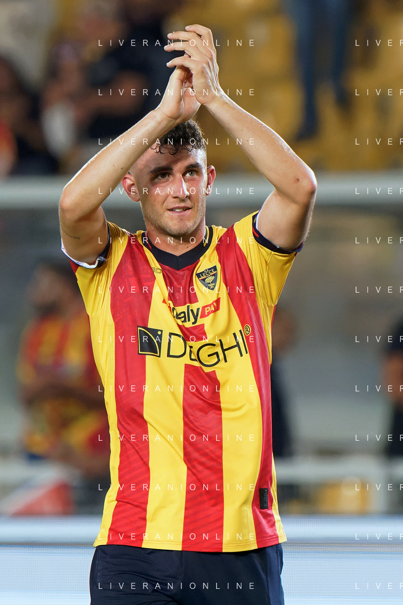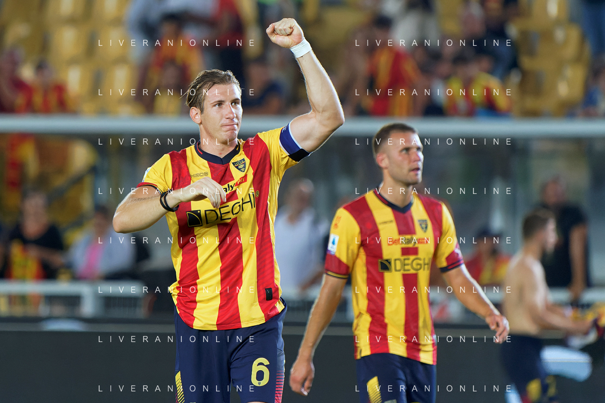 Federico Baschirotto (US Lecce) applauds fans during the Italian soccer Serie A match US Lecce vs US Salernitana 1919 on September 3, 2023 at Via del Mare Stadium in Lecce, Italy. Photo by Emmanuele Mastrodonato/ag. Aldo Liverani sas/AGENZIA ALDO LIVERANI SAS