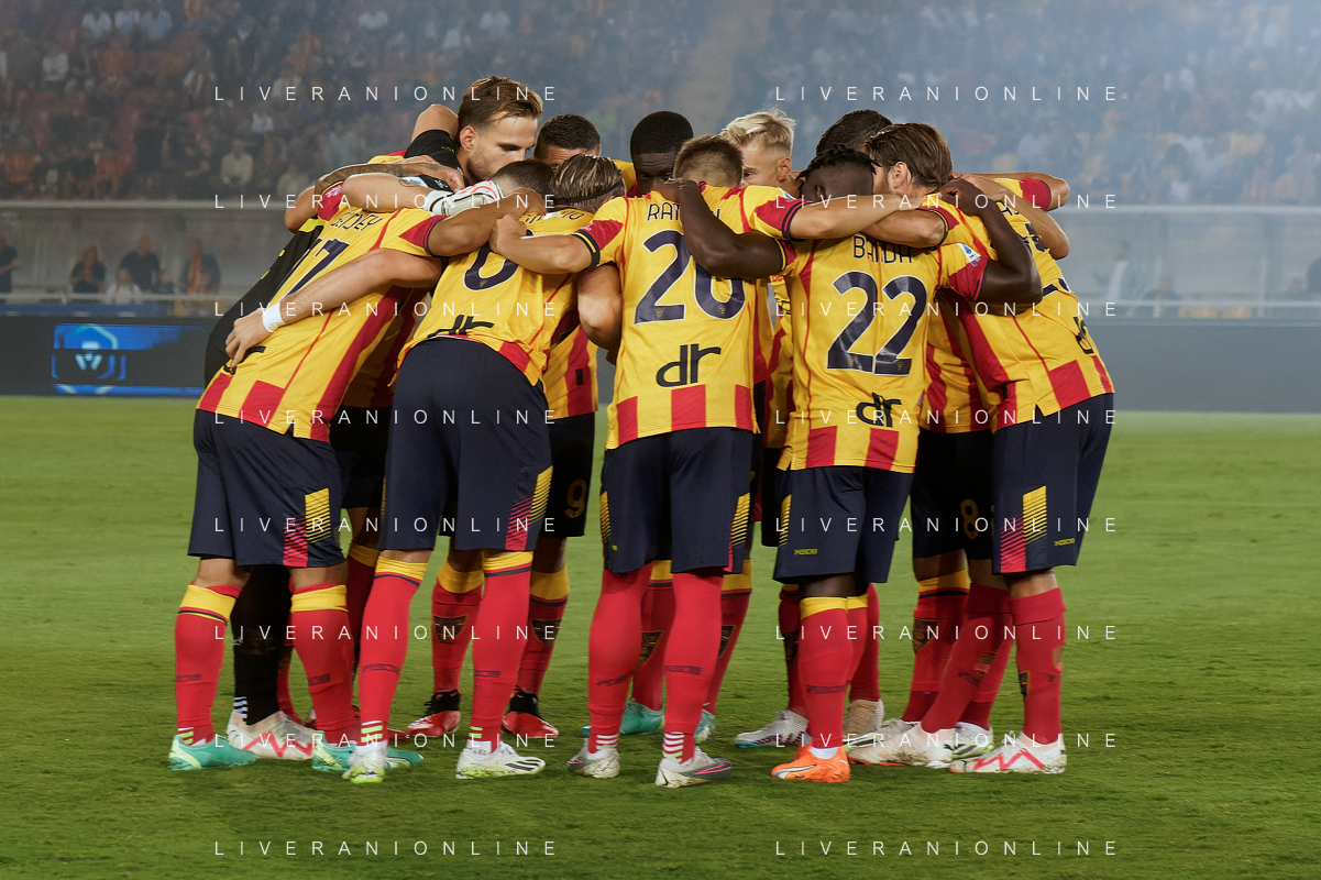 US Lecce players hug each other in a circle during the Italian soccer Serie A match US Lecce vs US Salernitana 1919 on September 3, 2023 at Via del Mare Stadium in Lecce, Italy. Photo by Emmanuele Mastrodonato/ag. Aldo Liverani sas/AGENZIA ALDO LIVERANI SAS
