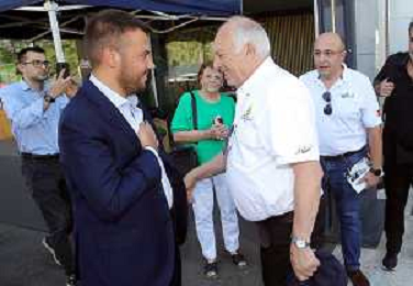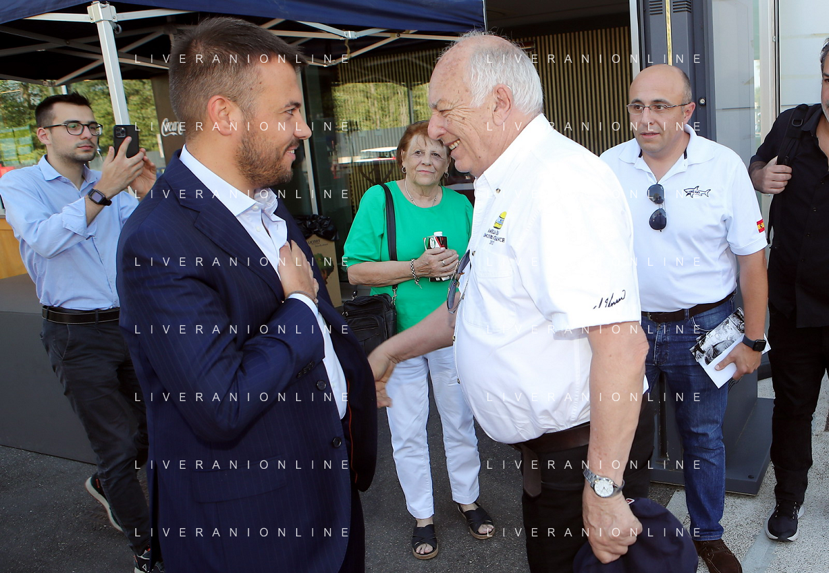 IMOLA 07 09 2023 AUTODROMO ENZO E DINO FERRARI JUAN E RUBEN FANGIO I FIGLI DEL CAMPIONE DELLA FORMULA 1 JUAN MANUEL FANGIO NELLA FOTO SINDACO MARCO PANIERI E RUBEN FANGIO FOTO GIANNI SANNA-AG ALDO LIVERANI SAS