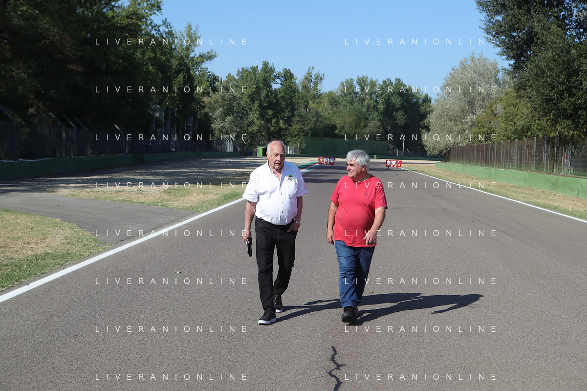 IMOLA 07 09 2023 AUTODROMO ENZO E DINO FERRARI JUAN E RUBEN FANGIO I FIGLI DEL CAMPIONE DELLA FORMULA 1 JUAN MANUEL FANGIO NELLA FOTO RUBEN E JUAN FANGO IN PISTA DIETRO LA CURVA TAMBURELLO DOVE E' MORTO AYRTON SENNA FOTO GIANNI SANNA-AG ALDO LIVERANI SAS