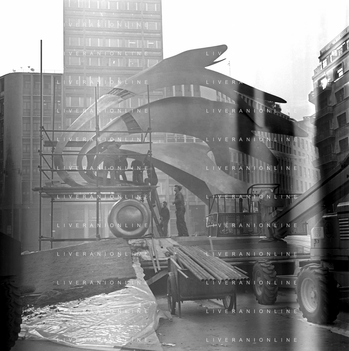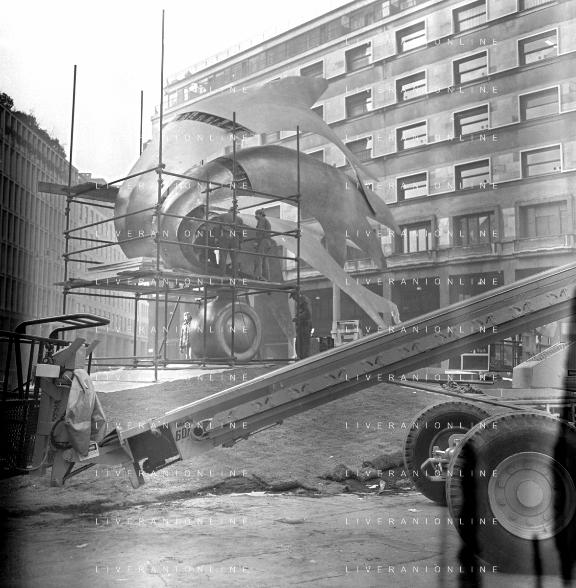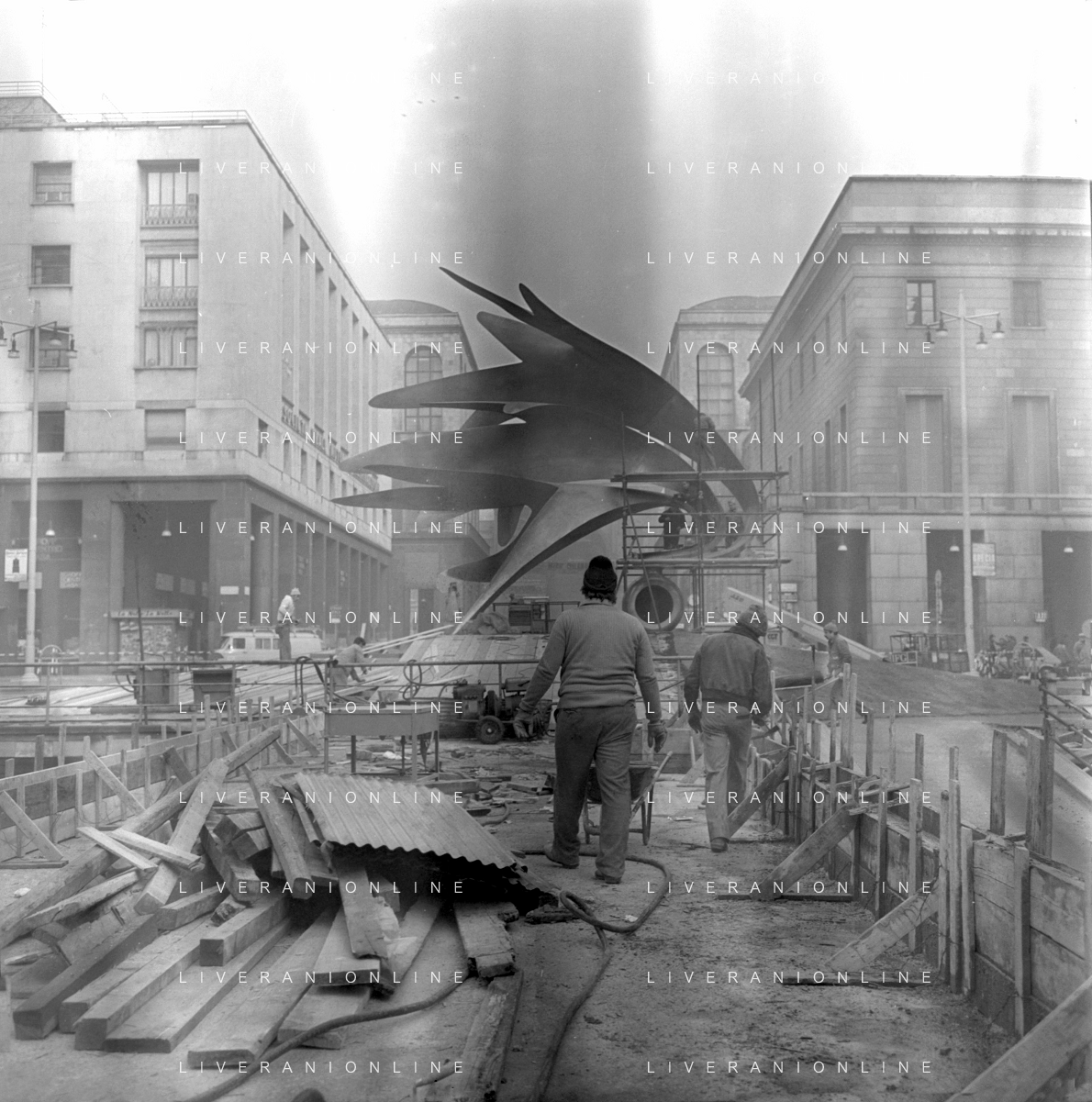 Neg- ESECUZIONE DEI LAVORI PER L'INSTALLAZIONE DEL MONUMENTO AL CARABINIERE (scultura di Luciano Minguzzi), IN PIAZZA DIAZ A MILANO IL 13 DICEMBRE 1981 AG ALDO LIVERANI SAS