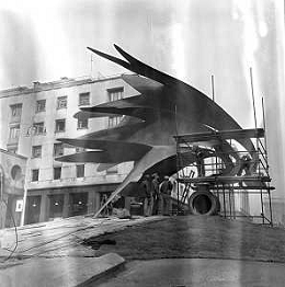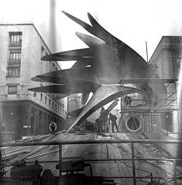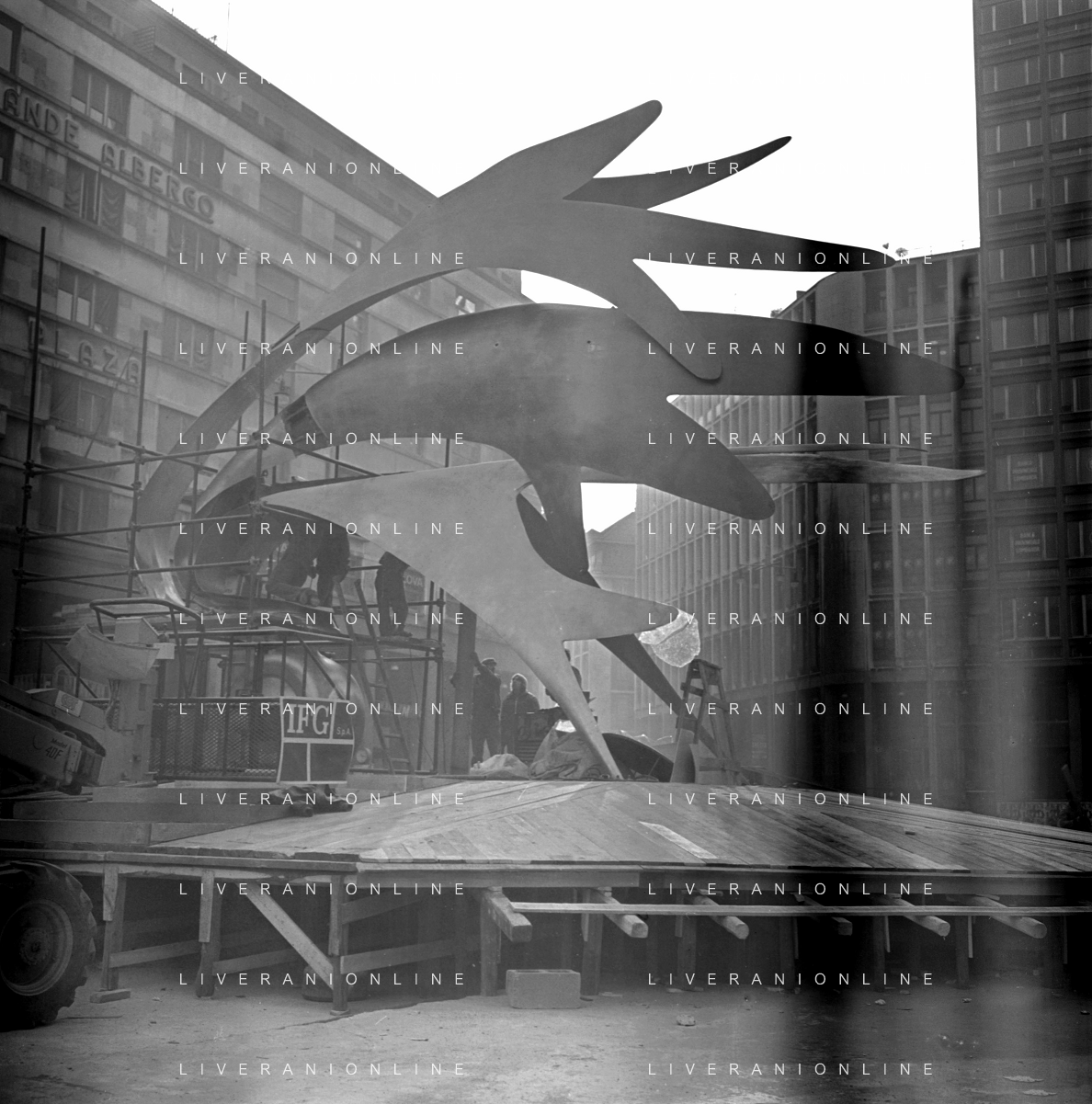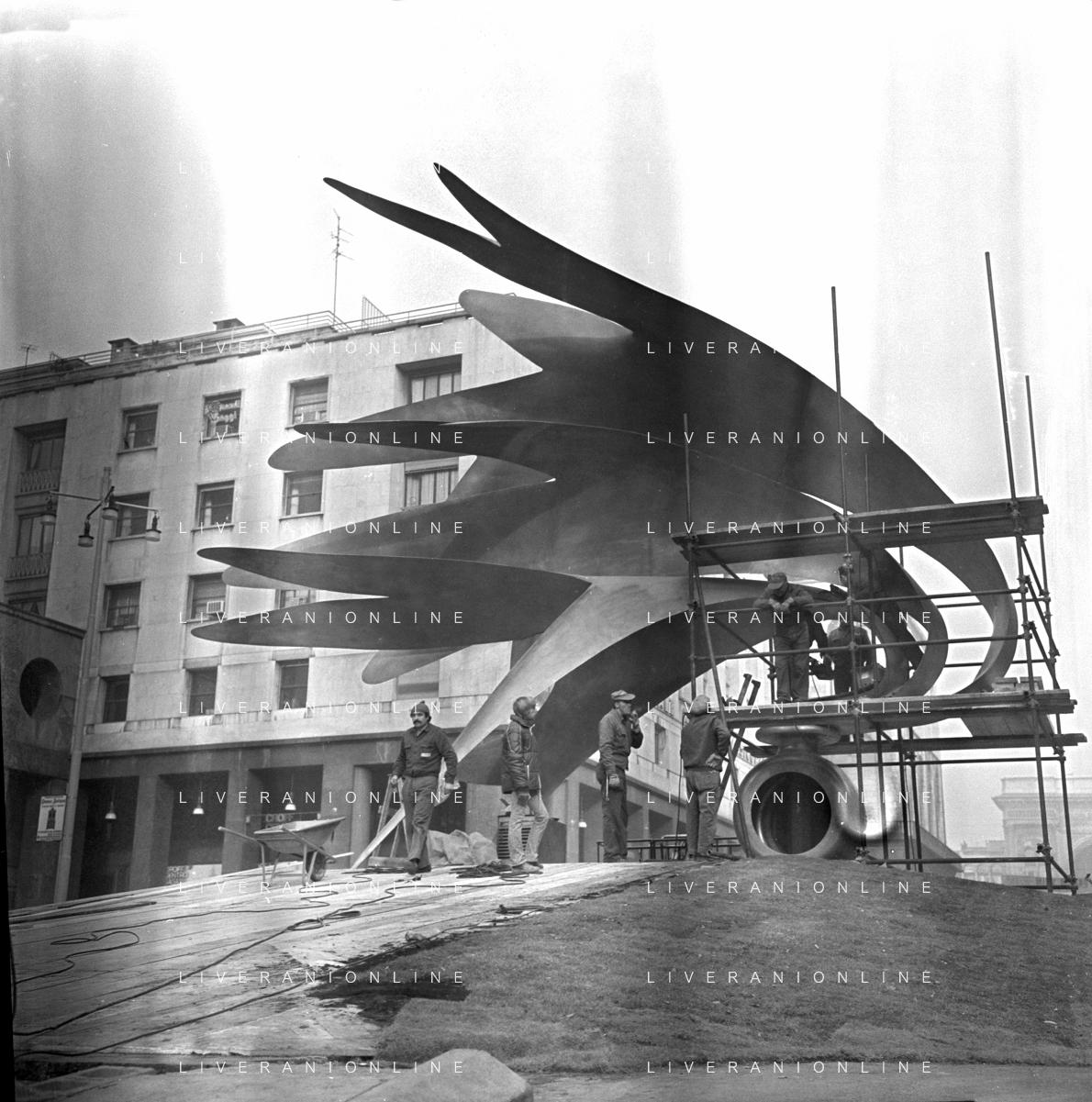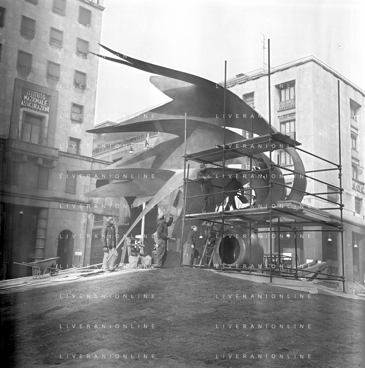 Neg- ESECUZIONE DEI LAVORI PER L'INSTALLAZIONE DEL MONUMENTO AL CARABINIERE (scultura di Luciano Minguzzi), IN PIAZZA DIAZ A MILANO IL 13 DICEMBRE 1981 AG ALDO LIVERANI SAS