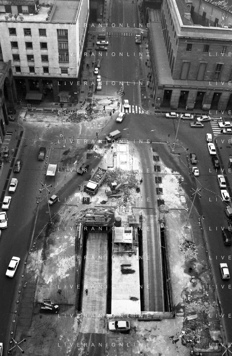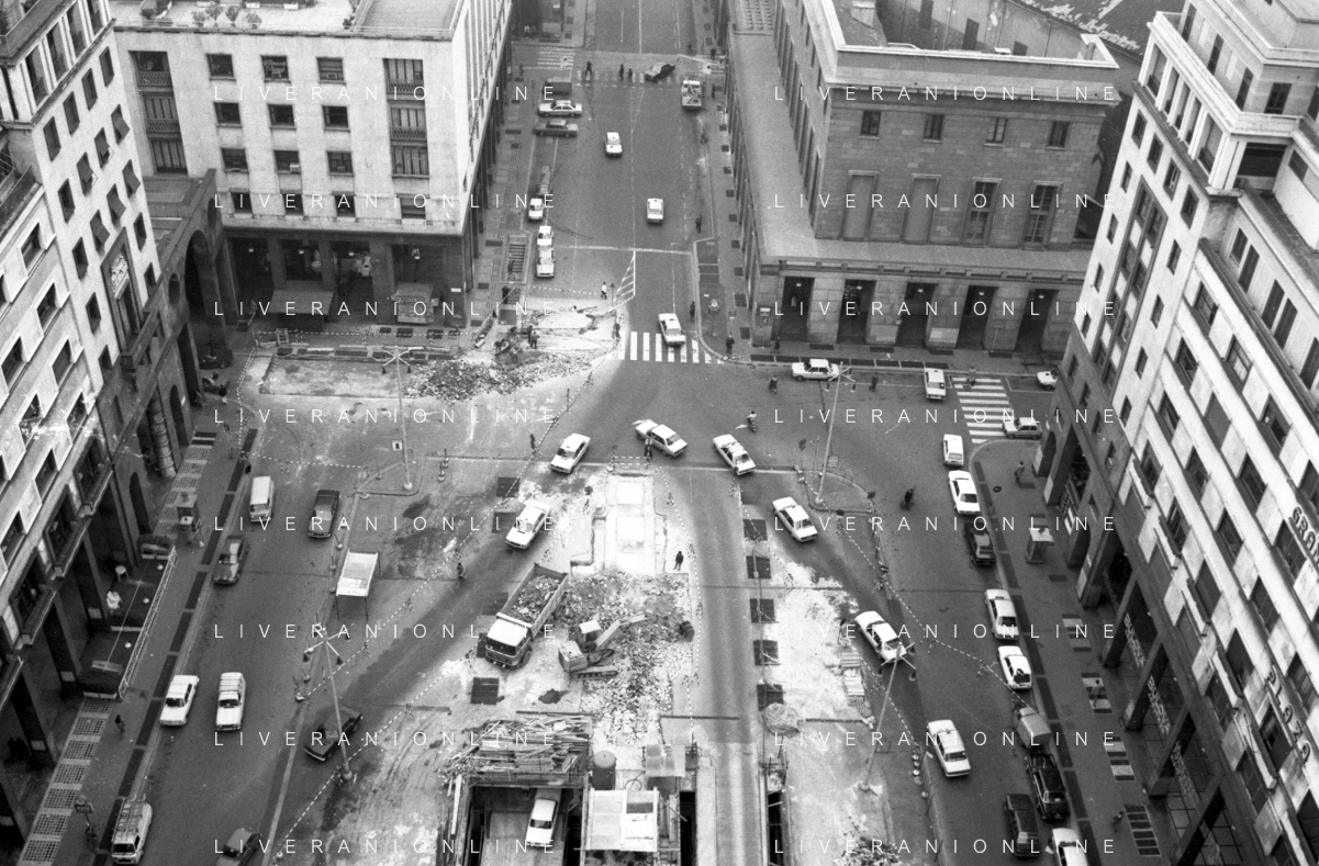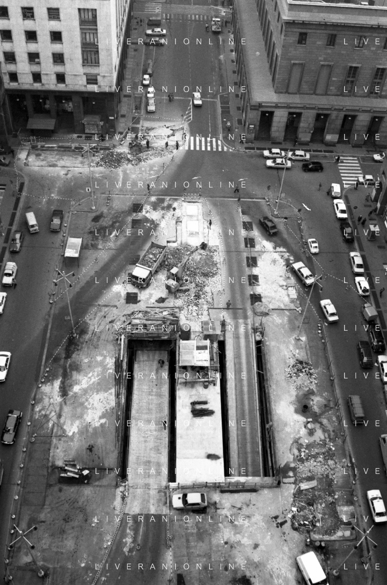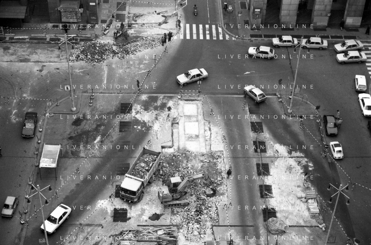 Neg- ESECUZIONE DEI LAVORI PER L'INSTALLAZIONE DEL MONUMENTO AL CARABINIERE (scultura di Luciano Minguzzi), IN PIAZZA DIAZ A MILANO IL 13 DICEMBRE 1981 NELLA FOTO VEDUTA DALL'ALTO AG ALDO LIVERANI SAS