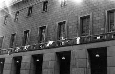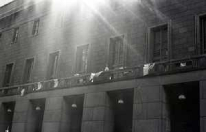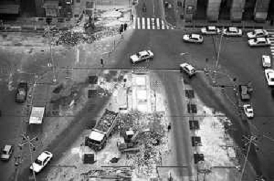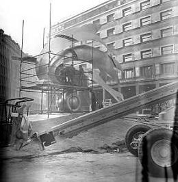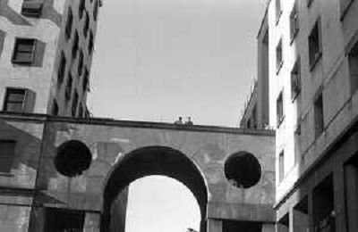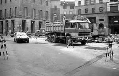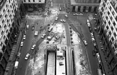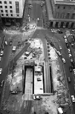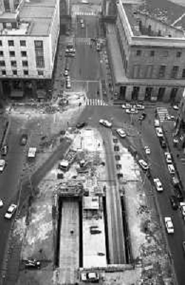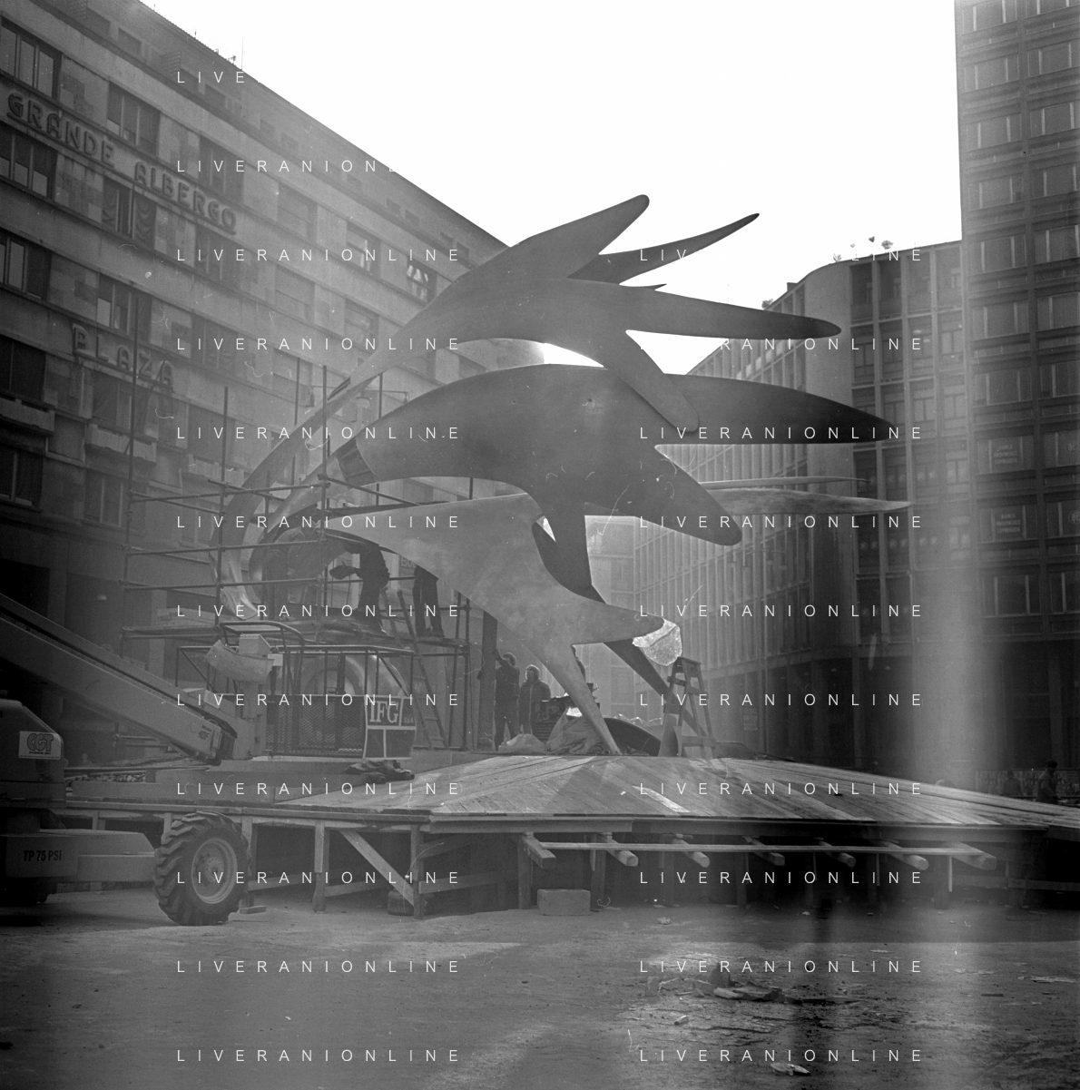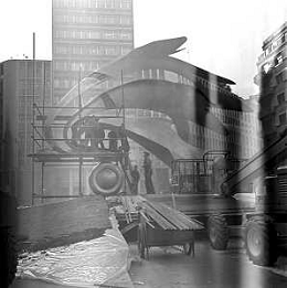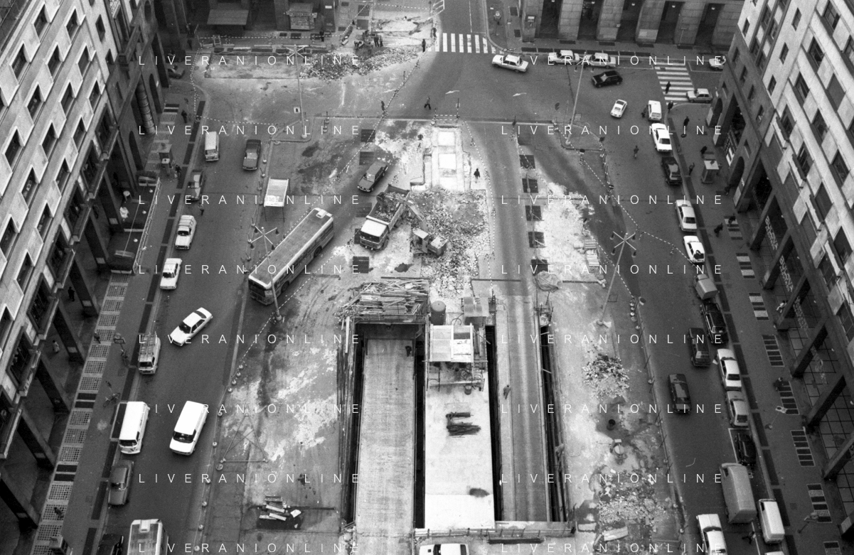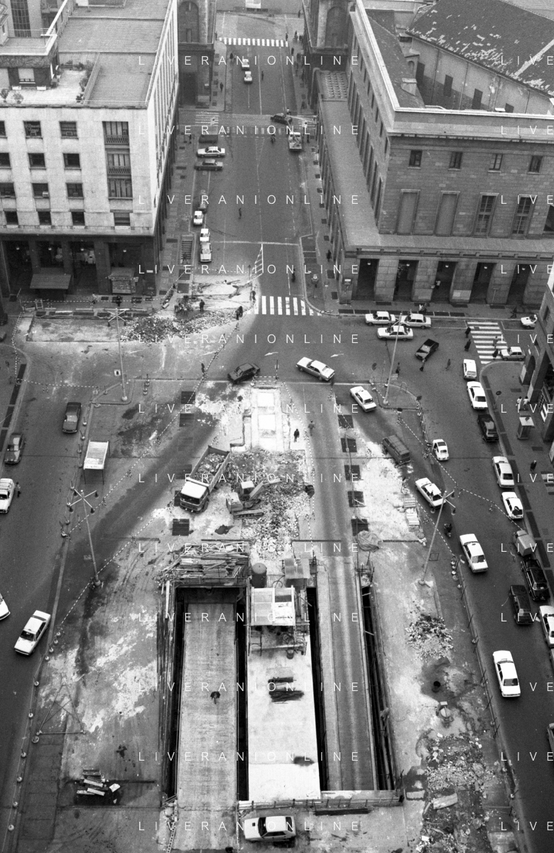 Neg- ESECUZIONE DEI LAVORI PER L'INSTALLAZIONE DEL MONUMENTO AL CARABINIERE (scultura di Luciano Minguzzi), IN PIAZZA DIAZ A MILANO IL 13 DICEMBRE 1981 NELLA FOTO VEDUTA DALL'ALTO AG ALDO LIVERANI SAS