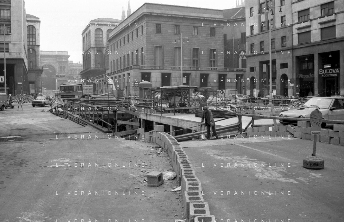 Neg- ESECUZIONE DEI LAVORI PER L'INSTALLAZIONE DEL MONUMENTO AL CARABINIERE (scultura di Luciano Minguzzi), IN PIAZZA DIAZ A MILANO IL 13 DICEMBRE 1981 NELLA FOTO CONTROLLI PER LE MISURE DI SICUREZZA AG ALDO LIVERANI SAS