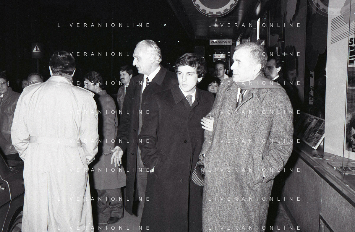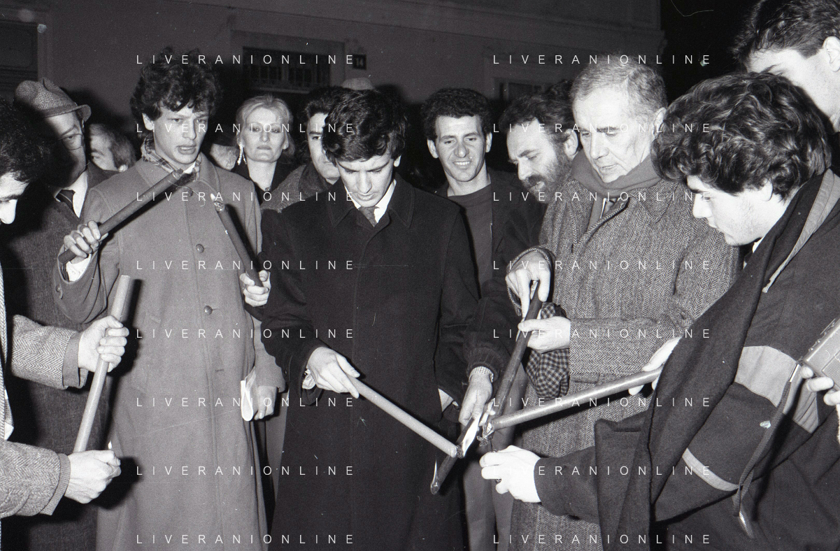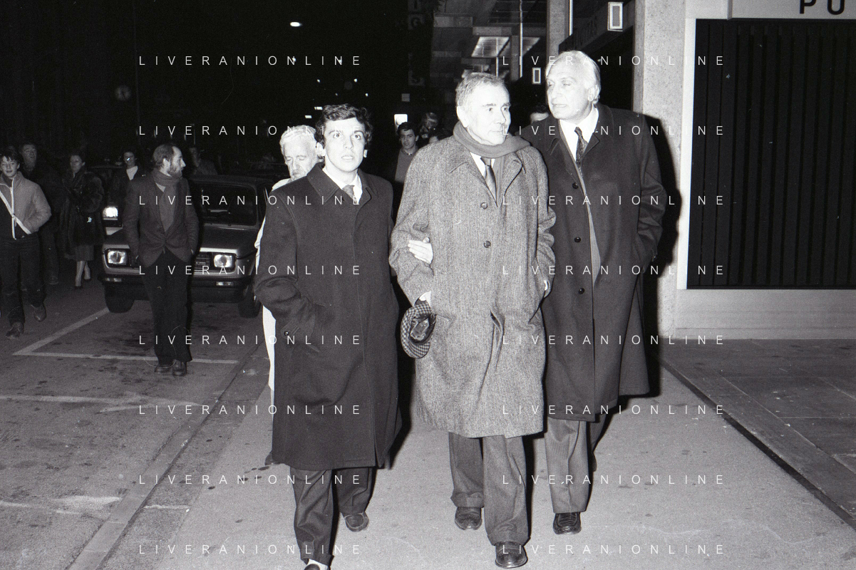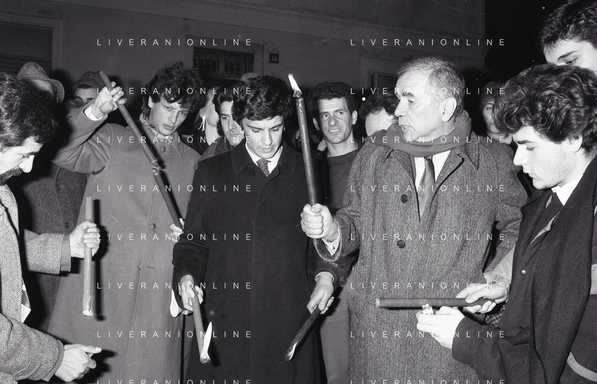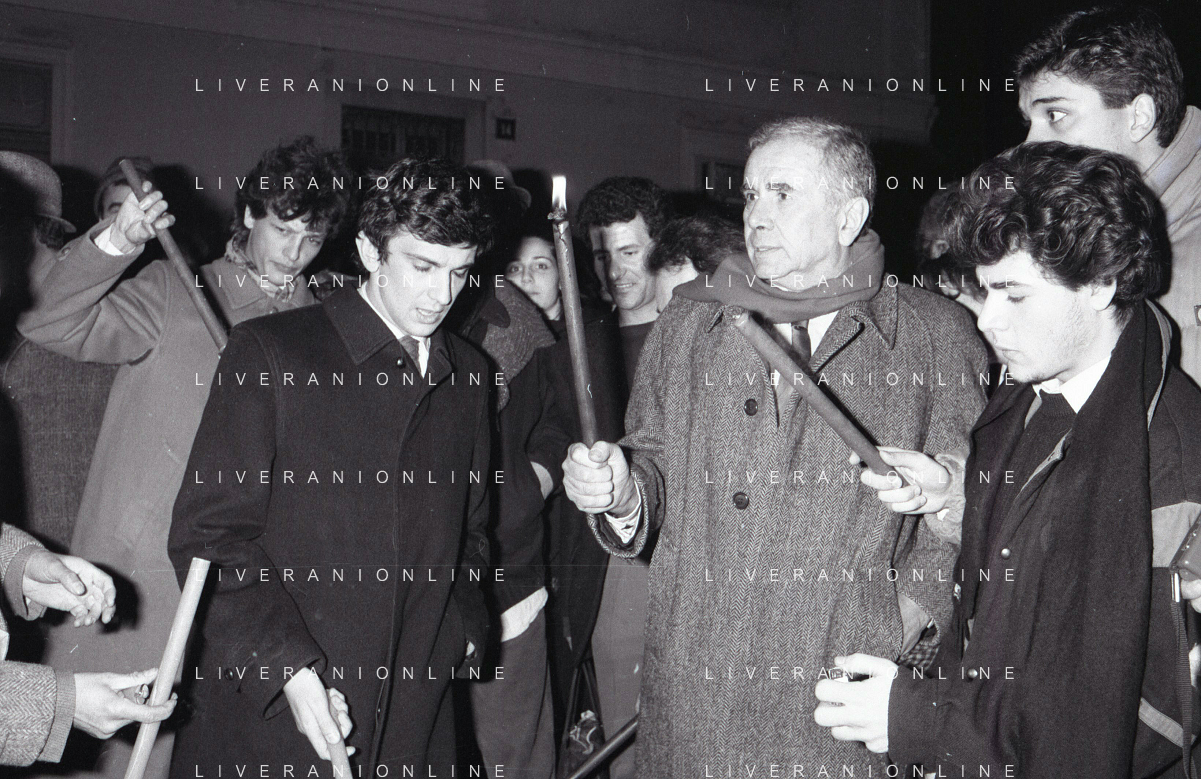 NEG-RETROSPETTIVA ENZO TORTORA PRESENTATORE TELEVISIVO-POLITICO E GIORNALISTA NELLA FOTO ENZO TORTORA CON GIOVANNI NEGRI E MARCO PANNELLA A UNA FIACCOLATA A MILANO NELL'ANNO 1985 AG ALDO LIVERANI SAS