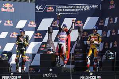 Gran Premio motociclistico di San Marino e della Riviera di Rimini 2023 Gara MotoGP - Misano 10.09.2023. Nella foto Jorge Martin vincitore, Francesco (Checco) Bagnaia Terzo Classificato e Marco Bezzecchi secondo Classificato sul podio ©Daniele Marangoni/AGENZIA ALDO LIVERANI SAS
