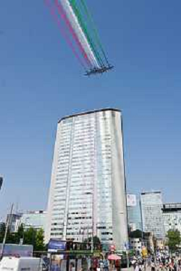 TVRG Frecce Tricolori Milano nella foto il sorvolo in piazza Duca d'Aosta Milano 11-09-2023 Passaggio sopra la citta' della Pattuglia Acrobatica Nazionale, le Frecce Tricolori, in occasione delle celebrazioni dei primi 100 anni di vita dell'Aeronautica Militare foto Roberto Garavaglia/ag. Aldo Liverani sas