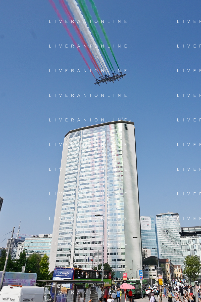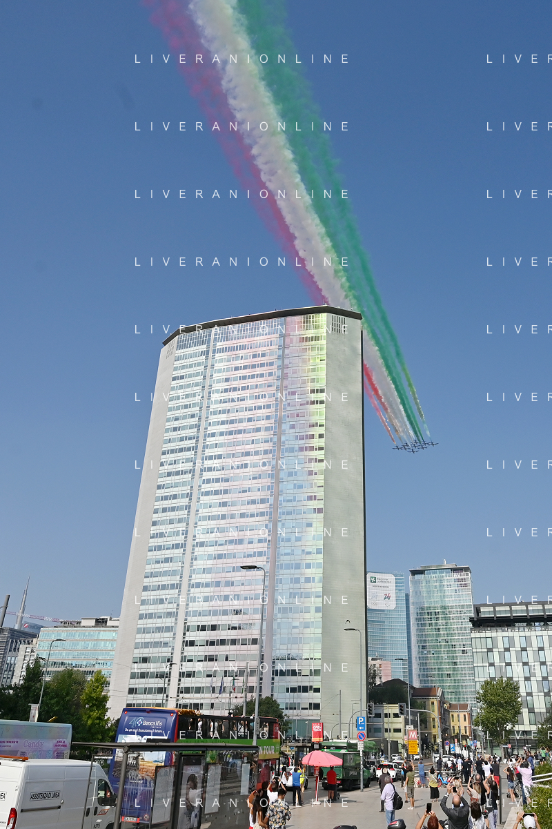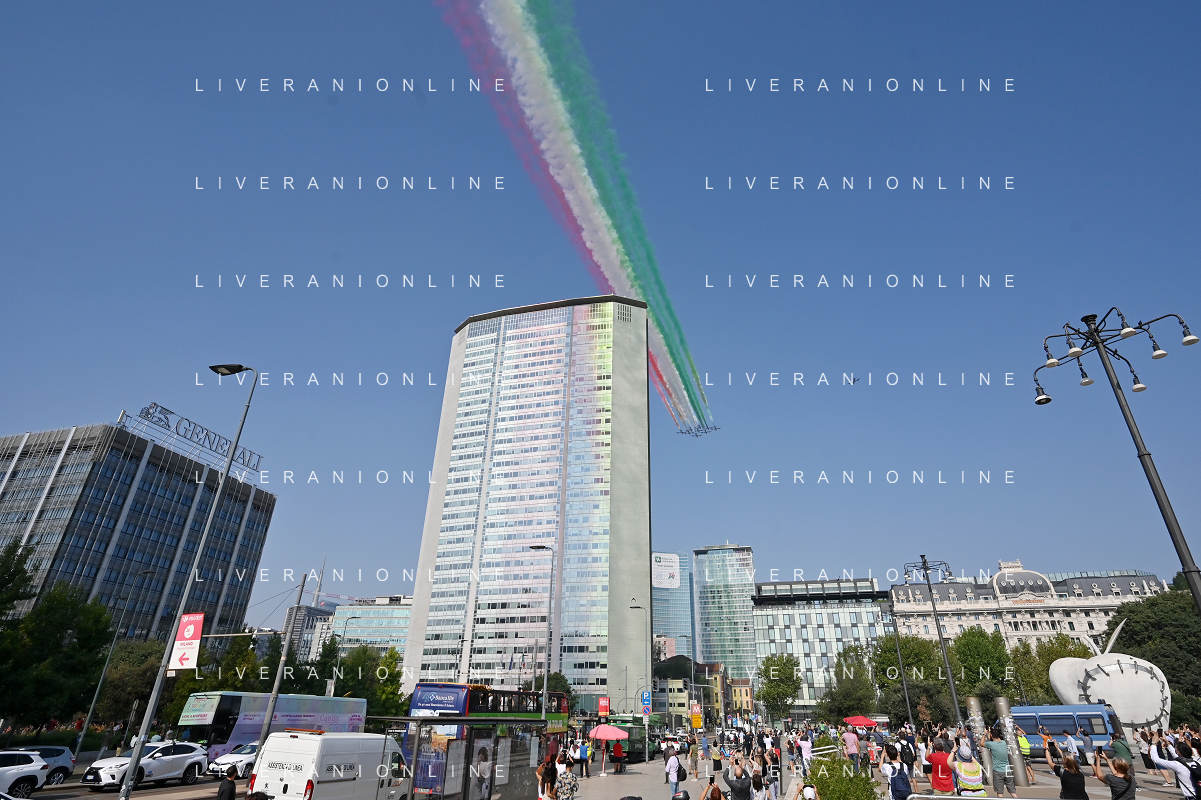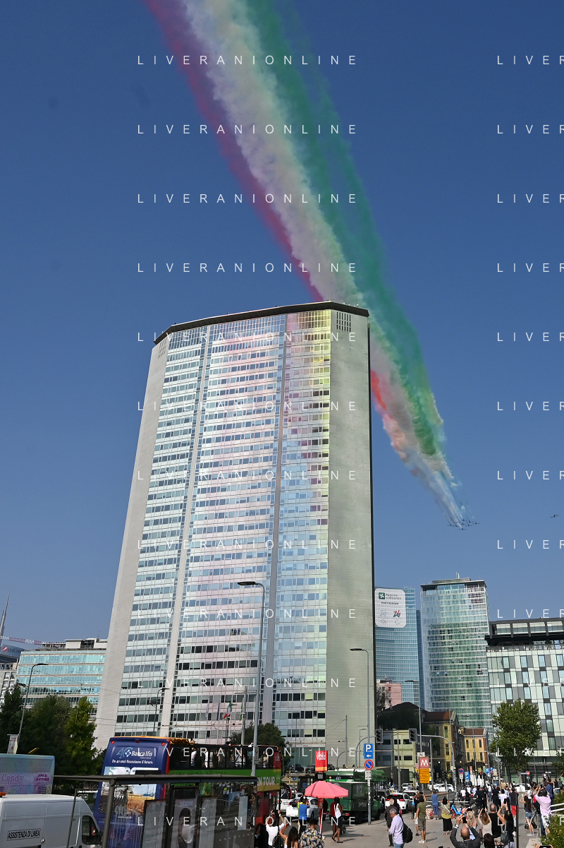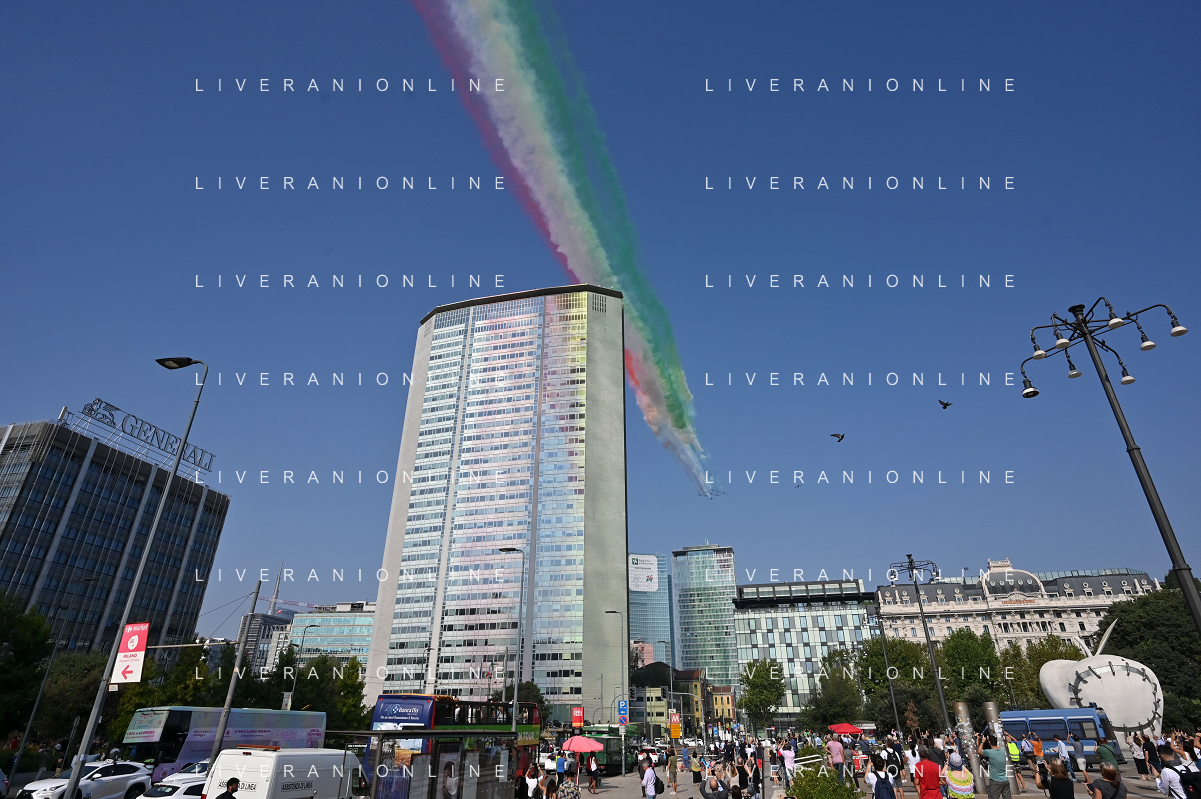 TVRG Frecce Tricolori Milano nella foto il sorvolo in piazza Duca d'Aosta sopra il grattacielo Pirelli Milano 11-09-2023 Passaggio sopra la citta' della Pattuglia Acrobatica Nazionale, le Frecce Tricolori, in occasione delle celebrazioni dei primi 100 anni di vita dell'Aeronautica Militare foto Roberto Garavaglia/ag. Aldo Liverani sas