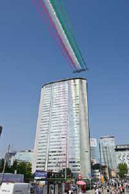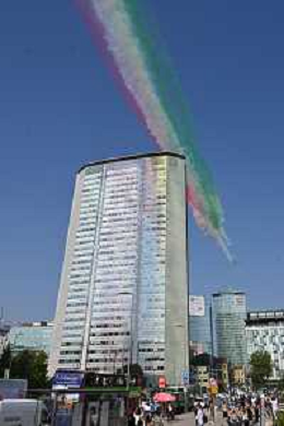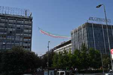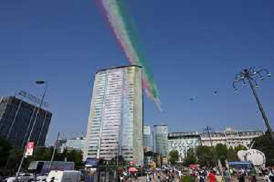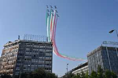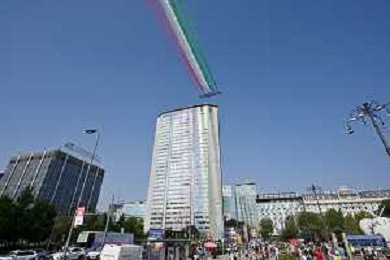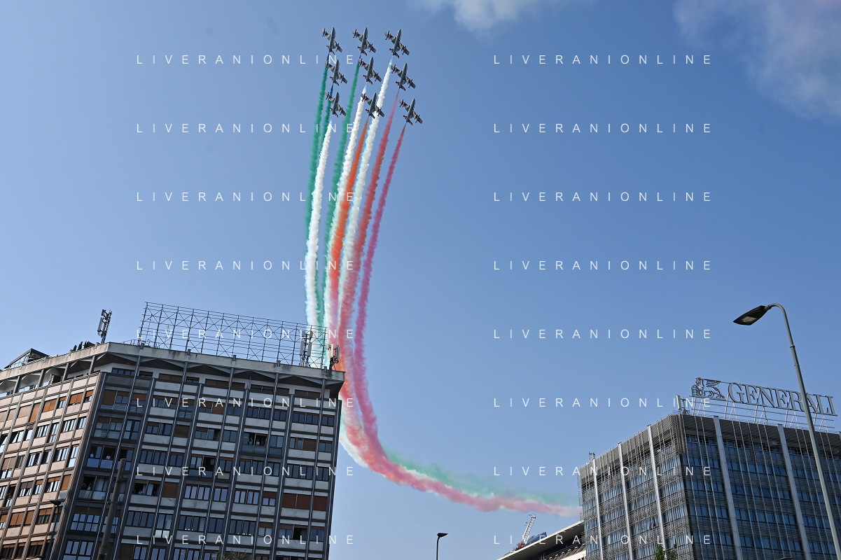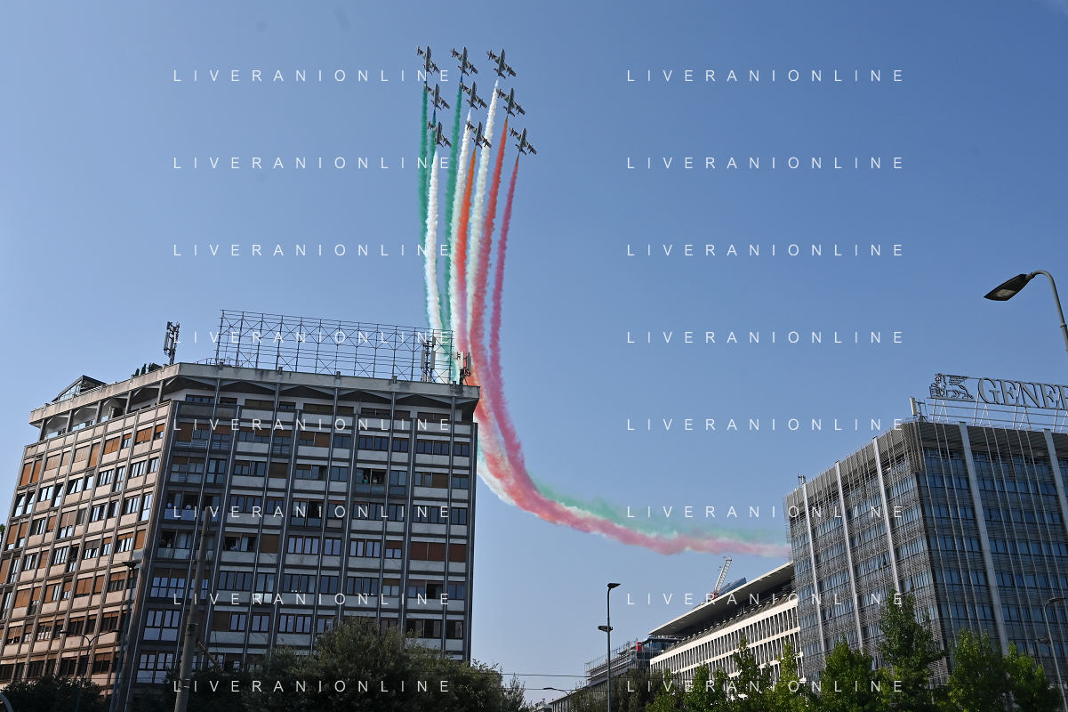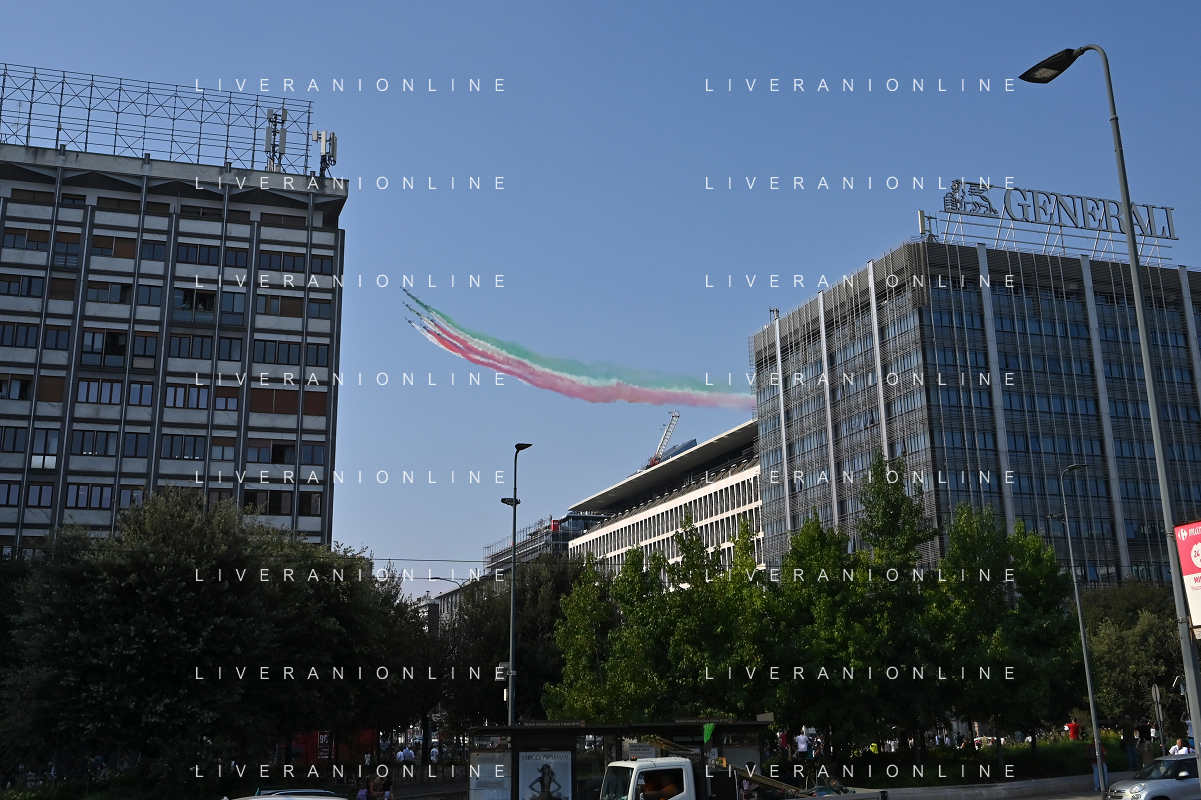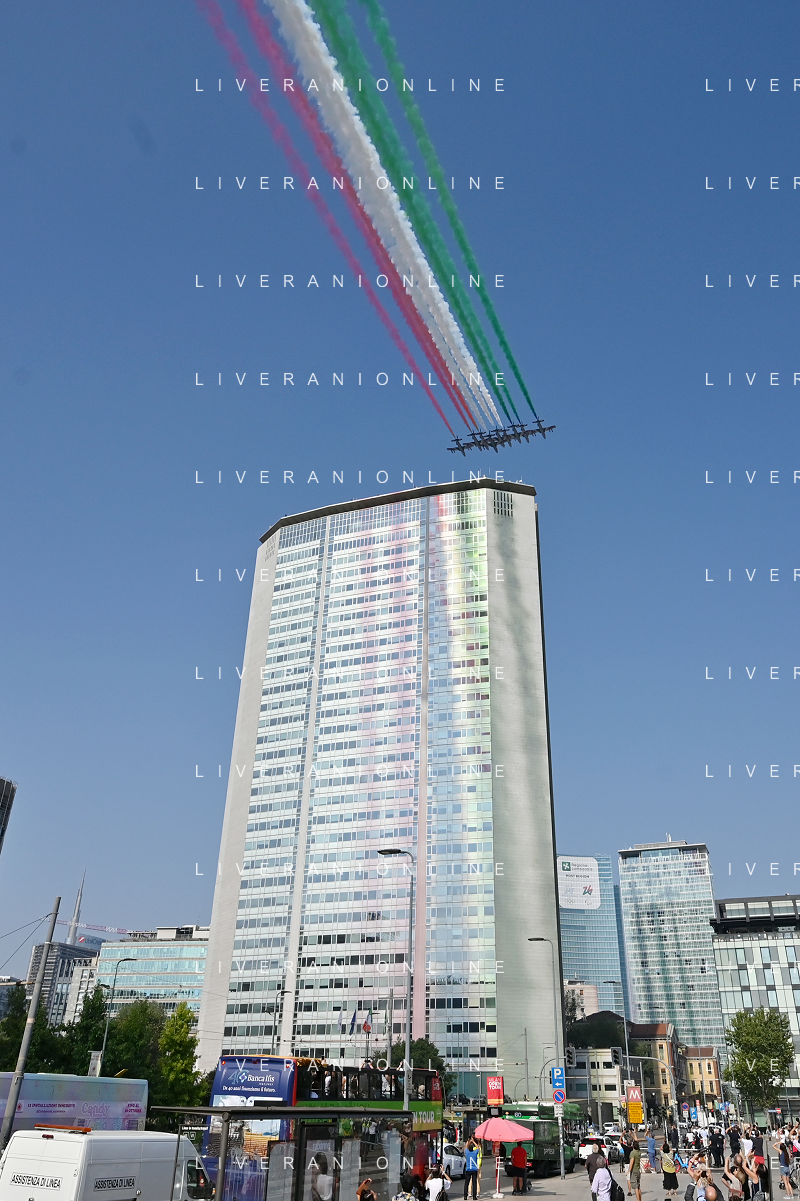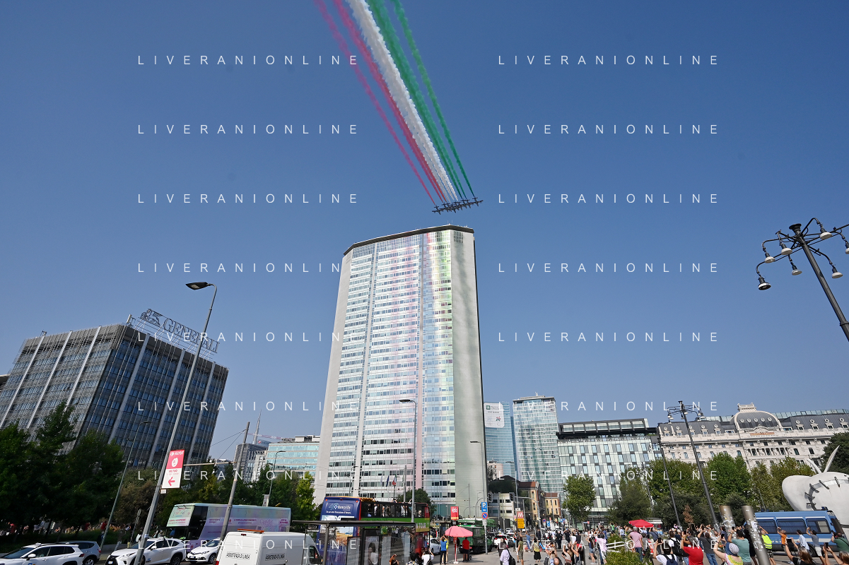 TVRG Frecce Tricolori Milano nella foto il sorvolo in piazza Duca d'Aosta sopra il grattacielo Pirelli Milano 11-09-2023 Passaggio sopra la citta' della Pattuglia Acrobatica Nazionale, le Frecce Tricolori, in occasione delle celebrazioni dei primi 100 anni di vita dell'Aeronautica Militare foto Roberto Garavaglia/ag. Aldo Liverani sas