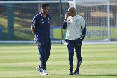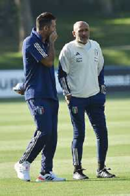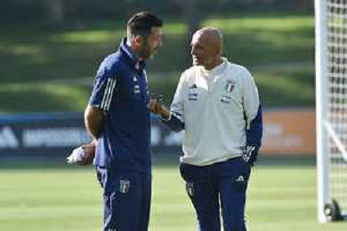 TVRG Allenamento Italia nella foto Gianluigi Buffon SX capo delegazione Italia e Luciano Spalletti DX allenatore Italia Carnago (VA) 11-09-2023 Allenamento della Nazionale Italiana presso il centro sportivo di Milanello in preparazione della gara contro l'Ucraina valevole per le qualificazioni a UEFA Euro 2024 foto Roberto Garavaglia/ag. Aldo Liverani sas