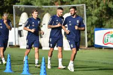 TVRG Allenamento Italia nella foto da SX Nicolo' Barella (Italia), Cristiano Biraghi (Italia) e Bryan Cristante (Italia) Carnago (VA) 11-09-2023 Allenamento della Nazionale Italiana presso il centro sportivo di Milanello in preparazione della gara contro l'Ucraina valevole per le qualificazioni a UEFA Euro 2024 foto Roberto Garavaglia/ag. Aldo Liverani sas