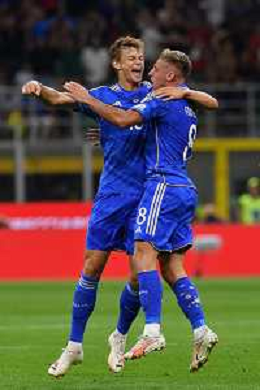 TVMV-Milano 12.09.2023 Stadio Giuseppe Meazza ©Manuela Viganti/Agenzia Aldo Liverani Italia vs Ucraina Qualificazioni Europeo 2024 Nella foto: esultanza davide frattesi e giorgio scalvini ©Viganti/AGENZIA ALDO LIVERANI SAS