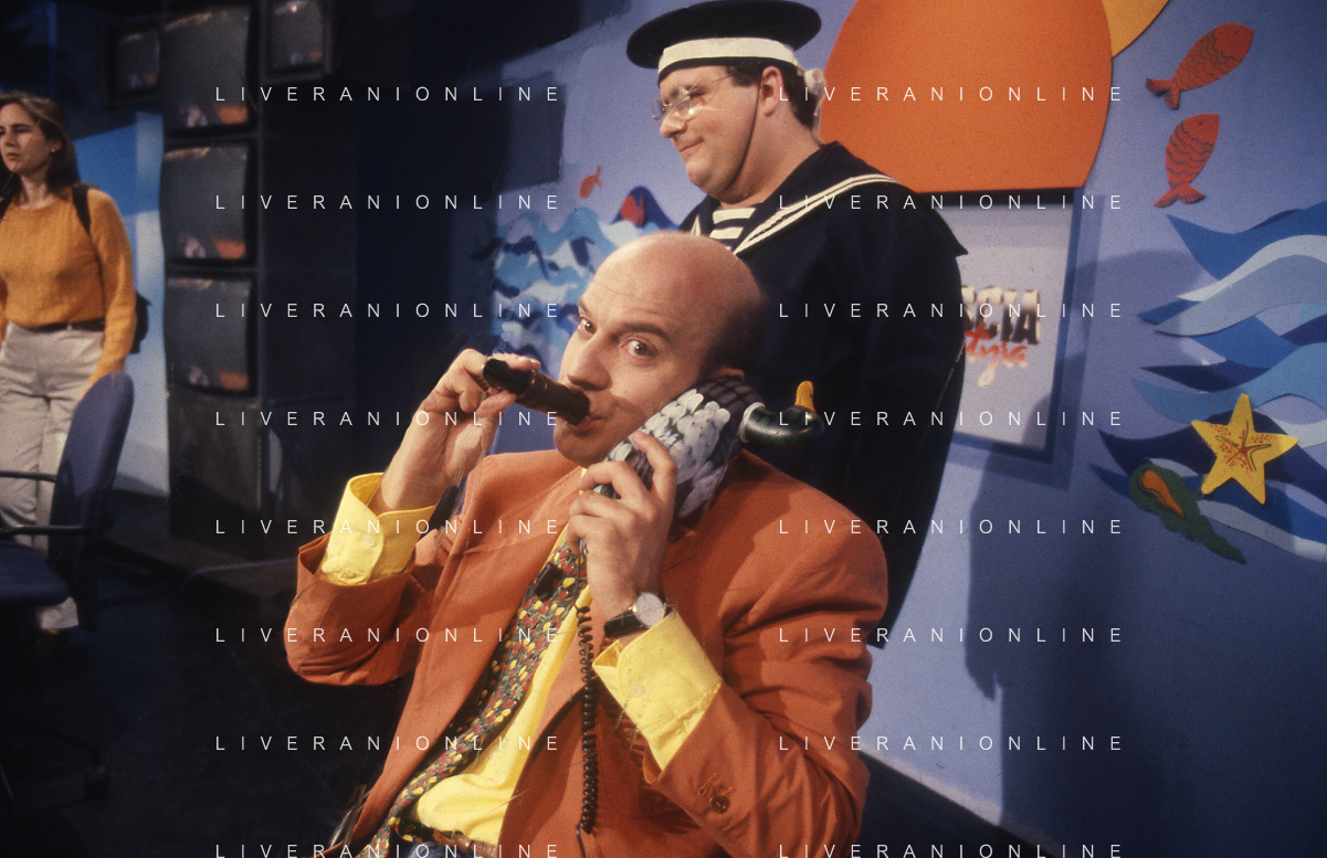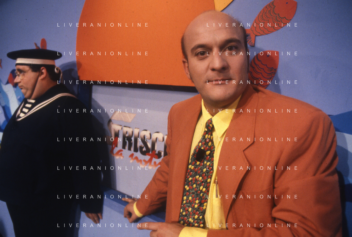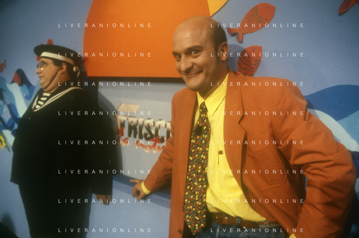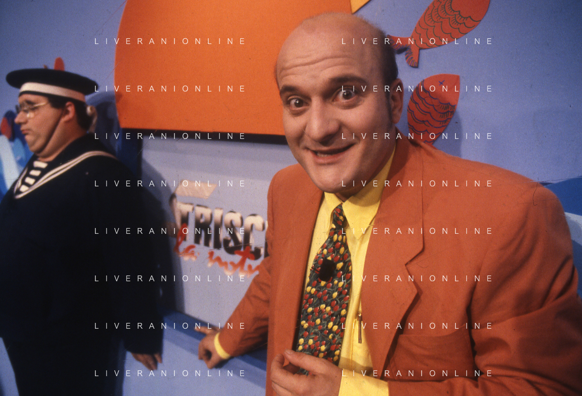 DIAP-RETROSPETTIVA CLAUDIO BISIO ATTORE NELLA FOTO CLAUDIO BISIO CON GIANNI FANTONI CONUCE LA TRASMISSIONE TELEVISIVA STRISCIA LA NOTIZIA NELL'ANNO 1992 A MILANO AG ALDO LIVERANI SAS