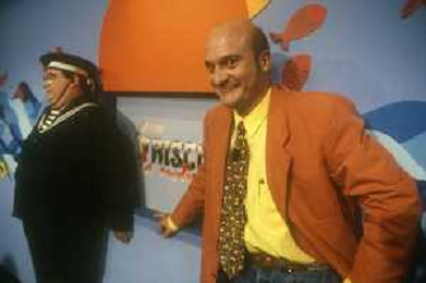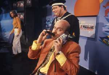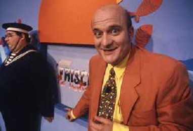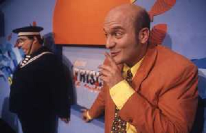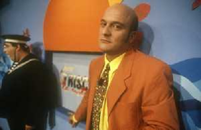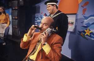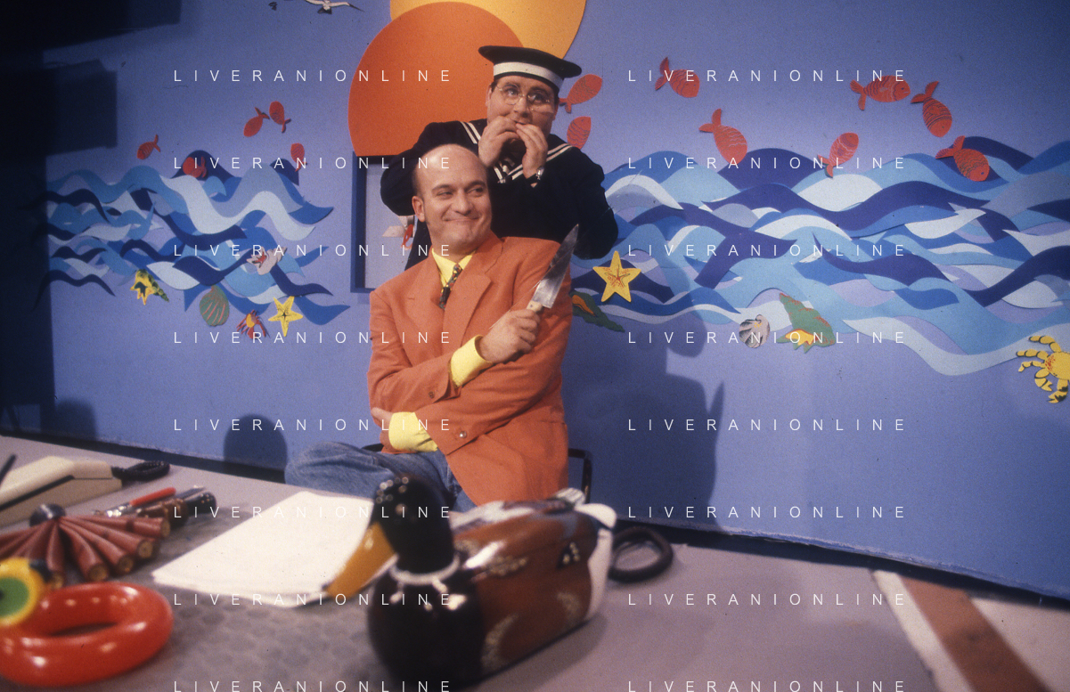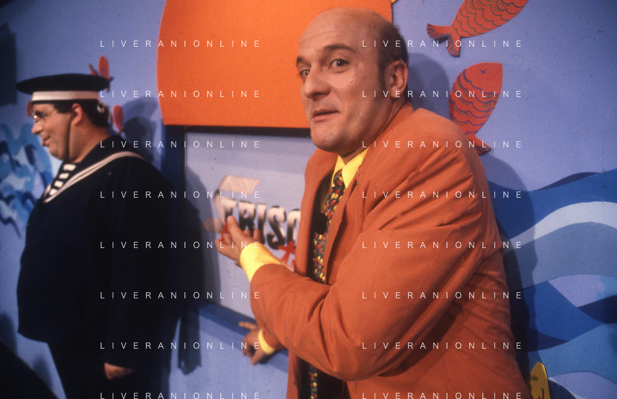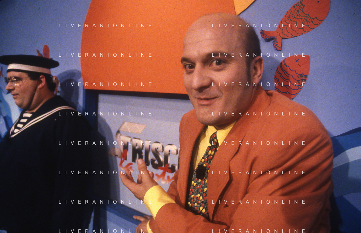 DIAP-RETROSPETTIVA CLAUDIO BISIO ATTORE NELLA FOTO CLAUDIO BISIO CON GIANNI FANTONI CONUCE LA TRASMISSIONE TELEVISIVA STRISCIA LA NOTIZIA NELL'ANNO 1992 A MILANO AG ALDO LIVERANI SAS