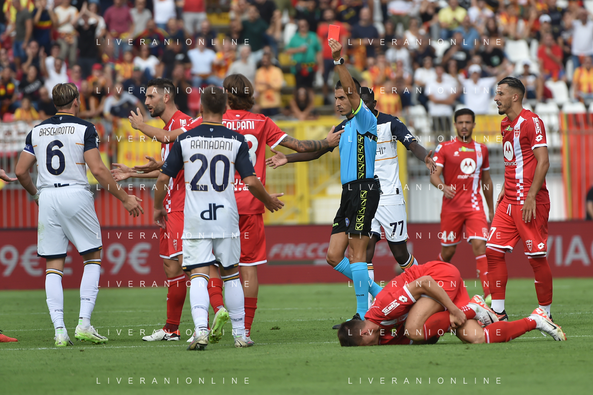 TVRG Monza vs Lecce nella foto Federico Baschirotto (Lecce) a SX viene espulso dall'arbitro Livio Marinelli di Tivoli (Roma) Monza 17-09-2023 U-Power Stadium Campionato Serie A TIM - 4a giornata foto Roberto Garavaglia/ag. Aldo Liverani sas