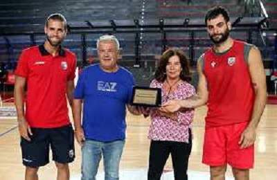 IMOLA 23 09 2023 2∞MEMORIAL ANDREA CEMBALLI ANDREA COSTA BASKET-SAN VENDEMIANO NELLA FOTO CAPITANO DELL'IMOLESE CALCIO LORENZO DALL'OSSO E CAPITANO DELL'ANDREA COSTA BASKET NUNZIO CORCELLI CONSEGNANO AI GENITORI DI ANDREA CEMBALLI UNA TARGHA A RICORDO ©SANNA /AGENZIA ALDO LIVERANI SAS