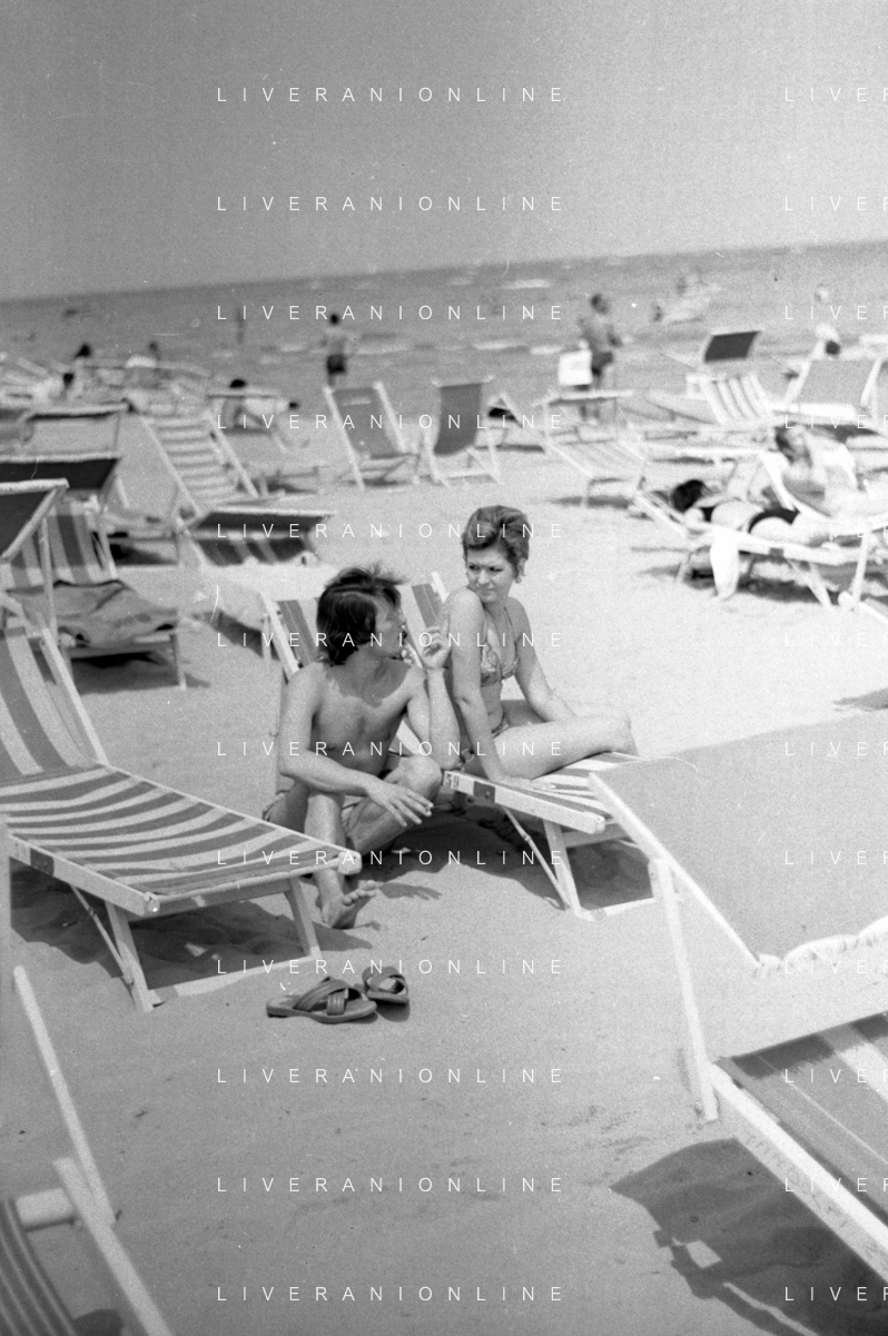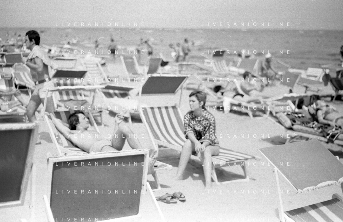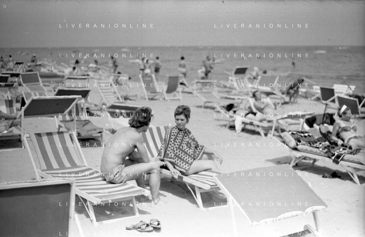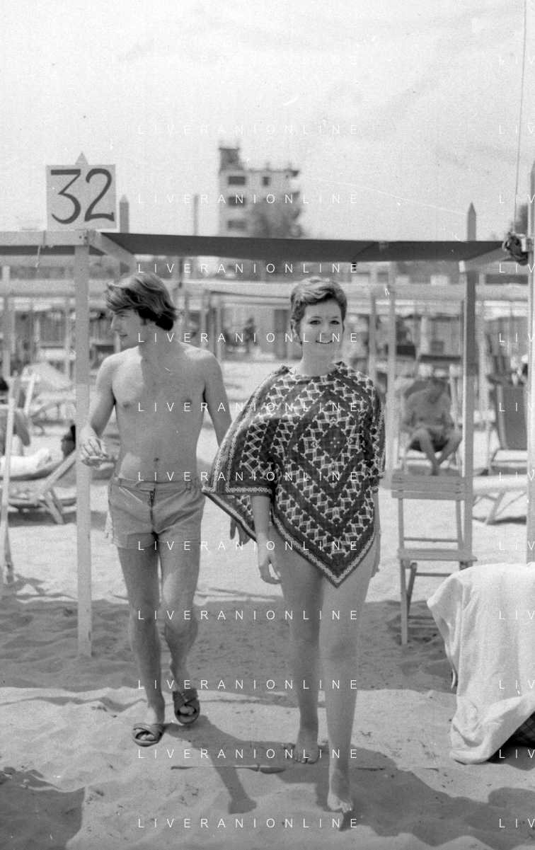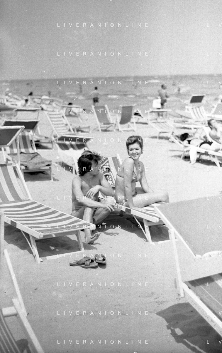 Neg- RETROSPETTIVA LORETTA GOGGI ATTRICE E CANTANTE NELLA FOTO CON L'ATTORE ALDO REGGIANI AL MARE SULLA SPIAGGIA DI RICCIONE NELL'ANNO 1969 AG ALDO LIVERANI SAS