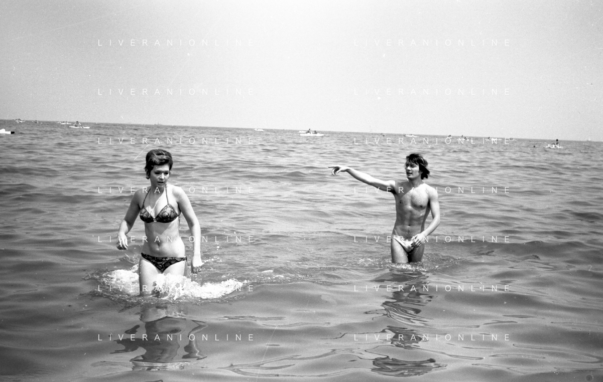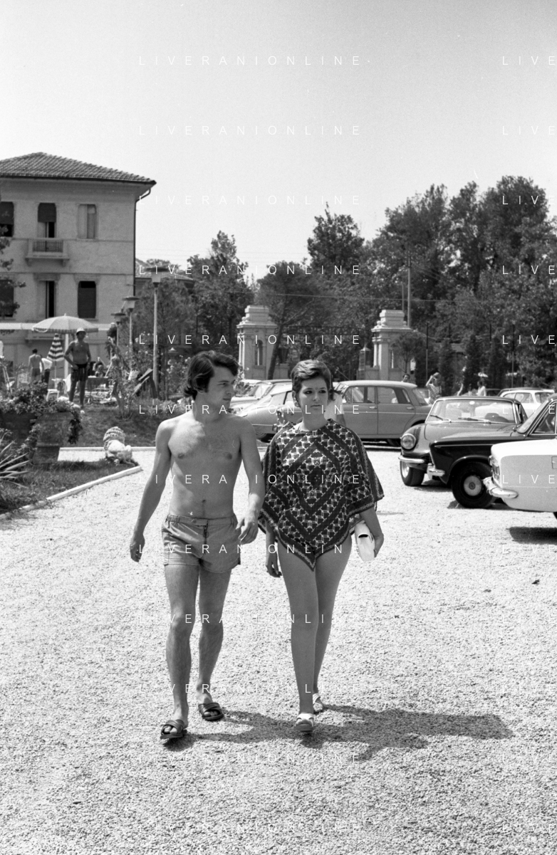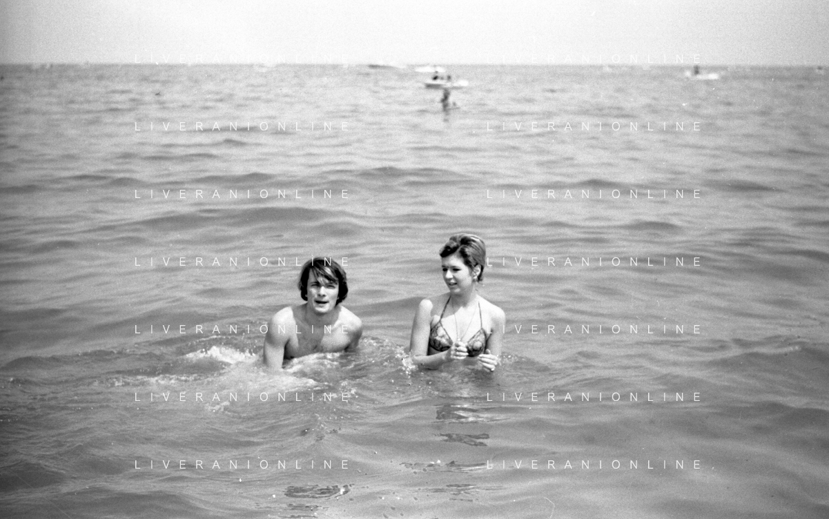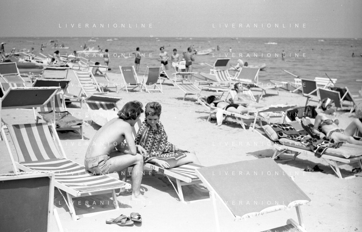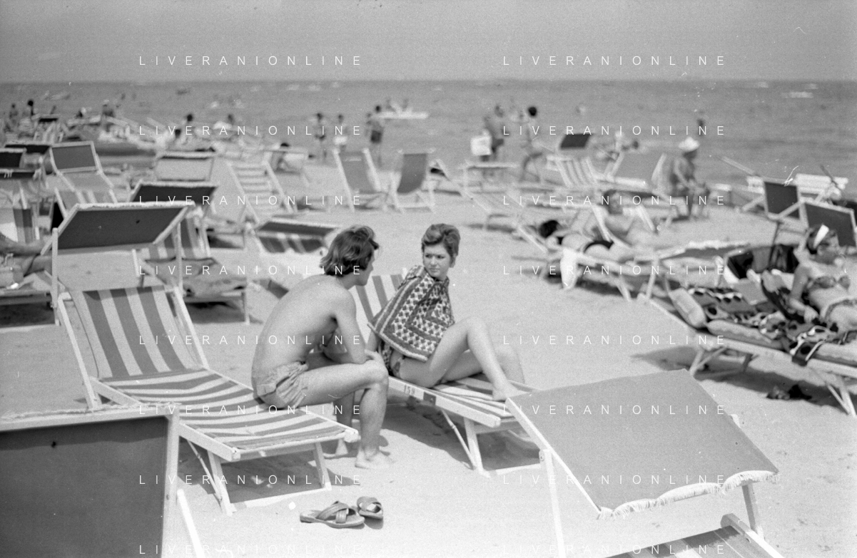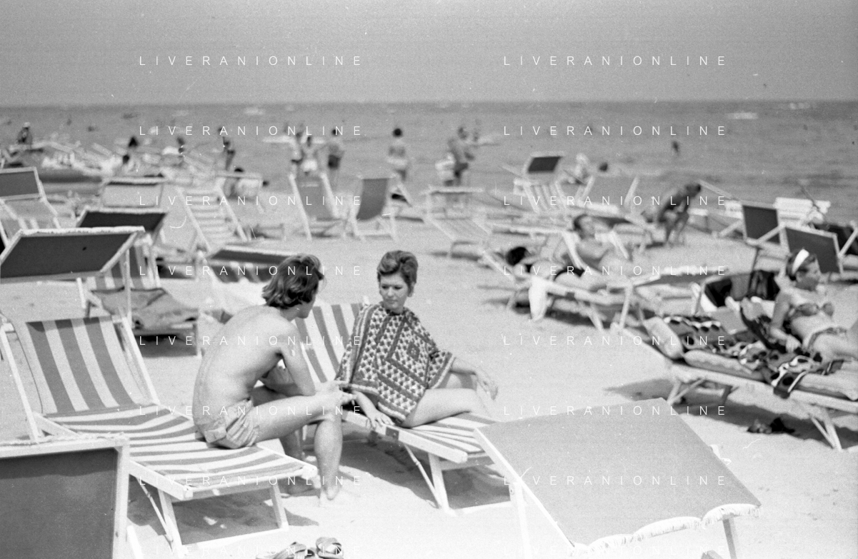 Neg- RETROSPETTIVA LORETTA GOGGI ATTRICE E CANTANTE NELLA FOTO CON L'ATTORE ALDO REGGIANI AL MARE SULLA SPIAGGIA DI RICCIONE NELL'ANNO 1969 AG ALDO LIVERANI SAS