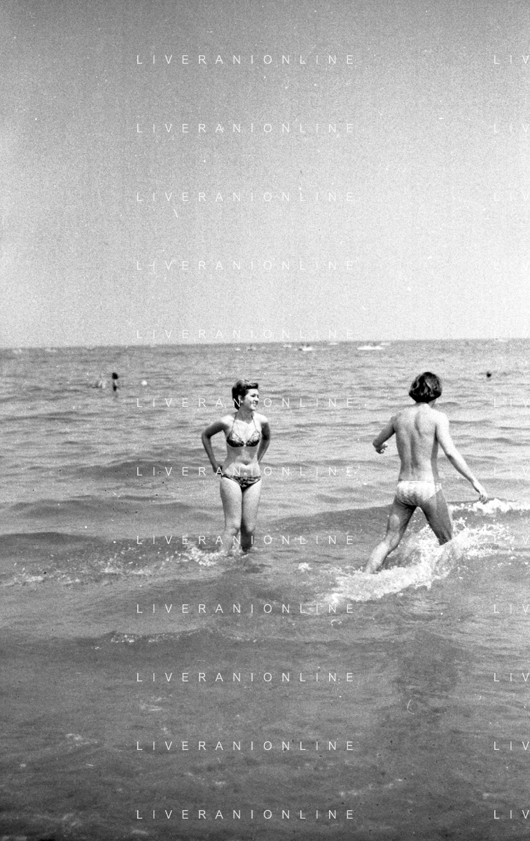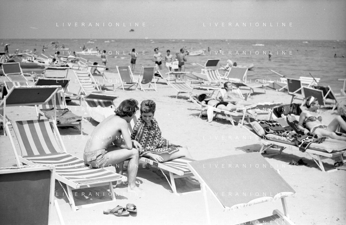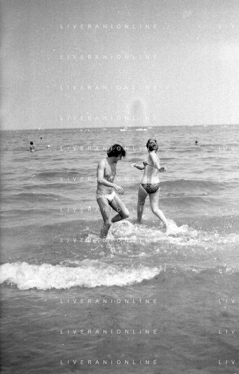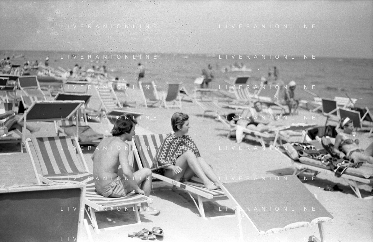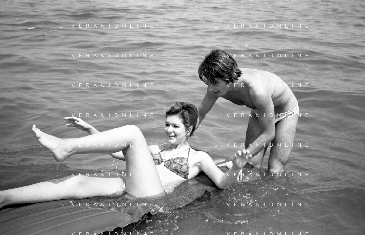 Neg- RETROSPETTIVA LORETTA GOGGI ATTRICE E CANTANTE NELLA FOTO CON L'ATTORE ALDO REGGIANI AL MARE SULLA SPIAGGIA DI RICCIONE NELL'ANNO 1969 AG ALDO LIVERANI SAS
