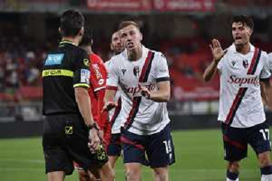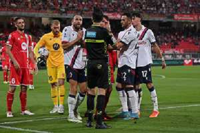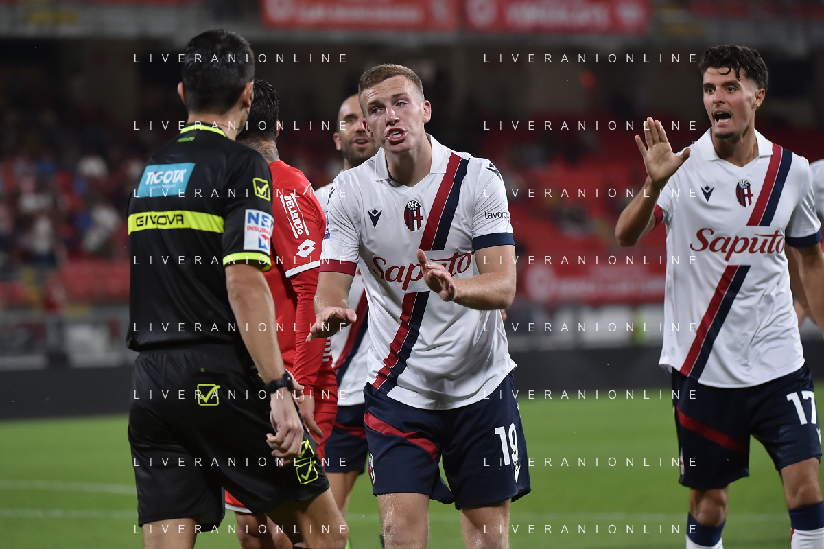 TVRG Monza vs Bologna nella foto proteste Bologna con l'arbitro Ivano Pezzuto di Lecce dopo il gol annullato a Lewis Ferguson (Bologna) Monza 28-09-2023 U-Power Stadium Campionato Serie A TIM - 6a giornata foto Roberto Garavaglia/ag. Aldo Liverani sas